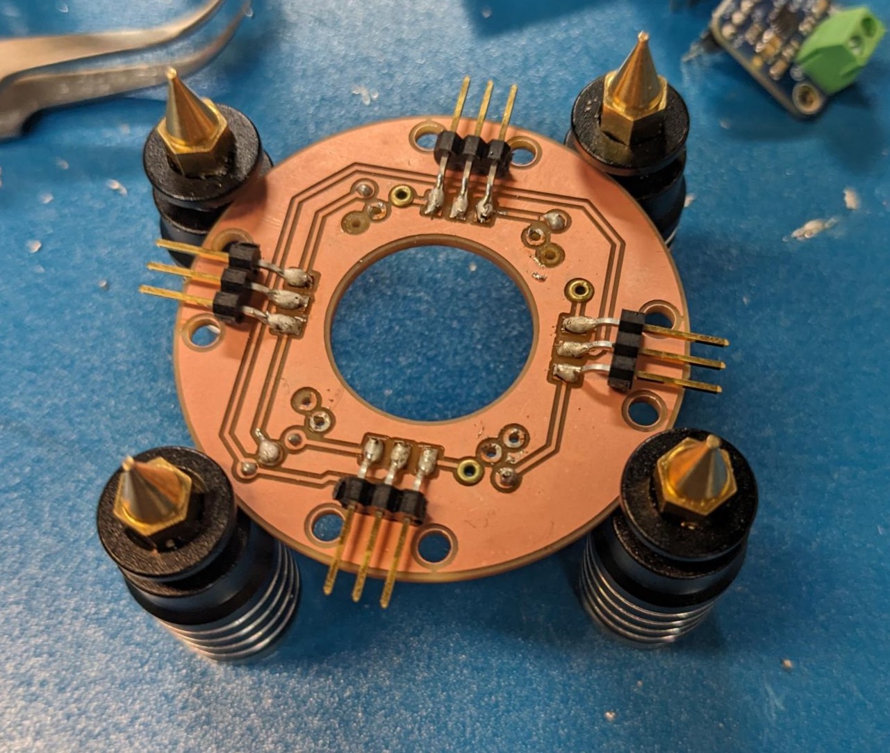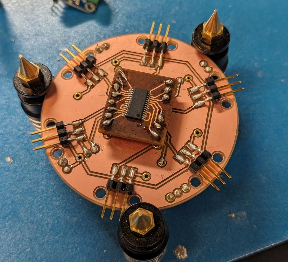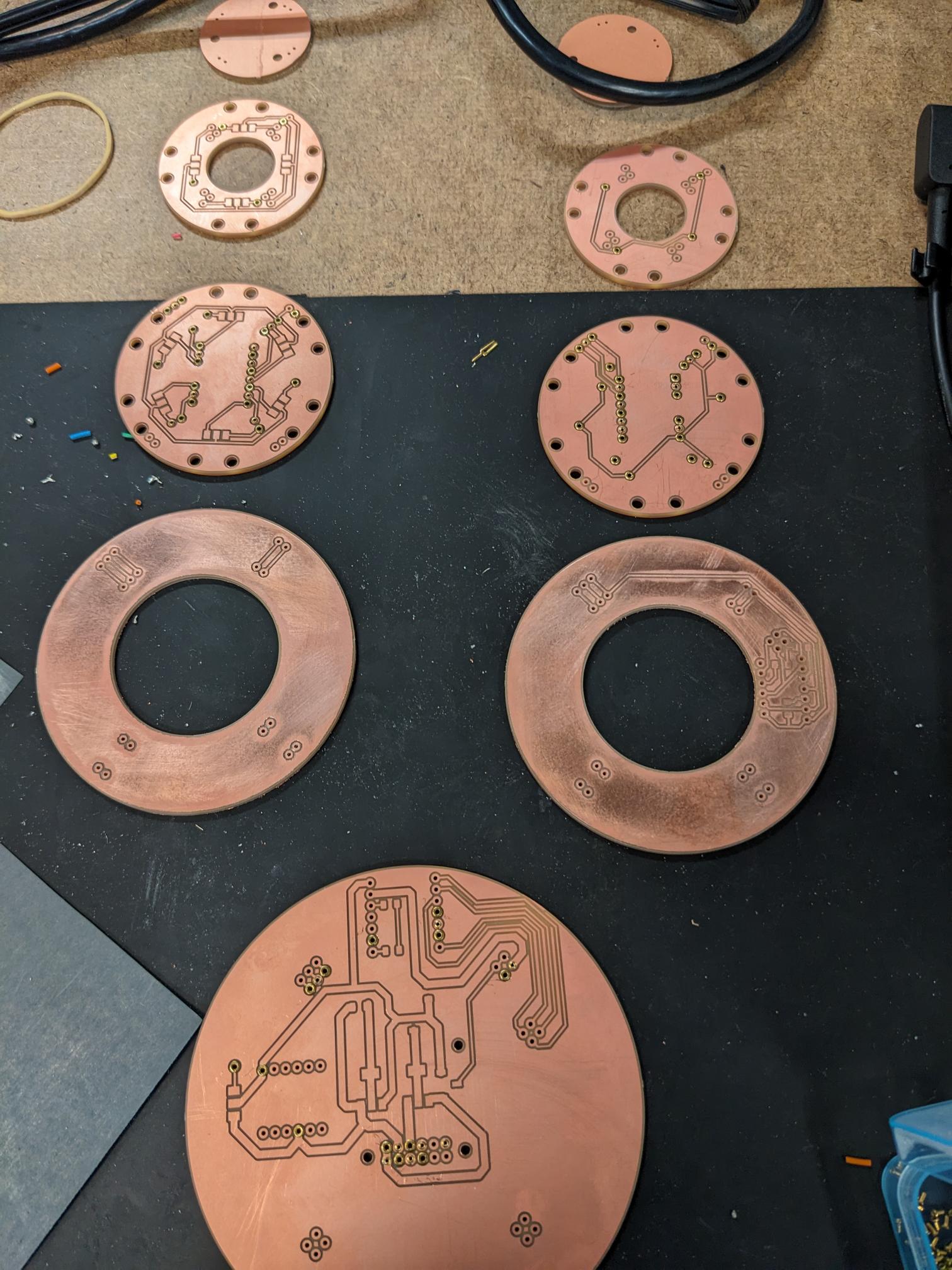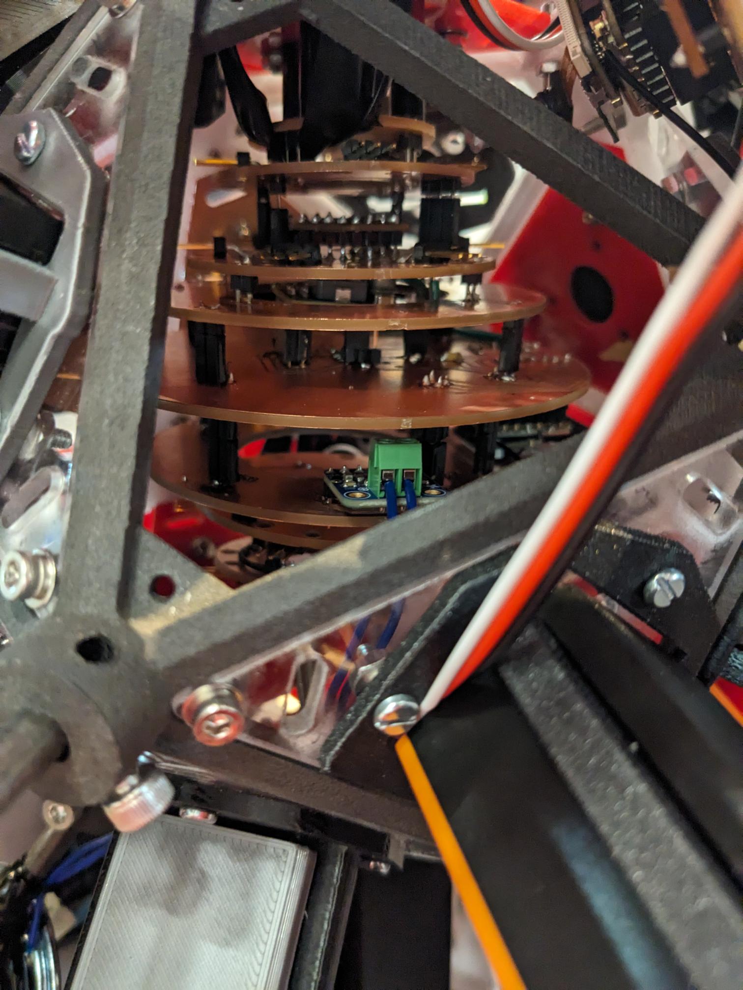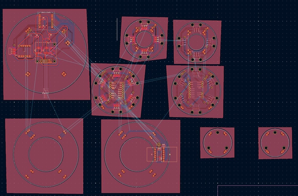 While I was making the PWM boards, Dimitar did a fantastic job of designing a complete V2 board that would be sufficient to run our minimum project requirements. At some point however, we talked about making a 3D PCB because it would be "more ball". So my next task was to take Dimitar's design and transform it into a multi-stack PCB, during which any bugs they encountered I would be able to adjust and account for. It did take a while, but I was able to create a schematic that successfully routed all components across multiple layers. The two smallest PCBs on the end of the stack also had the same mounting holes as the V2 board for simplicity.