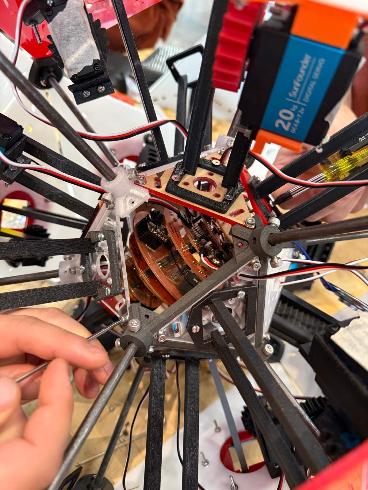 Unfortunately, that is where I called it a night as it was about 3am. The reason that is unfortunate is because during testing at some point the PCB started smoking. Dimitar, Ben, and I have talked about what we think went wrong, and we think we just burned through one of the main power traces. When we extended the servos, the rack and pinion was not rigid enough so the servo gear skipped. That meant the faces were not fully pushed out but the servo was fully rotated, so when the servo then went to retract, it retracted the faces enough for them to be fully seated but then continued to try and drive the servo further. I believe for this test there were three servos actuating at one time, so when they weren't moving and ramped up the current it was enough to fry one of the traces. That meant for our demo we did need to revert to the V2 board as a last minute fix, but we were still able to show the robot off to class which was good!