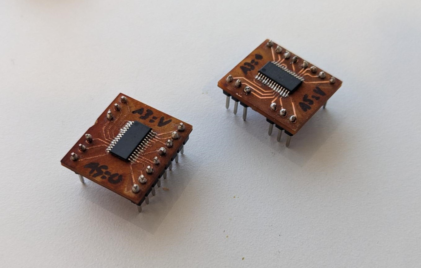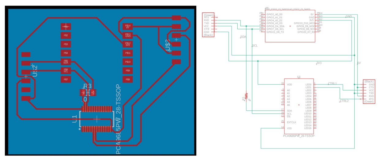 Following the creation of the V1 board, we determined it would be easiest if we made our own little breakout boards for the MUX PWM servo drivers. I took on that responsibility and designed a small little PCB to cut on the XTool F1 laser cutter. One of the requirements we had was a way to set the addresses to make sure that the two driver chips were not on the same communication line. In hindsight, I should have probably used 0Ohm resistors to jump VDD to the desired address pins, but instead I just connected all address pins to VDD and GND (which made the schematic a bit weird) and then cut them manually after the boards were made. Agai n I should have just used resistors, but this did work exactly as intended! On a brief side note, I found that in order to get the pattern on the laser cutter control software to align with the image, it needs to be shifted .6mm to the left and .3mm up (6 left arrow taps and 3 up arrow taps). This is for the center of the bed, it shifts slightly on the outer extremities.