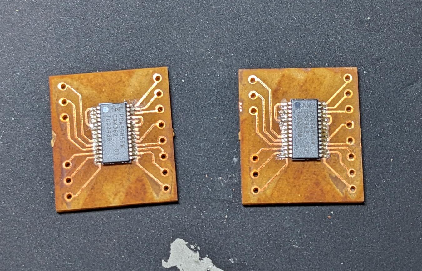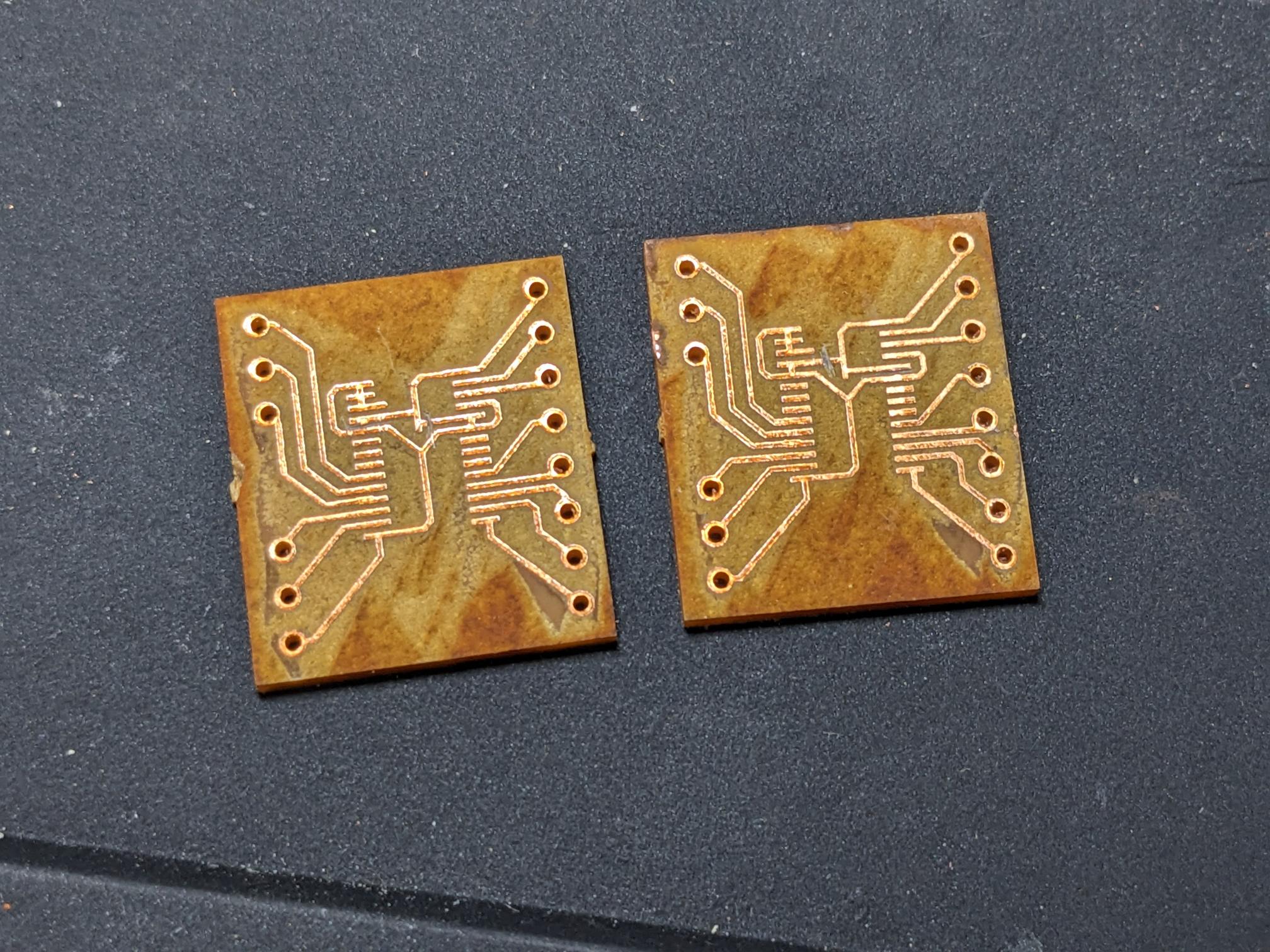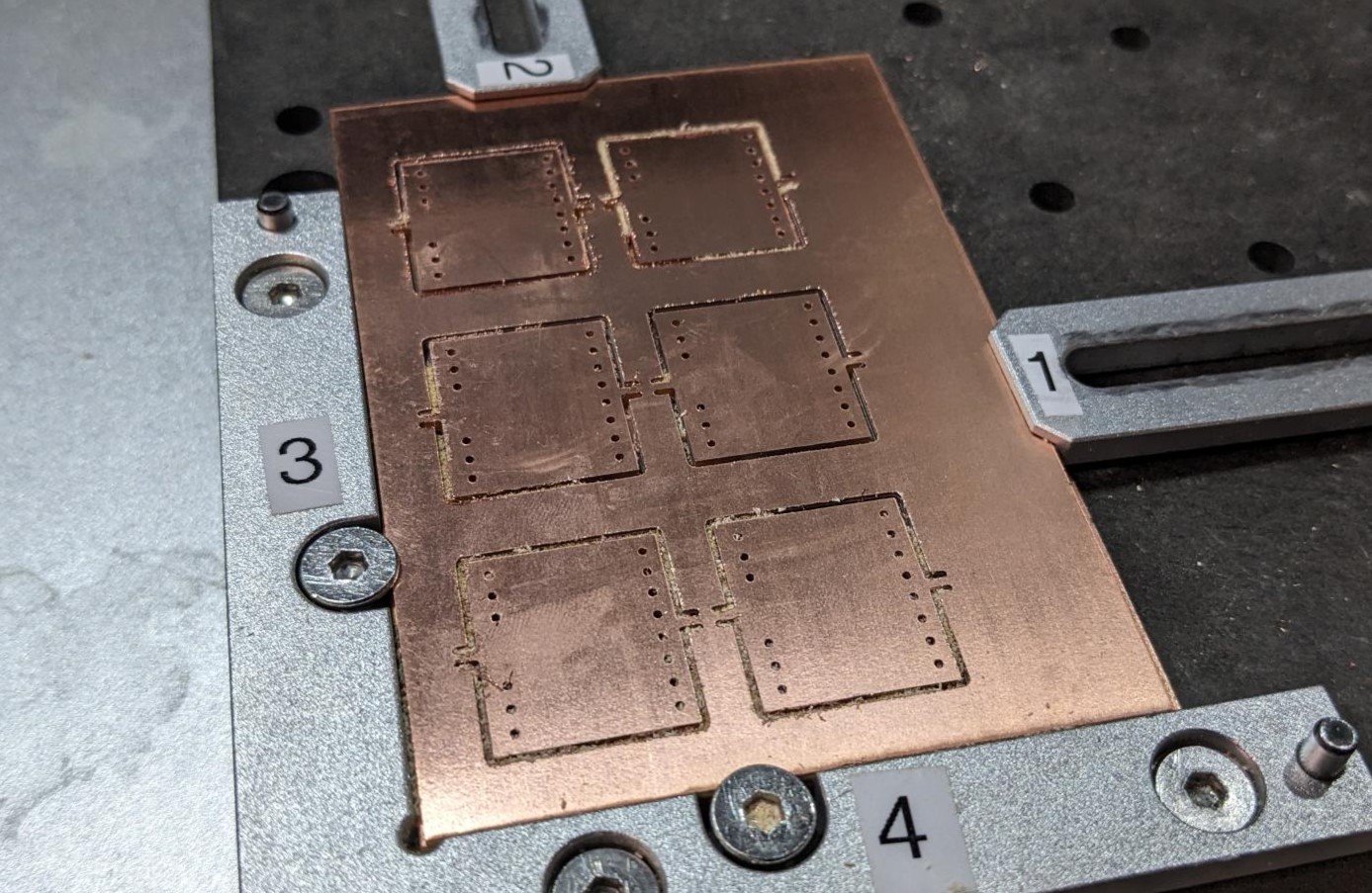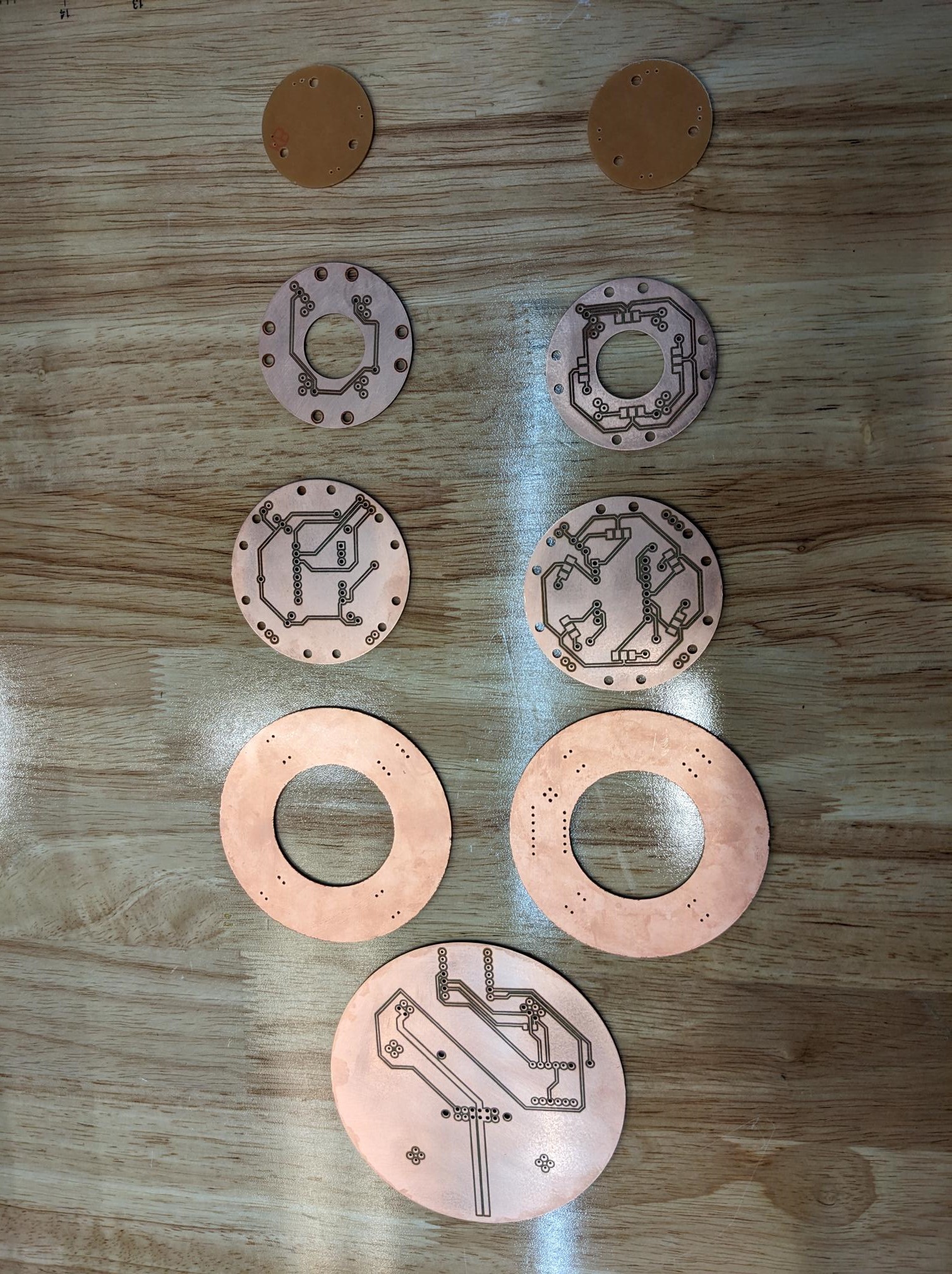 I found it much easier to work in one document where I could see the trace names of the different boards, so to cut and manufacture the boards I had to save the gerber files from a new document. Once I did though, I cut all the front layers of each PCB on the Carvera and then did the backside on the XTool F1 now that I had figured out the alignments. Laser cutting some of the bigger boards did take a while, but overall they worked very well! The front of the boards is on the left and the back is on the right.
