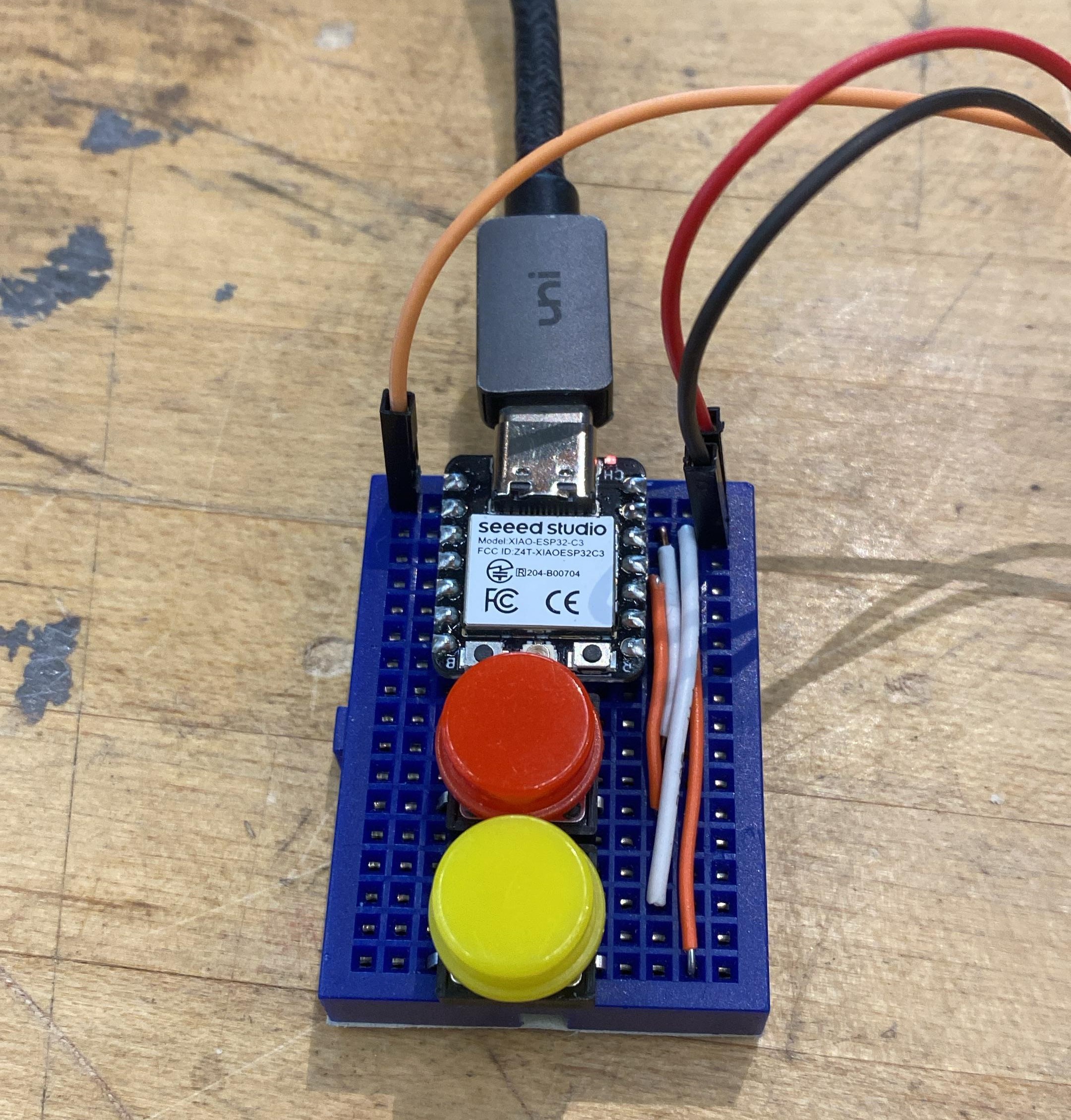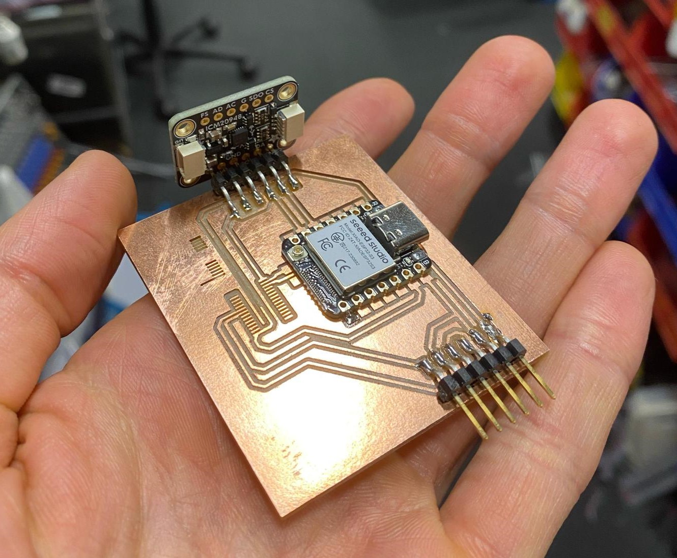 When we were intiially brainstorming/developing our idea, I signed up for the electronics team because that is where I felt my skills would be most impactful. As our section started to hone in on the project that would eventually become the Neilbot, we were able to get a better idea of what would be required to operate our machine. As the electronics team, that meant we were tasked with picking out all the components necessary for operating the 20 servo motors, integrating battery power, sensing our position/orientation, and adding a microphone for playing sounds. Some of these components were very easy to determine, we had breakout IMU and speaker driver boards in our class inventory, so we planned on using those. For battery power, there was a regulator breakout board that came with the batteries that we were able to pick regulators based on. And finally, Dimitar found PWM driver chips that take I2C inputs and can operate up to 16 PWM signals out which are perfect for easily controlling our servos.Right off the bat, we wanted to try to get some parts into the hands of the software team so they could start to figure out the servo and IMU interfaces. Dimitar put together a breadboard or two while Ben and I designed and cut an initial PCB. This PCB had a XIAO board, the IMU breakout, and the PWM driver chip connected to two servo pins. Ben had to modify the cutting parameters in order to get the PWM chip's traces to resolve properly due to the package type, but we were able to successfully produce a board and deliver it to the software team. While Ben was soldering the components for the V1 board, I also put together a small breadboard with buttons for the mechanical team to test the actuation of the servo. Surprisingly, they ended up using this pretty late into the project for the various mechanisms they designed.