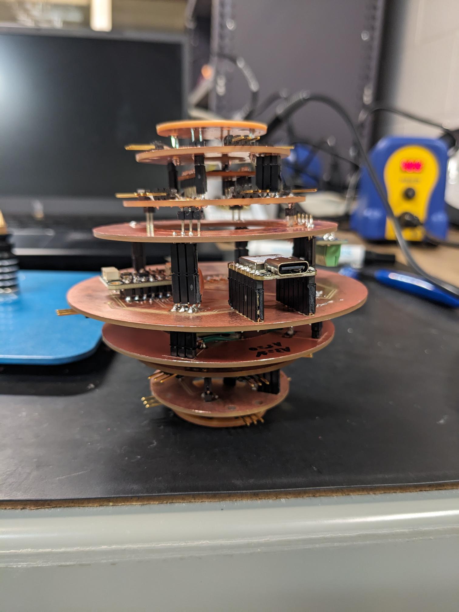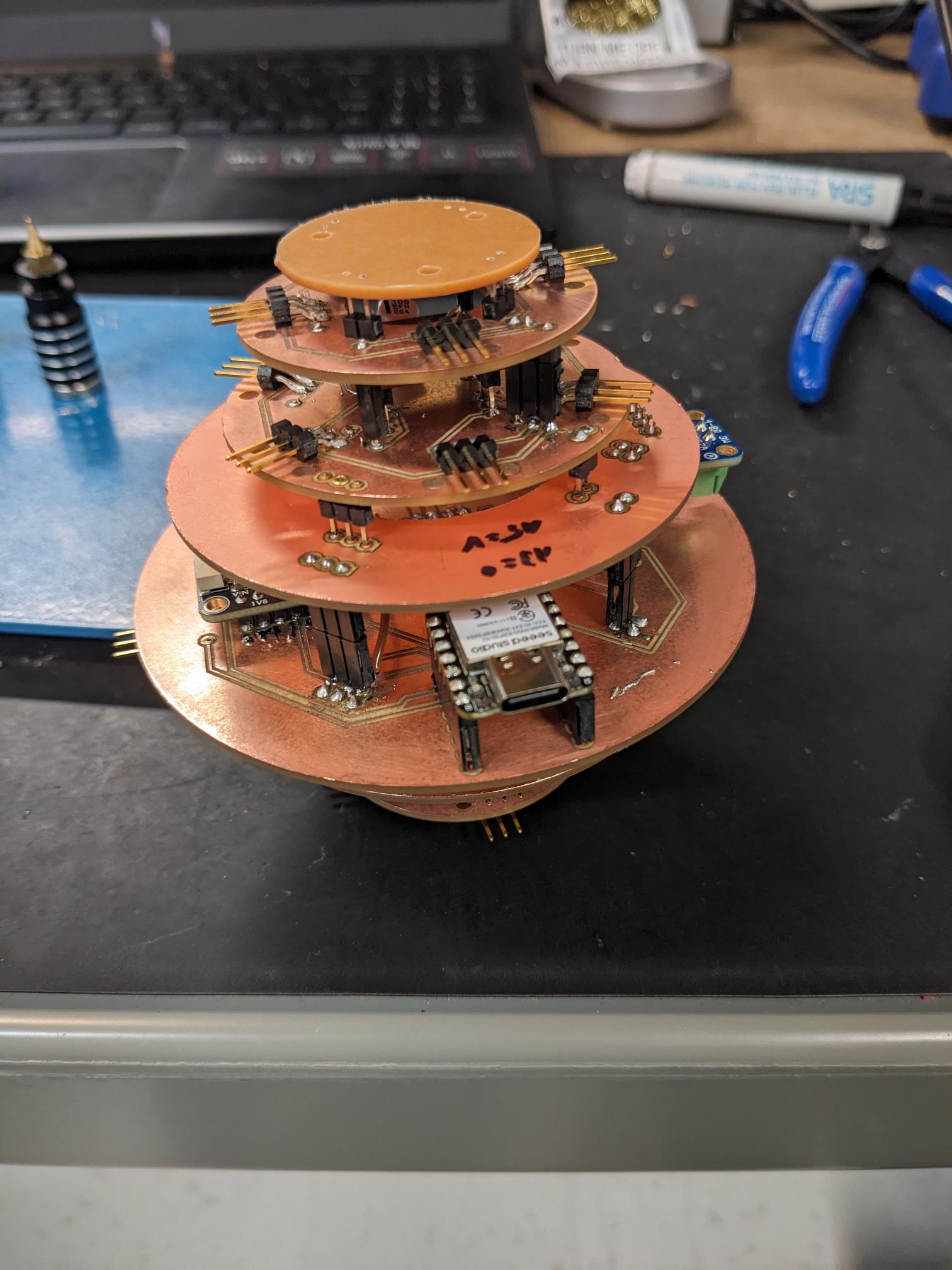 It still took me a few hours to do all of them, and when I stacked them up they were almost perfect. I had to go back and touch up a few pads that did not get connected through the rivet, I needed to increase the spacing since the power board was a lot taller than we were anticipating, and I ended up jumping one of the PWM chip's I2C lines because I could not figure out where the disconnect was. And while I ended up doing this much later in the process, we also made the decision to switch the IMU off of 5V to the 3.3V coming off the XIAO, so I manually cut the power traces to it and used a jumper wire. That being said, the board stack looked insane and really cool at the same time. It is definitely a bit more janky than I would like it to be, but we were also creating a multi-stack PCB out of double sided PCBs which is a challenge in its own right.