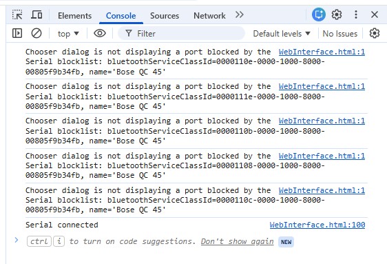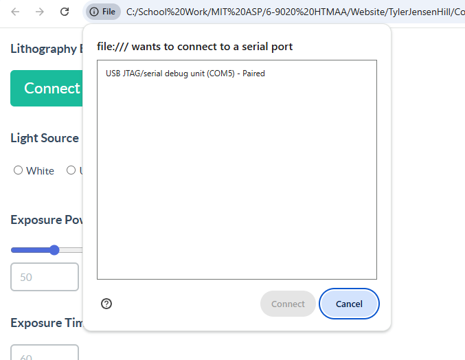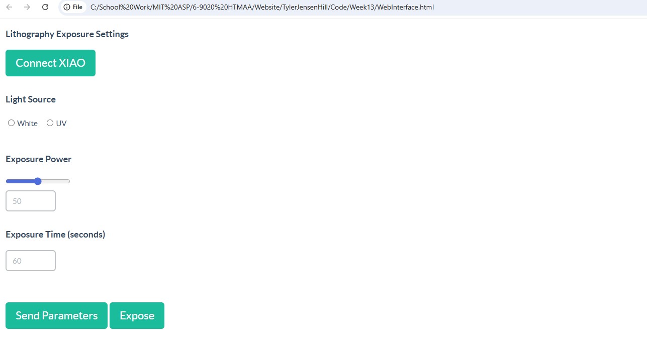 I used this week's assignment to continue to make progress on my final project, specifically with controlling the TFT module I had been using over the previous weeks. I have still not gotten into the lab due to the holidays, so I have not yet been able to try a different TFT module to see if that fixes the touchscreen. But after this week, I may not even need to go that route. Instead of having the user touch the screen to select the lithography parameters, I figured that if I was able to get a UI working for this assignment then that would be how the variables get set. All I would need to do is make a simple website, get it to connect to the XIAO, and send data to the XIAO based on the parameter/buttons that get clicked.I started by browsing through the options listed on the HTMAA site and reading a little bit about what each was able to do. I settled on using the WebSerial interface to communicate to the XIAO serial port from a (local or hosted) website, along with the Flat UI styling package for the interface options. I largely used the WebSerial homepage and an example I found on github to guide my implementation of the tool. I had never worked with JavaScript before, so it took me a moment to get comfortable with setting up the functions/hooks needed for the site to work. Luckily the code to get the serial port open and communicating was super simple. I was able to get the XIAO board connected very quickly and I could read out the messages being sent to the serial monitor in the Arduino code.