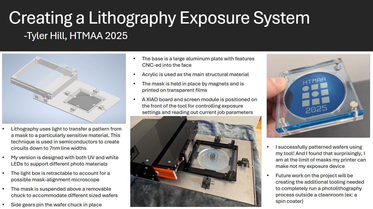 I made nearly all of the components that went into my final project. I designed all of the structural acrylic/metal components, all of the 3D printed parts (both on the MK4S and Fuse 1+ SLS), and all of the electronics boards that controlled my system. I also designed all of my testing files such as the GDS files that then became the masks printed on transparency film.