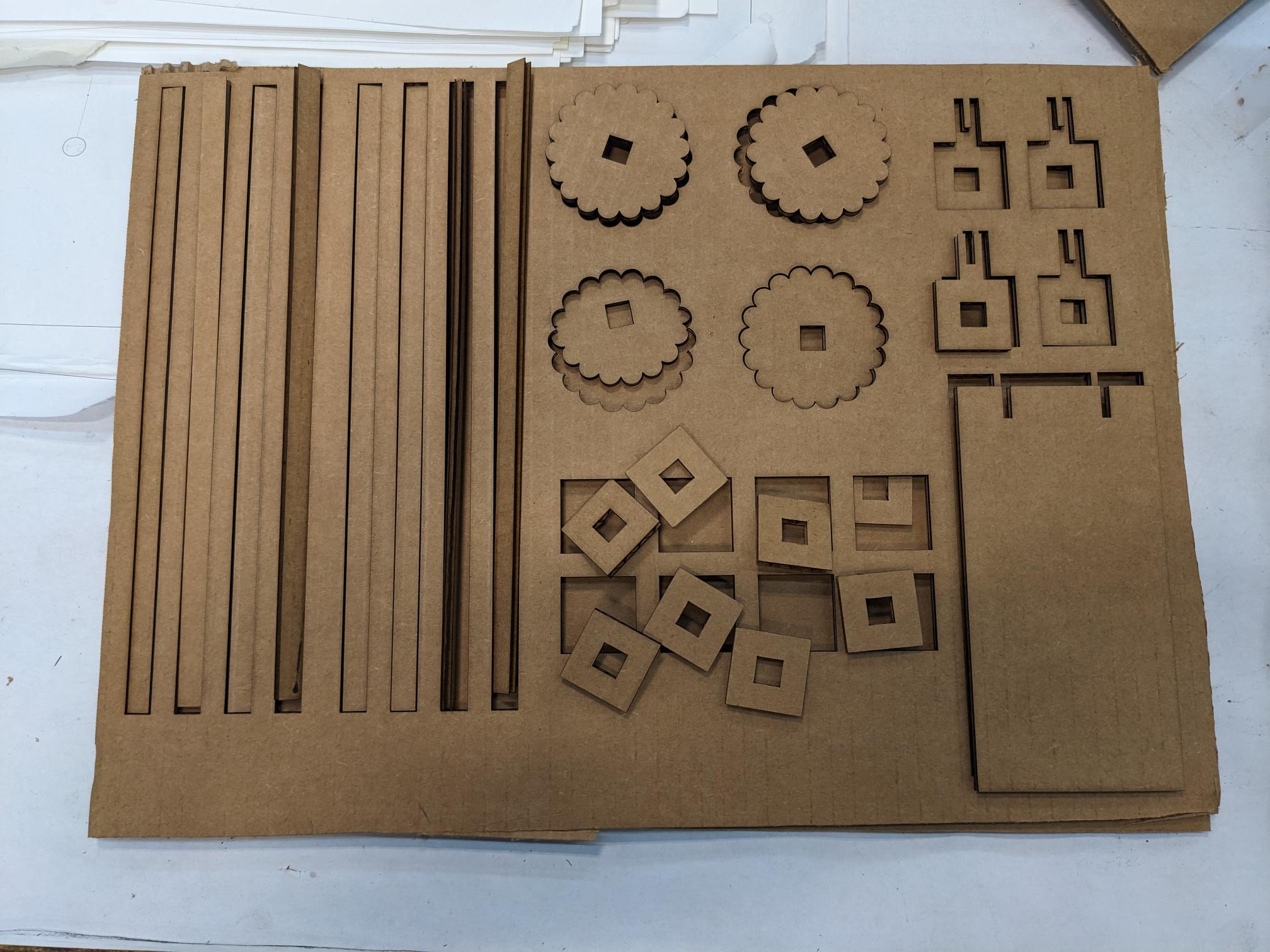 In order to properly design our parametric assembly kit, we need to measure the laser kerf and how that affects joints. This was done by making 'combs' or squares that had varying slit widths which could be used to find the proper dimensions needed for joints. Our section determined that there was about a .1mm kerf, and the ideal parameters for the XTool were 87% power and 37% speed. We accounted for the kerf in the laser settings and the cuts came out nice and clean (big thanks to Ceci for doing the first pass!).