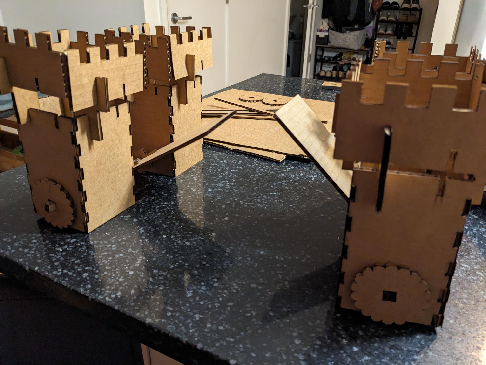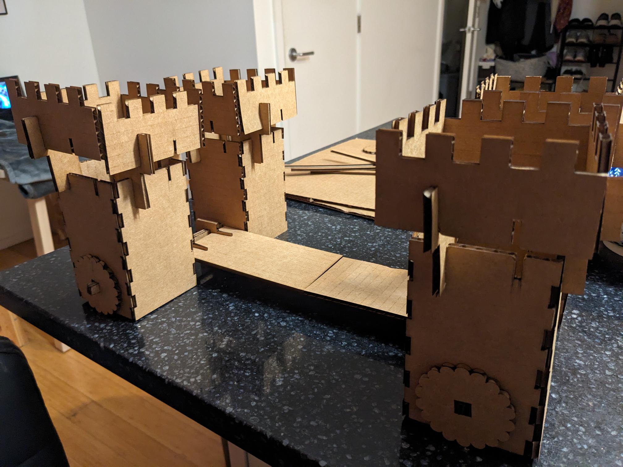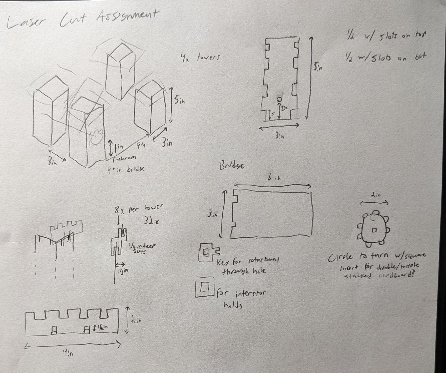 When it comes to actually designing an assembly kit, I came up with the idea to make a bridge that would have the capability of actually raising the bridge portion. The design was simple enough, with 4 columns that would have holes to slot a few pieces of stacked cardboard to act as the axle. There would be a gear to turn to actually raise the bridge, a few simple squares to keep the cardboard axle together, and a joint piece with a square hole to connect the axle to the bridge piece. To make the design a bit more aesthetic I also added a few castle rampart-like pieces to accent the top of the columns. The images below show my initial sketches as well as the sketch I created in CAD before exporting it to a dxf for laser cutting. Ultimately, the idea was executed moderately well but there are a couple of learning points to mention. The most relevant to the general HTMAA population is that I could have designed the corner joints a bit better. Some pieces of cardboard were not perfectly flat which created a bit of bowing that did not let all the corner joints seat well (and they were already thin as it was). In the future it would be much better design wise to have a locking joint of some kind for high aspect ratio parts to prevent bowing from becoming an issue. It would also add to the structural rigidity since my assembled columns/towers were a bit flimsy. Second, and this is something that more so bugs me, the turning of the gear/raising of the bridge is not perfectly smooth. It is a bit sticky but still manageable for now. This likely came down to tolerances/clearance of the circle I cut into the towers for the axle to thread through. But sadly, my biggest goof was that I did not count the right amount of standoffs for the ramparts. I counted in my head that I needed 4 per tower, CADed the correct amount, but when I parsed the CAD file into the individual laser cuts I missed a bunch. Like a lot a bunch... make sure you count the parts you need vs the parts you have! Luckily I was able to get by with a single support holding up the ramparts, but it would have been better if I cut the correct amount.