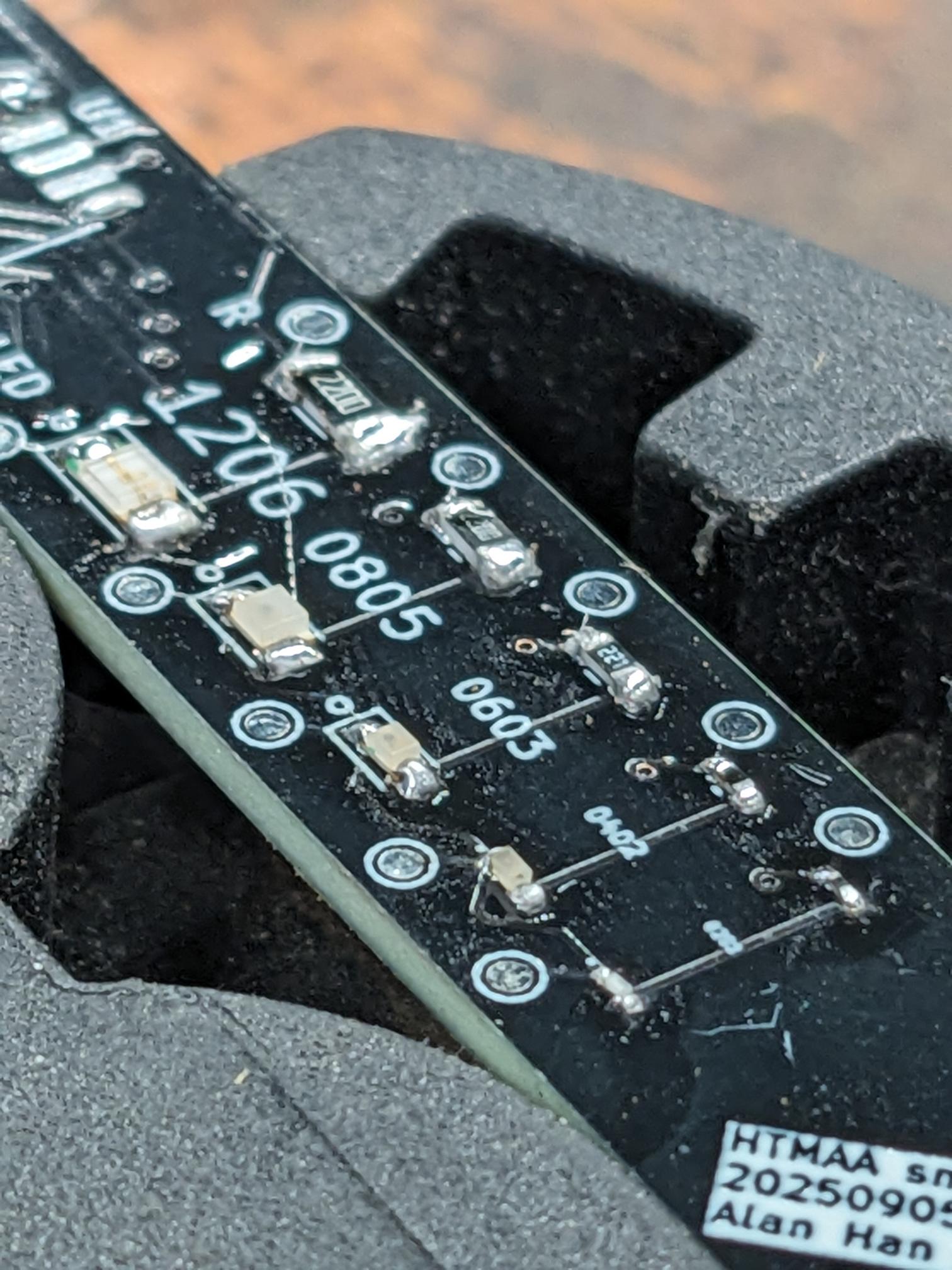 I didn't have enough time to work on the challenge board during the lab session, but I still wanted to give it a shot because I had some basic equipment at my apartment. The challenge board was hard because the components started at a larger form factor (1206s) but scaled all the way down to super tiny LEDs and resistors (0201s). I didn't have a microscope to assist with the smallest sizes, but I did have loops and moral support from Raven so I think I was able to do really well. Sadly, there were not microcontrollers available for this during the lab session so I am unable to actually test my board at the moment, but I feel like I put together a good attempt at doing this challenge board by hand.