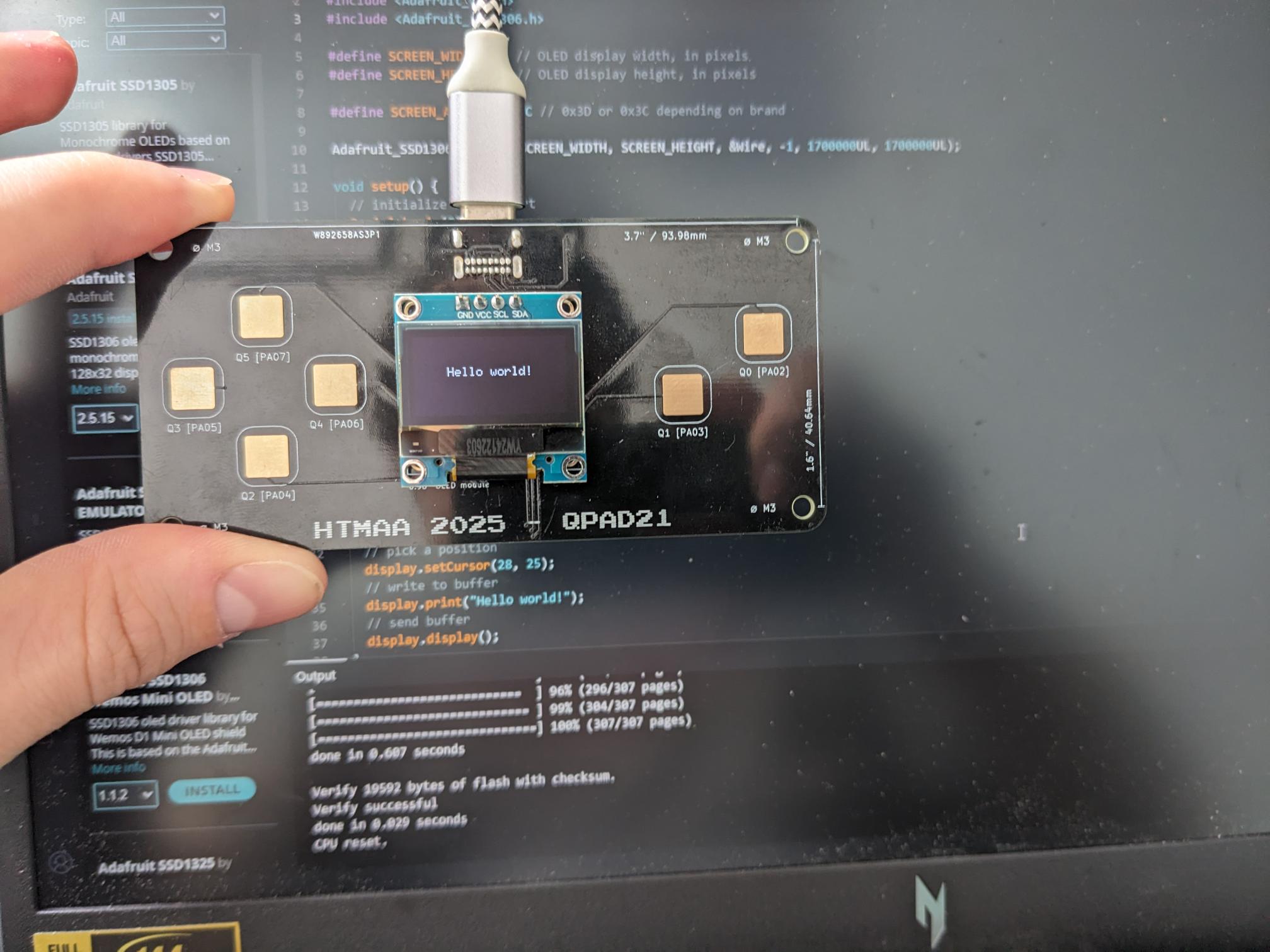 Once the main board was completed, I uploaded the bootloader and set up my IDE. These steps were covered in the above section discussing microcontroller workflows. I was able to successfully run all the test code provided by Quentin, and a video of the button responses is seen at the end of this section. While this sketch did demonstrate taking input into the microcontroller and communicating those inputs back to a monitor/plotter, to satisfy the assignment I decided to modify the examples and create a sketch sketch. I tied the d-pad buttons to the display coordinate system to allow the user to move the current location of the cursor. I then used the Q0 and Q1 to act as placement and removal of pixels by either drawing the pixel in white or in black. I did have to guess and check the movement directions since the orientation of the screen is not matched to what the user would anticipate based on how they would hold the board, but that was a very simple fix. The code I used is linked below the videos!
