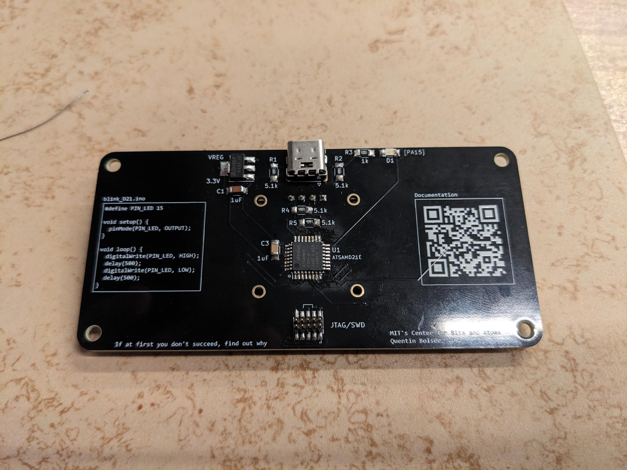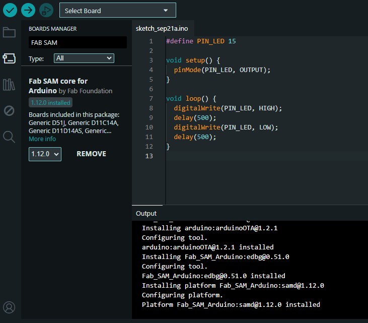During the lecture portion of class, we talked about a couple of different microcontrollers we would have access to. We primarily talked about the RP2040 and SAMDs, but ESPs and ATtinys are also listed in the course material. Most of the microcontrollers I worked with previously had Arduino boards, which as we learned can mean a lot of different things depending on the context. In my case, my Arduino experience refers to completed boards (like the uno and nano), the coding language, and the IDE. Because of this familiarity this is the toolchain I used for these assignments. I was not present at the discussion, but Ben, Jaqueline, and Matti put together a great document on our sections site discussing their experience (big thanks!). I added some notes of my own in another pdf and hopefully more will be added over time. Their group had a broader range of experience than myself, but it seems like there was similar sentiment around Arduino. It's very easy to use and welcoming to beginners, which is the main attraction of the platform. Branching out more, the teensy microcontroller had some issues with timing when running through Micropython, and the ESP32 is trickier to set up and get running in the first place. That being said, Python is a very easy language to use, more so than C++/Arduino code in my opinion. Depending on the amount of effort a user is willing to put in to get up and running there is no reason that a more setup-intensive platform couldn't be used if that is the preferred method to work with.Back to my workflow. The first step was to configure the IDE to be able to find the microcontroller. In the lab section I made a board using the SAMD21, so that determined the architecture I was working with. Quentin put together a great guide with examples and tutorials here, and he also helped me during the lab session to upload the bootloader. That meant I only had to set up my IDE and begin uploading code. Below is a screenshot of the SAMD core installation and the board with the "Hello World" sketch uploaded to it.