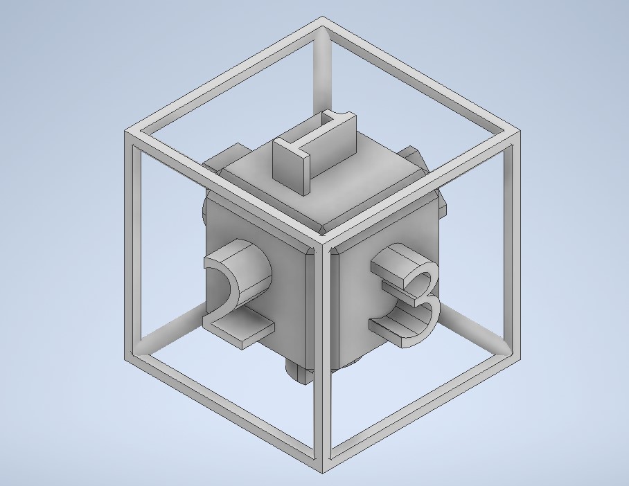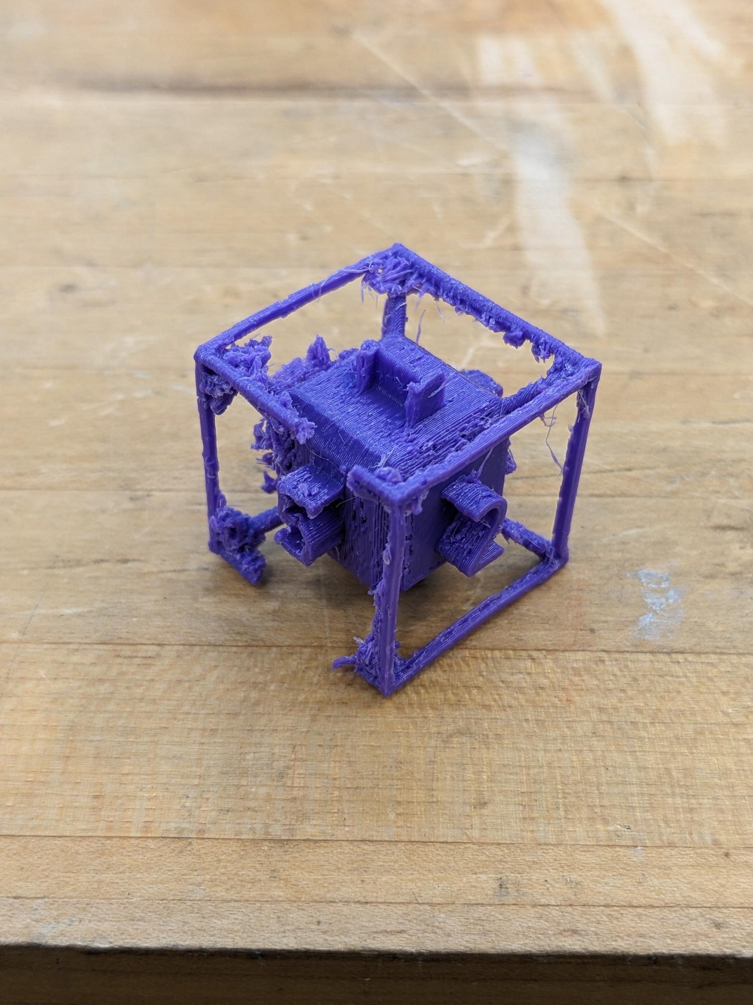 The print ultimately came out just okay. The supports were very difficult to remove, and the more of the supports I removed the easier it was to break the outer frame of the die. The print orientation also made quite a difference, with the bottom face of the die not printing very well at all, and any limbs of the outer frame that were printed in the vertical direction from the build plate tended to break much more easily. This is due to the fact that breaking these just had to separate the printed layers as opposed to breaking through a printed line. If I were to print this again, making the outer frame pieces larger would be very helpful. Whether that means scaling the entire part or just editing the outer frame, both would be viable options.
