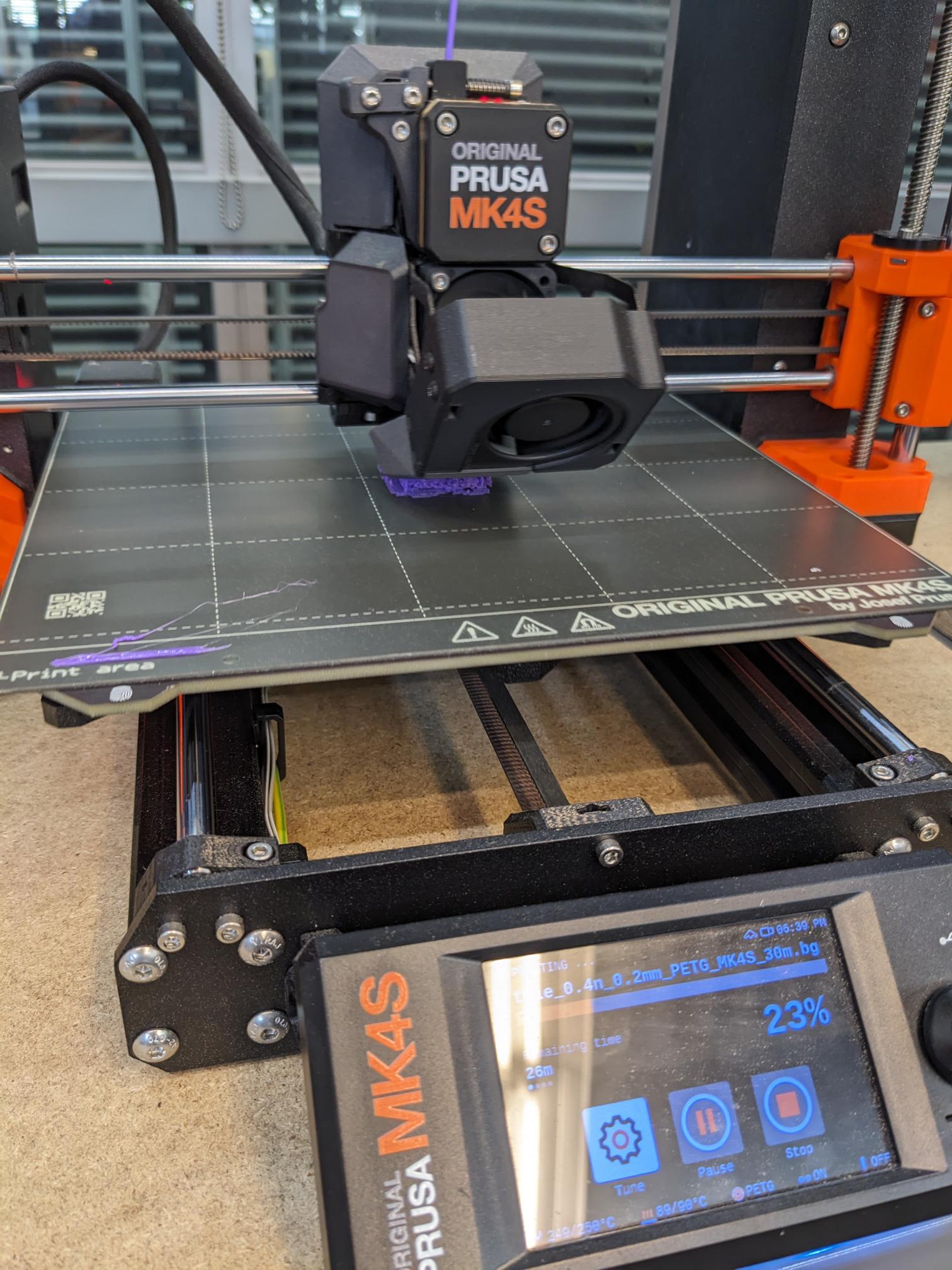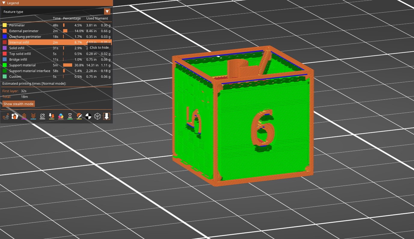 The wording of the assignment for 3D printing is that we should print something that cannot be made through subtractive manufacturing. It took me a moment to think of something that would be challenging for something like CNC to make, and I landed on the idea of making a tesseract like shape. I then realized I could take it a step further and make it into a die. I probably didn't do the CAD the best way possible due to the complexities of angled extrusions that would then meet an external frame, and now that I am writing this I may have been able to make it easier as an assembly as opposed to a single part, but the resulting part is as seen below.Most of the printers in the CBA show are Prusa printers, so I loaded the die into the Prusa slicer software and went through the same setup steps. I used the same filament type, PETG, and print settings to follow the design rules as much as possible. I enabled supports and sliced the part, which can also be seen below.