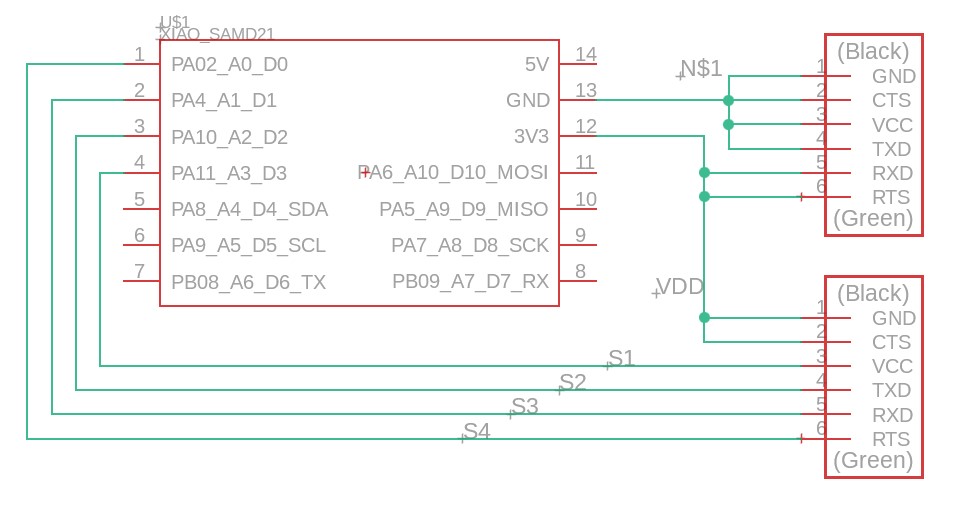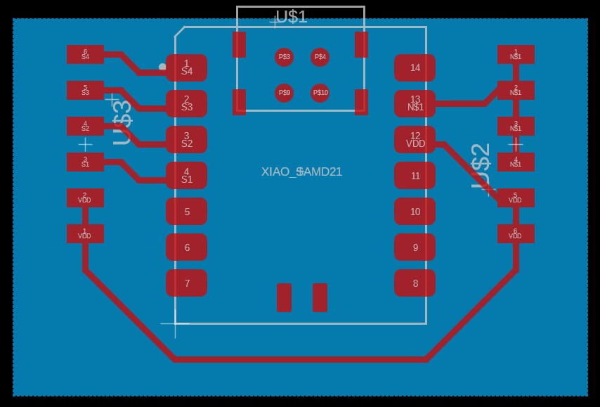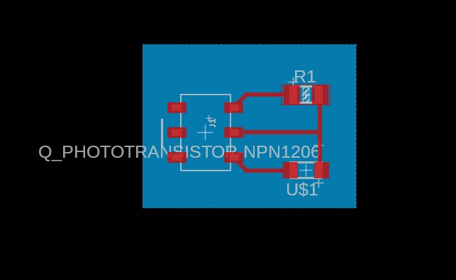 I have somewhat learned my lesson with the surface mount microcontrollers and the difficulty in programming them, so this week I really wanted to make sure I designed something that used the XIAO for simplicity. I also wanted to use phototransistors because there may be potential applications to use them in my final project as I am making an exposure tool. The idea I came up with was to do a sort of distributed light sensor setup, which could theoretically be expanded to help me measure the exposure dose of my project at a further point. There will be a central XIAO board that I will connect to and program, with a number (in this case 4) of separate phototransistor boards that can be arranged as needed and connected with wires. The schematics are very simple as I just need to provide each phototransistor with power, ground, and a single analog read pin. The schematics have dummy components in them so that I can have the pin spacing needed for the horizontal female connectors I planned on using. I know I could have just drawn the pads that I needed and measured the spacing, but I found this to be easier. Also, these boards are both one sided but I chose to use the GND plane as the footprint image when milling out my board. Both boards are below with the XIAO board first followed by the phototransistor board.