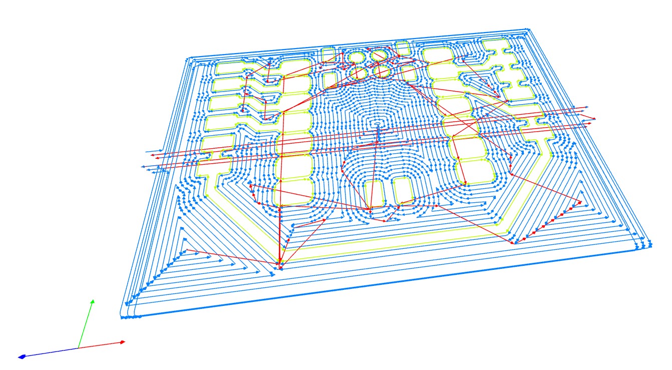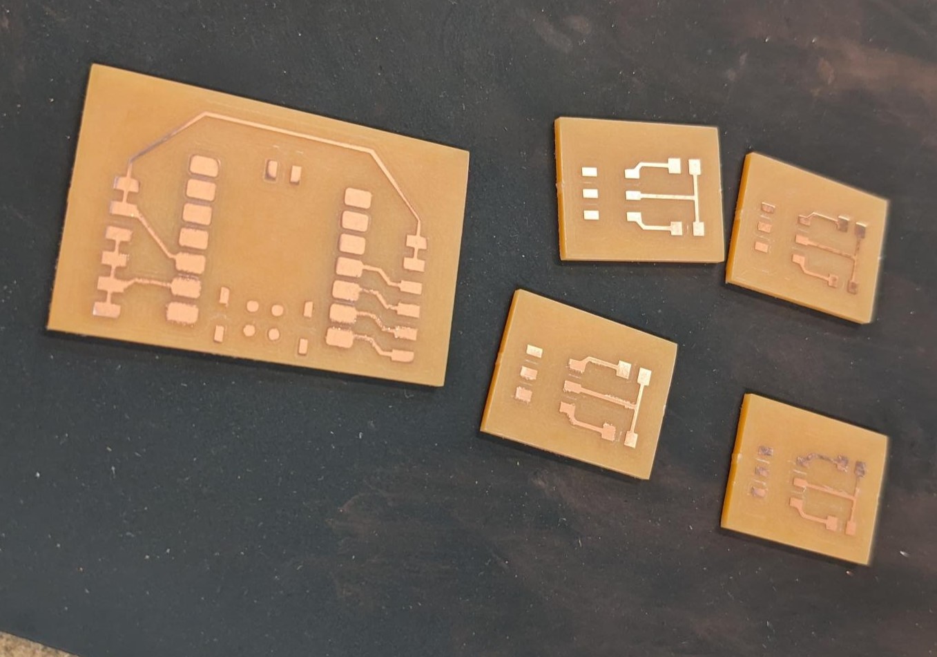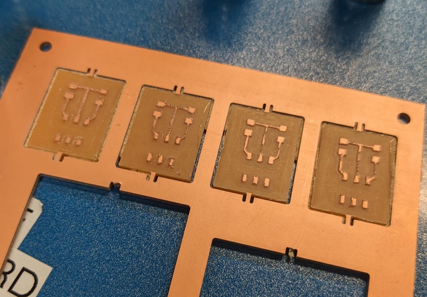 I then used the gerb2img and mods as we had done previously to set up the cut job for the Carvera. The only difference this time was that I chose to use the Carvera flow that cuts out all of the copper and just left the traces/pads behind because I wanted to see how the boards turn out. Since these boards were so small I was okay with the time add. No one was waiting for the Carvera while I was on it, so I did 4x phototransistor boards at about 9min each and the XIAO board at maybe 11-12min. In my opinion, this cut style is completely worth it as the PCBs look much cleaner than the previous ones I had milled.