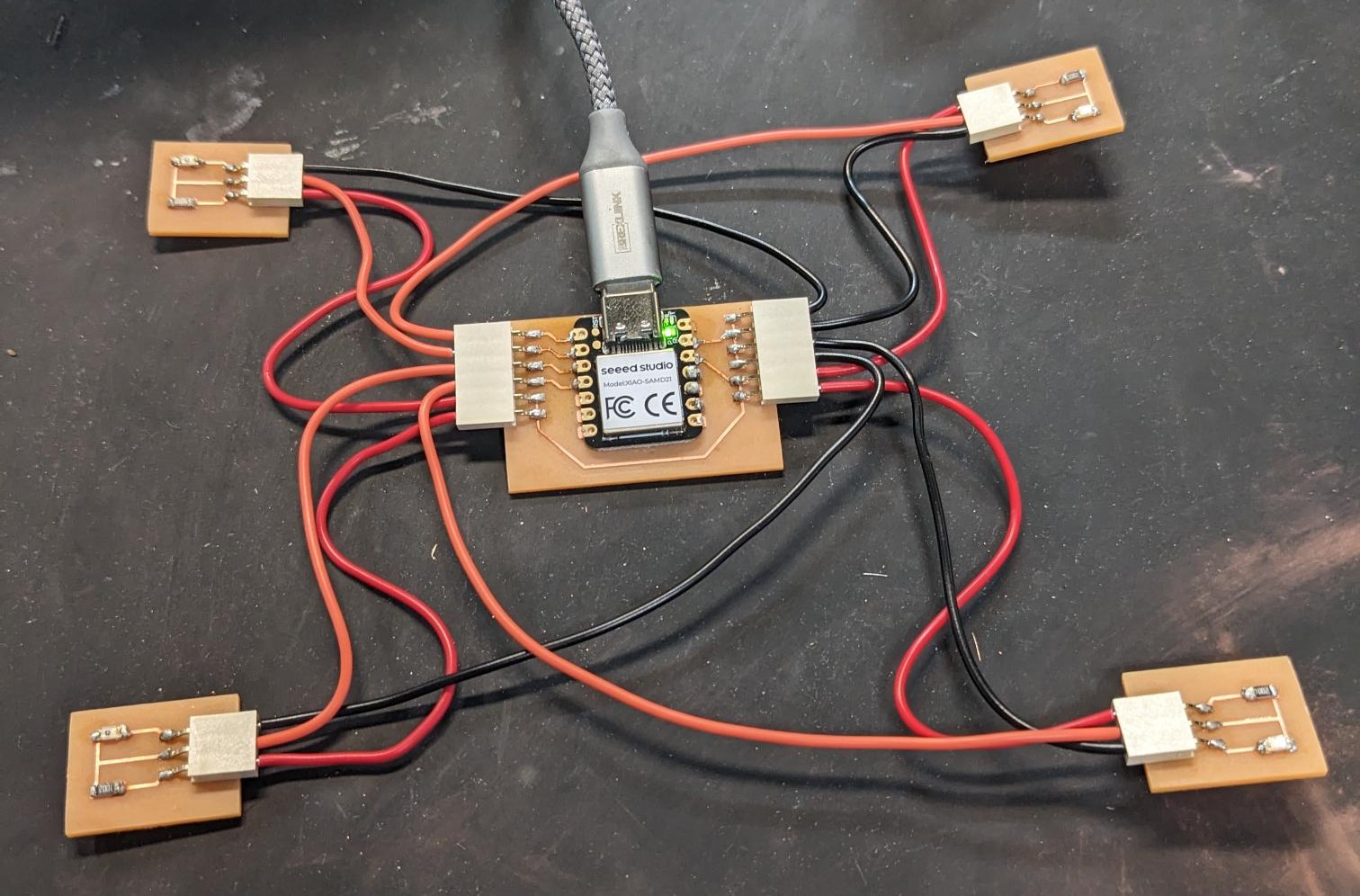 After sanding the traces down to remove the residual copper, I soldered the boards with visible light phototransistors, 10kOhm resistors on the photo boards, and female horizontal pin headers. I did have one snafu where I wasn't paying attention to the board orientation and soldered my XIAO facing the wrong way. But the hot air gun made it quick to remove, clean up, then re-solder facing the correct direction. It was at this point that we tested one of the photo transistors for the group work assignment before I cut wires to connect everything to the proper pins.
