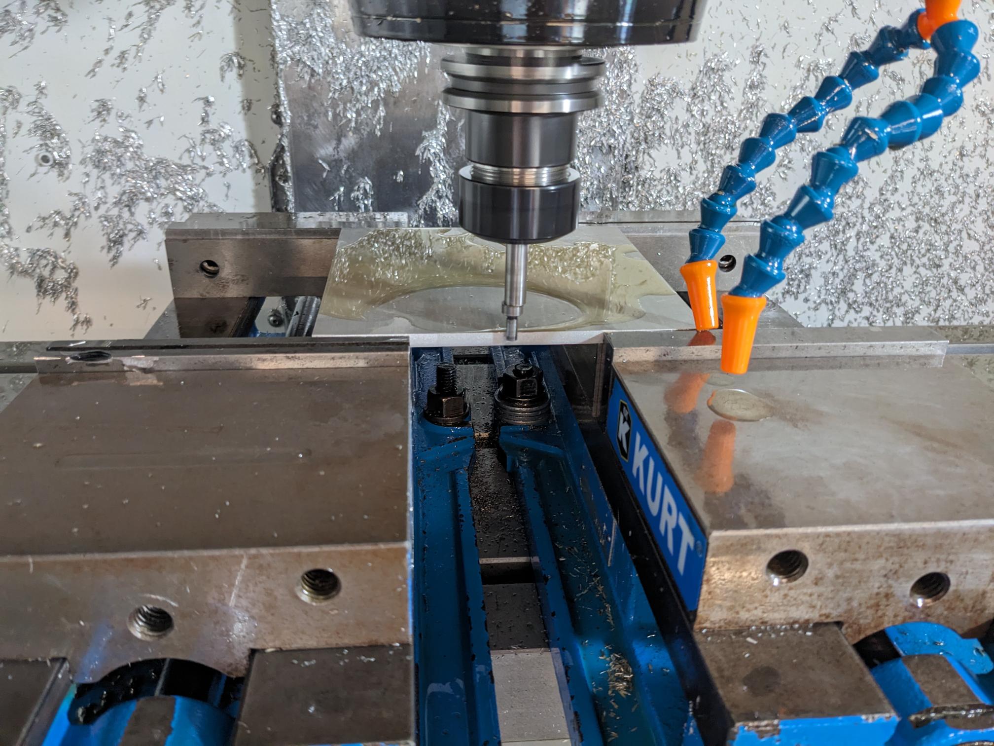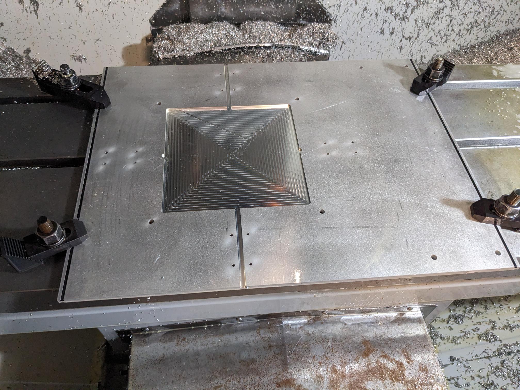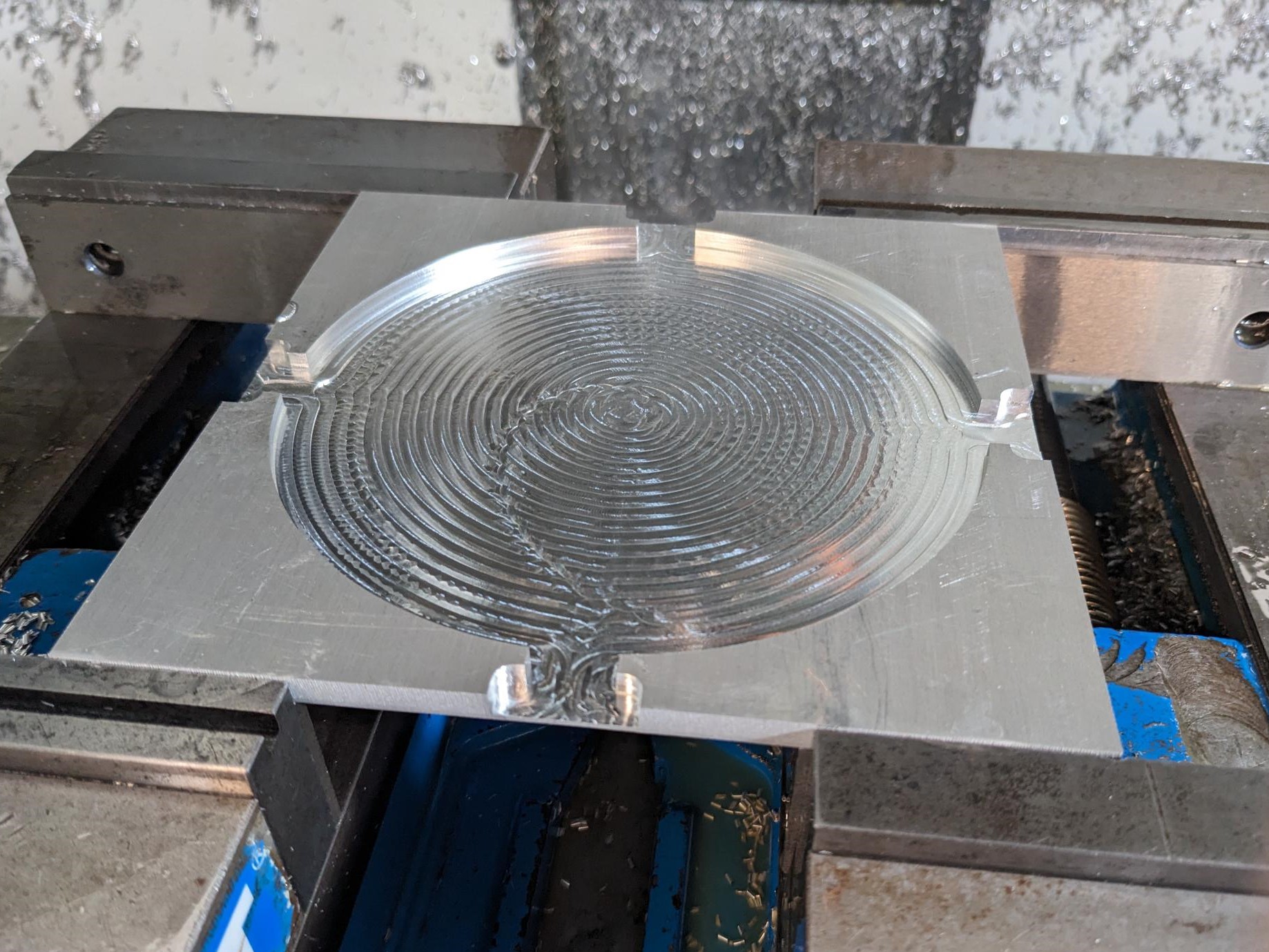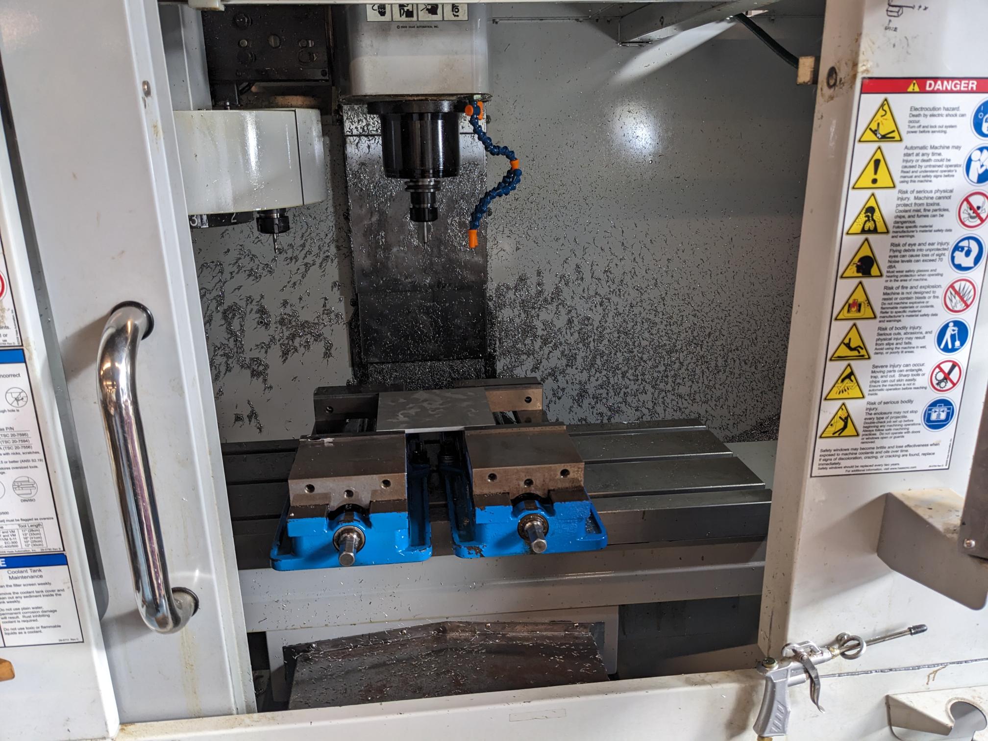 As for the base plate, this was a bit more tedious to set up since it was barely within the footprint the Haas could mill. I spent about 30min adjusting the edges so that it had a little bit of extra travel outside the entire cutting area, while also making sure it was squared up to the cutting bed. I had only used the Haas with vices up until this point, so I learned how to mount the parts with "toe clip" (I think is what they are called). Otherwise the process followed the same pattern as the wafer frame but I did not do any polishing on this piece.