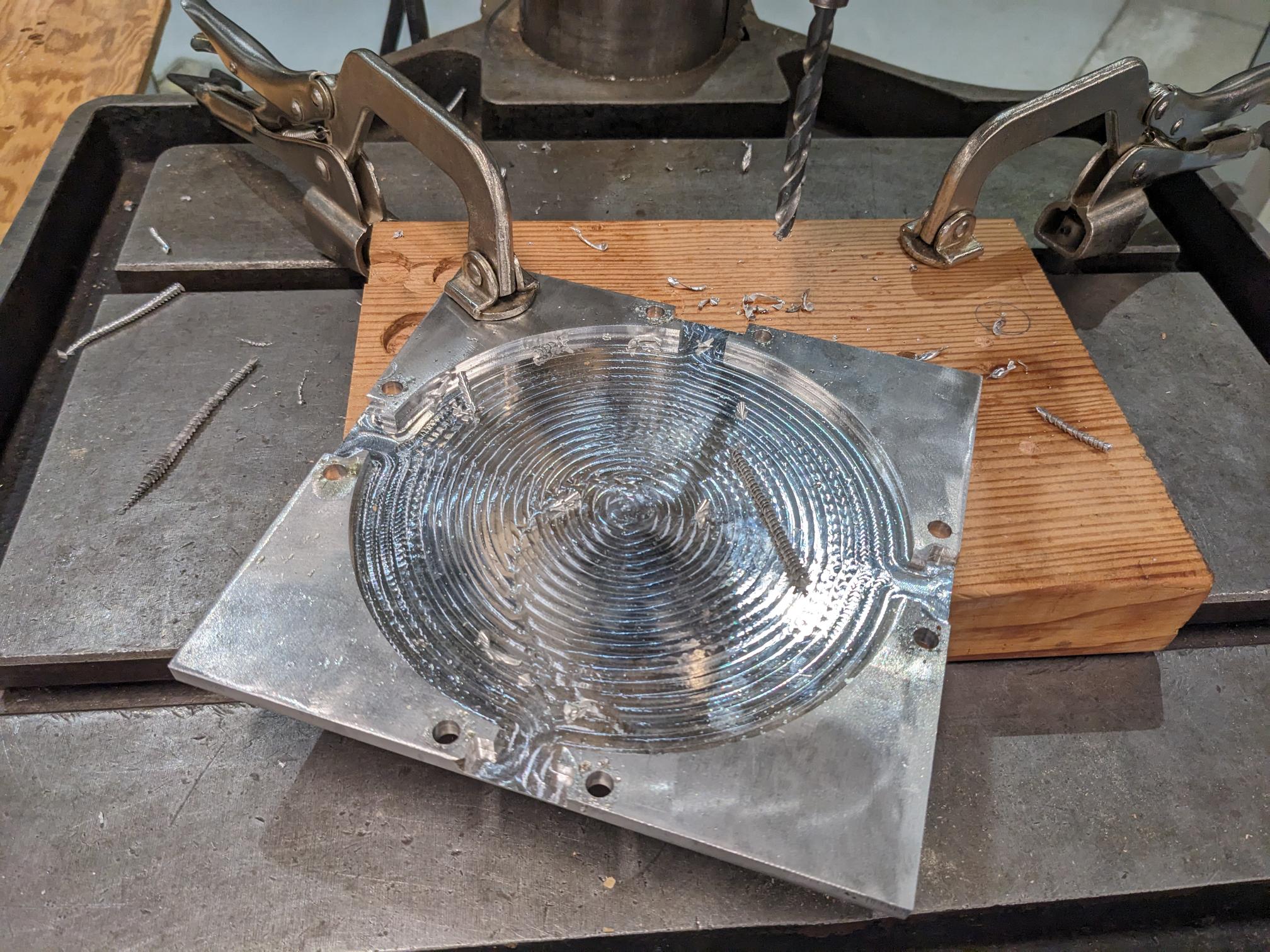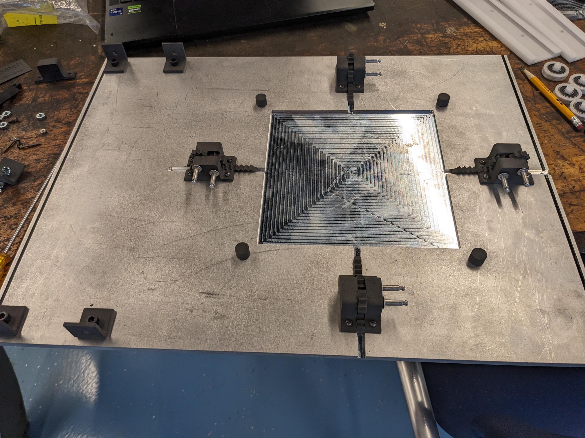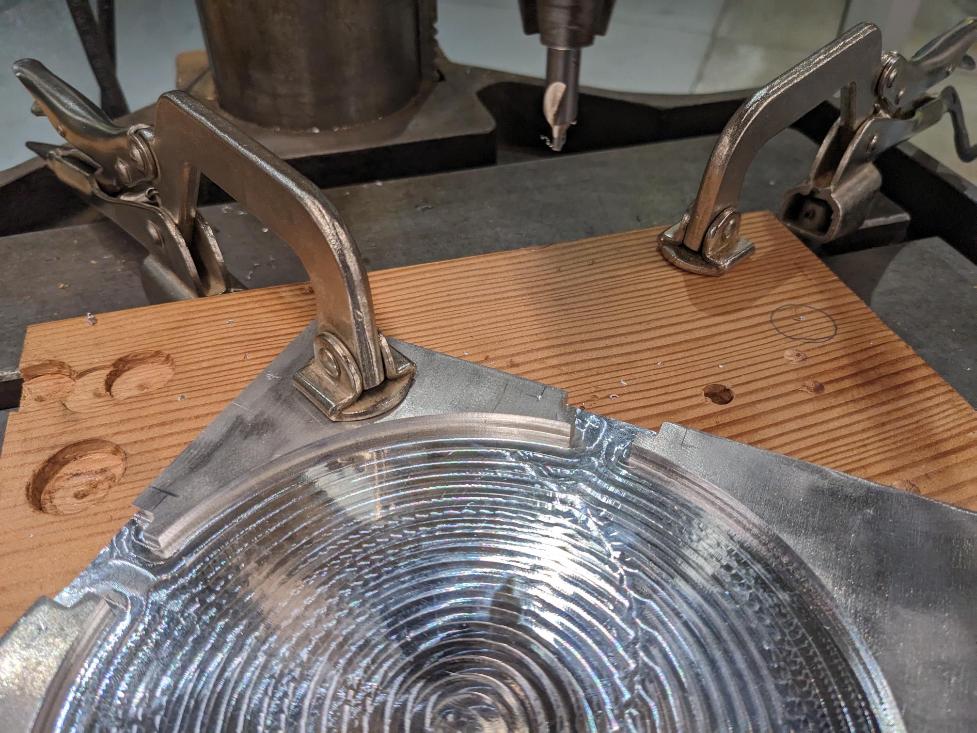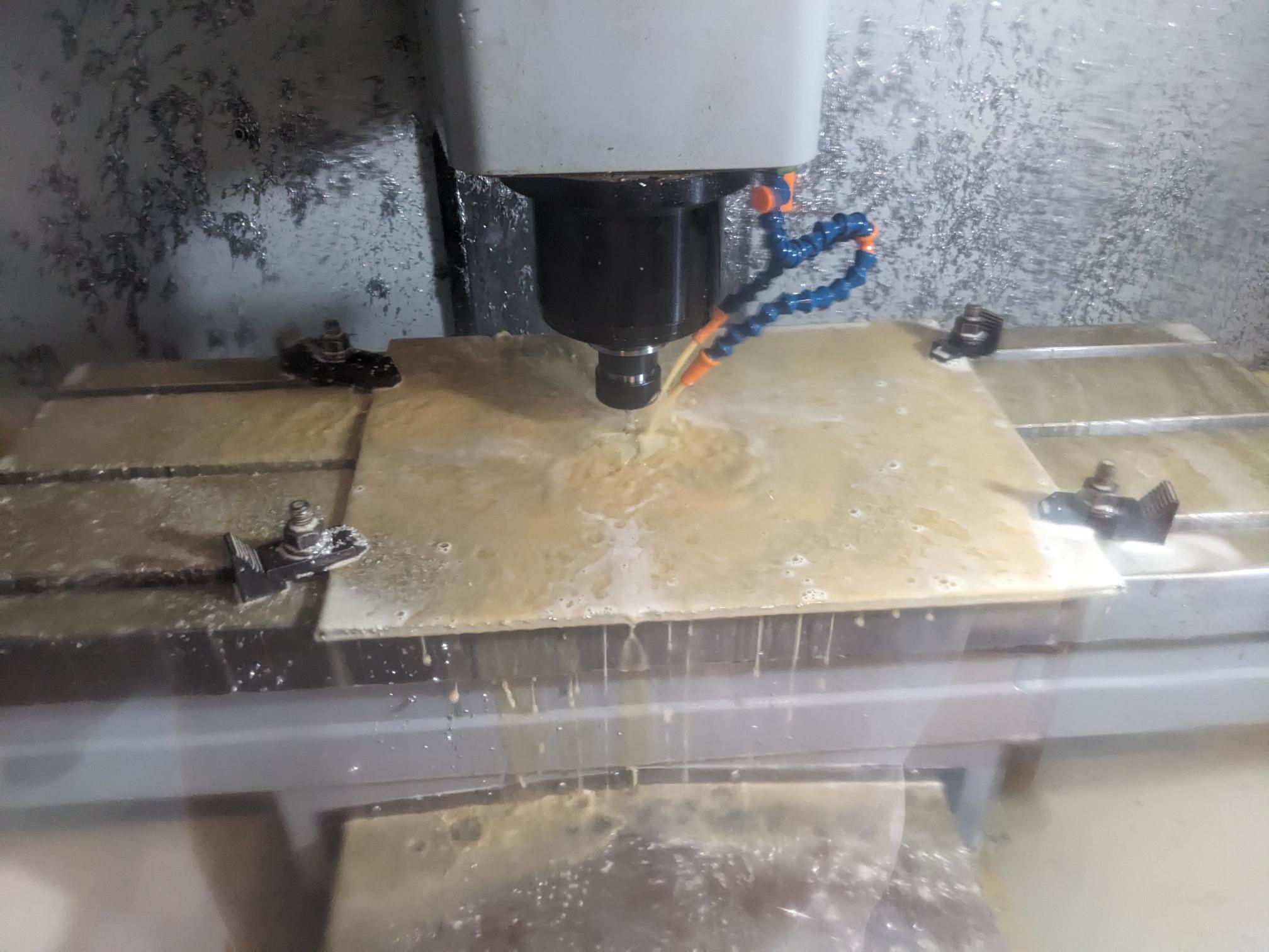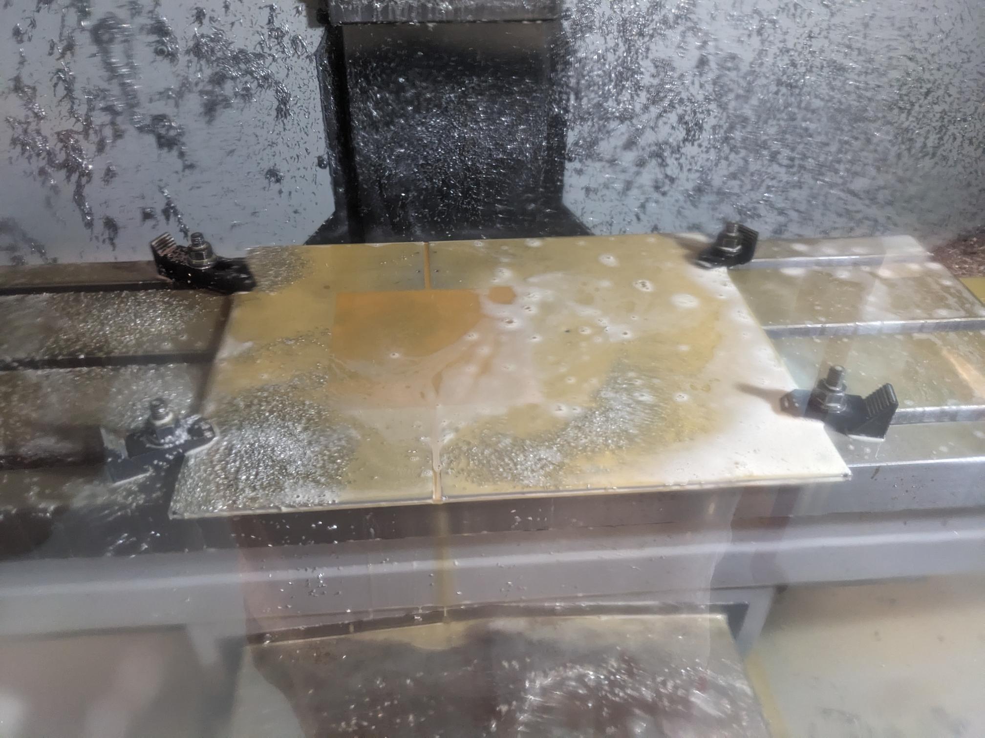 As for the base plate, this was a bit more tedious to set up since it was barely within the footprint the Haas could mill. I spent about 30min adjusting the edges so that it had a little bit of extra travel outside the entire cutting area, while also making sure it was squared up to the cutting bed. I had only used the Haas with vices up until this point, so I learned how to mount the parts with "toe clip" (I think is what they are called). Otherwise the process followed the same pattern as the wafer frame but I did not do any polishing on this piece.