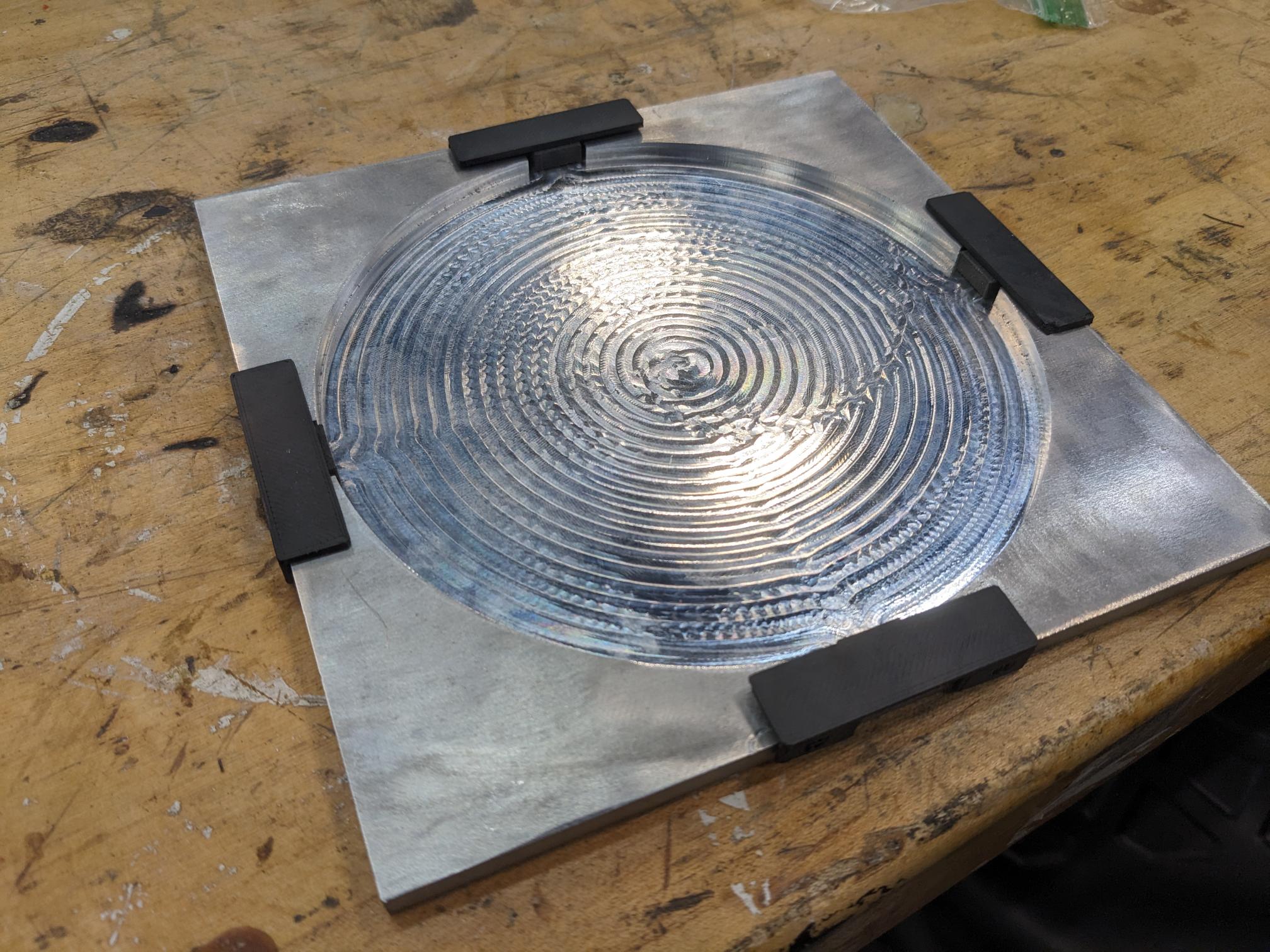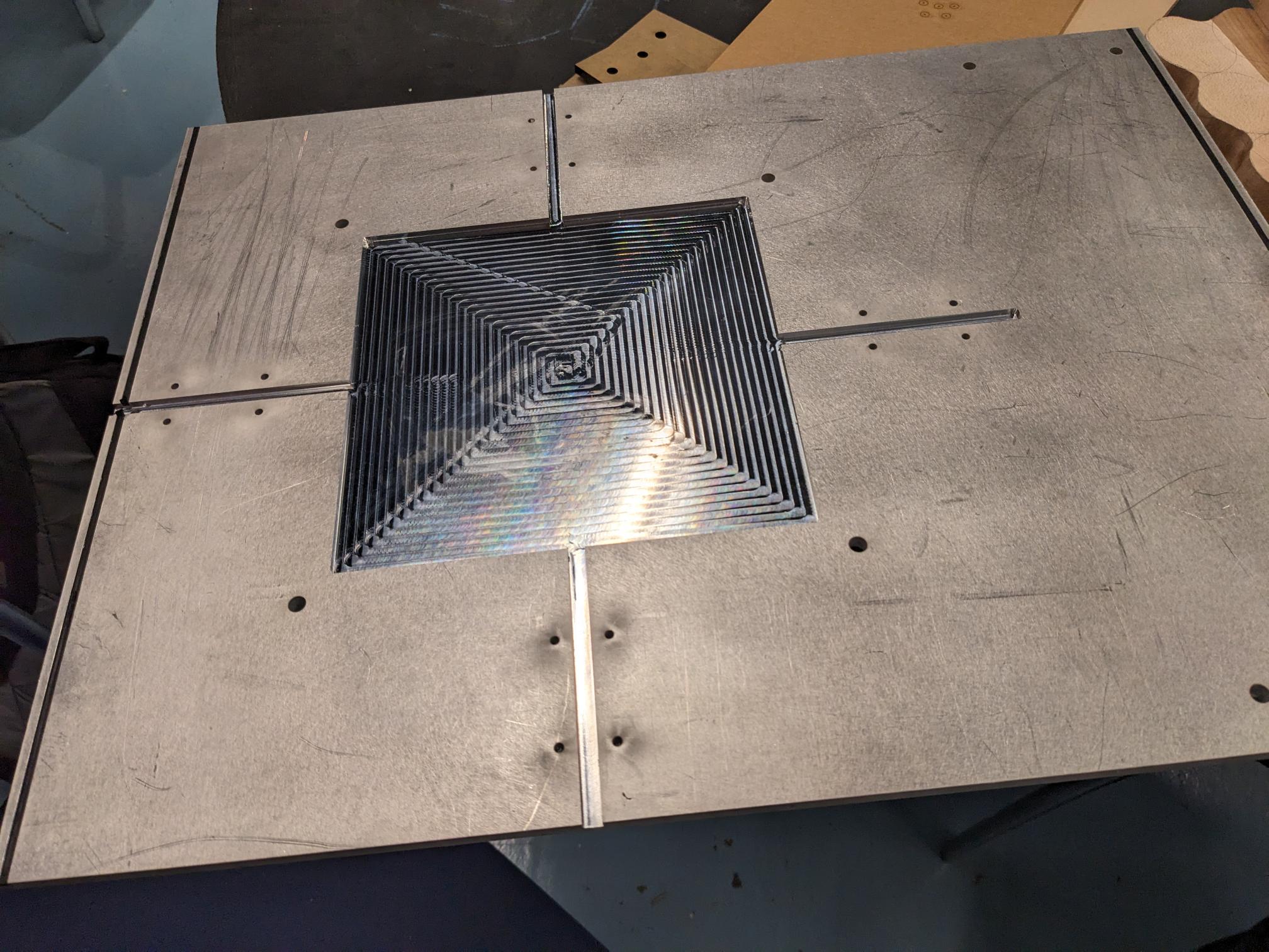 I also chose to make the 6in wafer holder out of aluminum mostly because it is very common to use for wafer chucks in cleanrooms, so I figured I might as well keep that consistent. That did mean I needed to cut out the footprint of the piece, so I found a large enough stock piece in a scrap pile and took it to the water jet to cut out the square footprint. This was an even simpler piece to cut because it was just a 7in x 7in square.