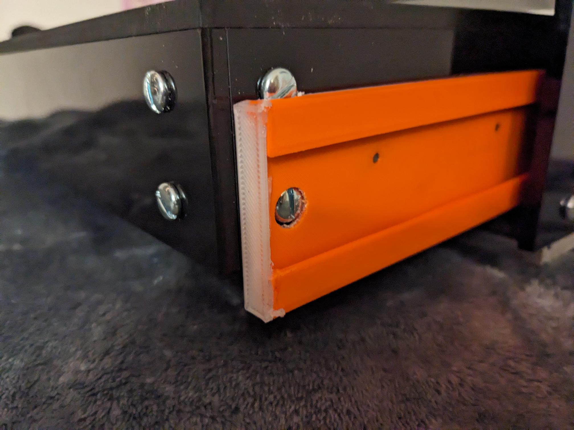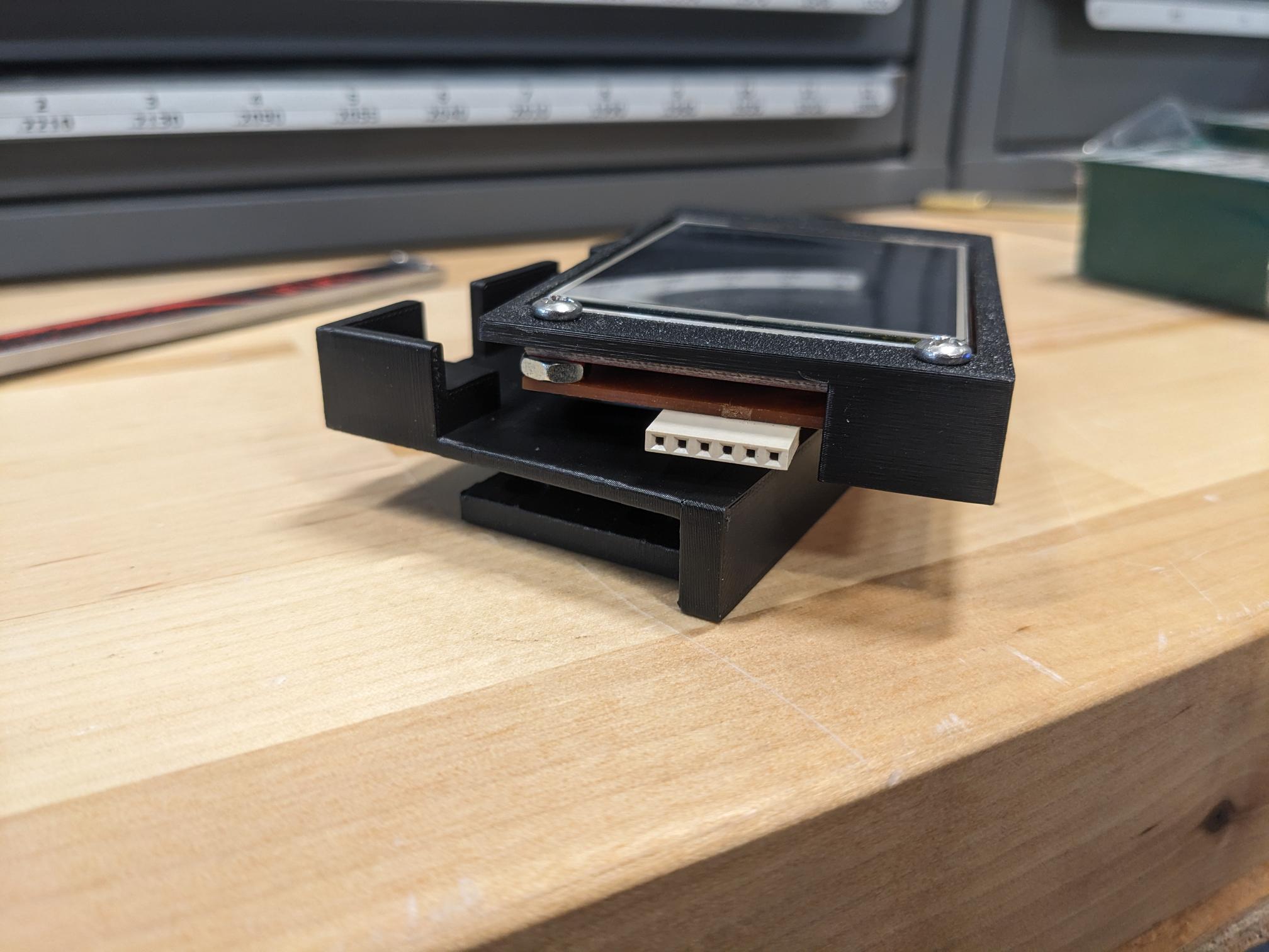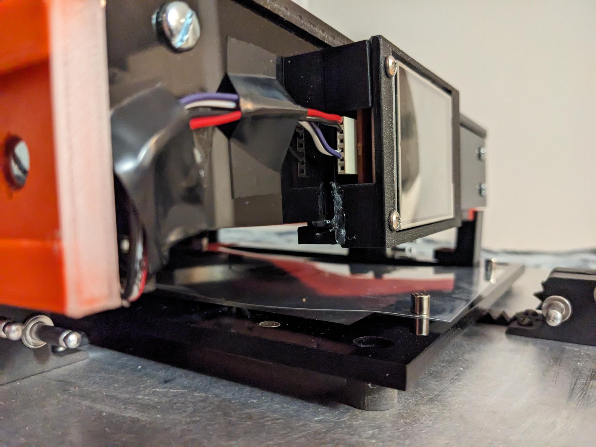 While testing the sliding mechanism I encountered the second issue that I did not anticipate. The problem was that my material stackup and dimension tolerances did not result in a completely rigid structure to support the sliding light box. As such, when fully pulled out over the substrate area it would sag downwards. Now this isn't really much of a problem because worst case I could just have the front rest on the mask frame and that would be good enough, but I figured I could come up with a cleaner solution. The method I devised was to add two more magnet holes to the new mask frame design (since I had not made it at this point) which would accommodate 3D printed standoffs that fit the thickness of my acrylic. These were really easy to design and print, and they fit their purpose very well. Not only are they the proper height for the light box to rest on, but it also helps give the user a consistent spot for the light box to be extended out to. These standoffs were printed at the same time as my TFT case, which meant I could finish my assembly. I did use more hot glue to secure my case pieces because a few spots were a bit flimsy, and I used more hot glue when mounting my case because I did not have the screw holes in the acrylic which would be great to include on a future iteration.