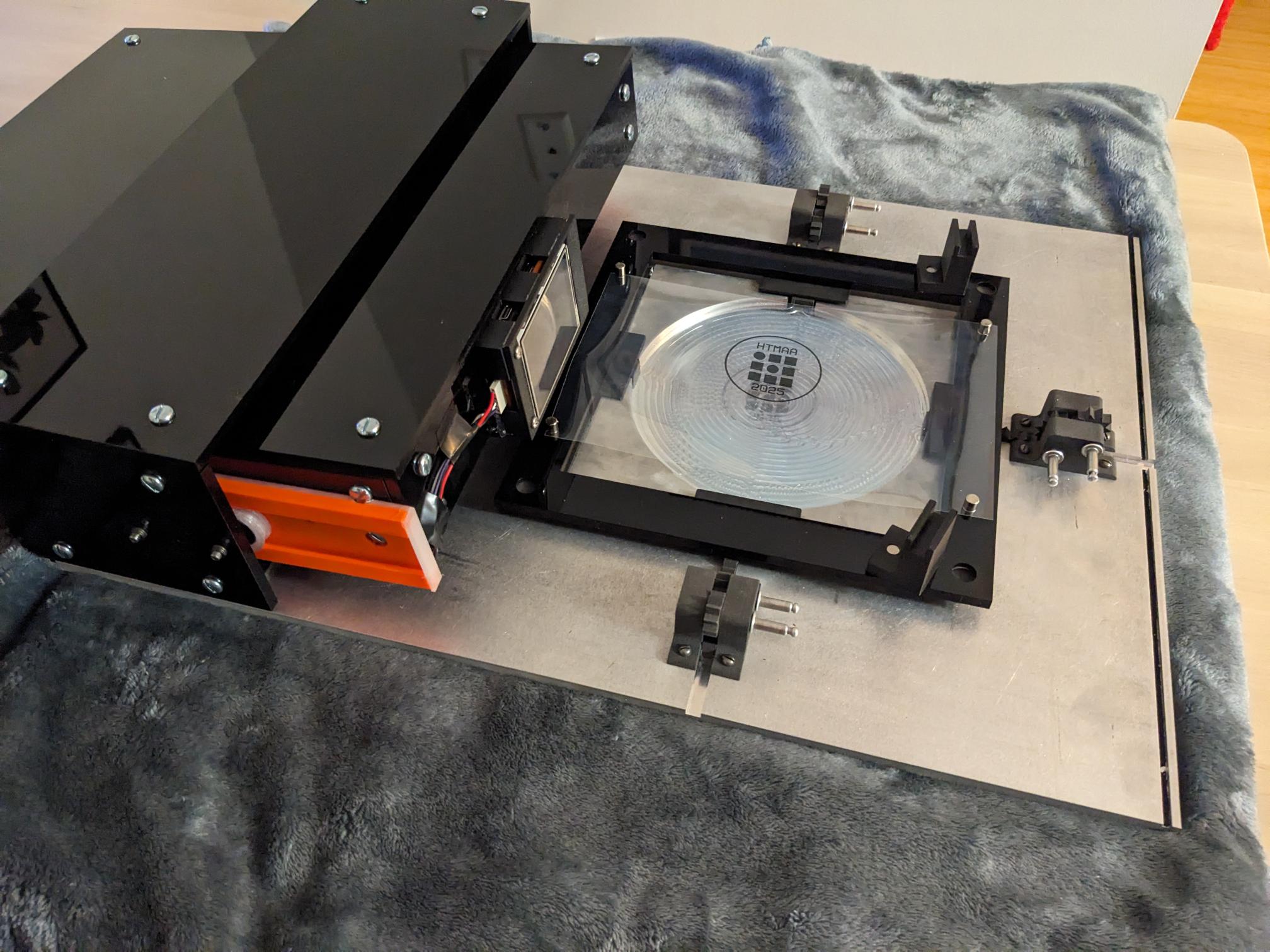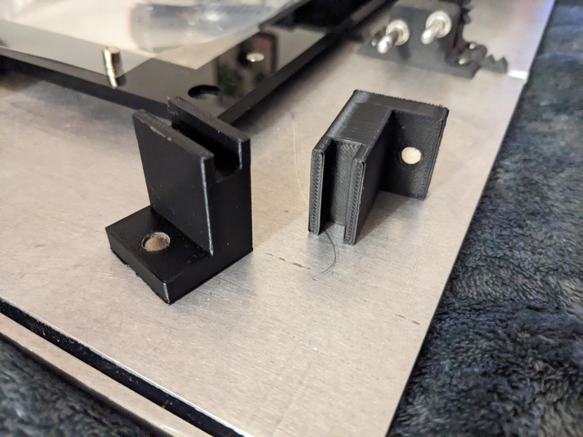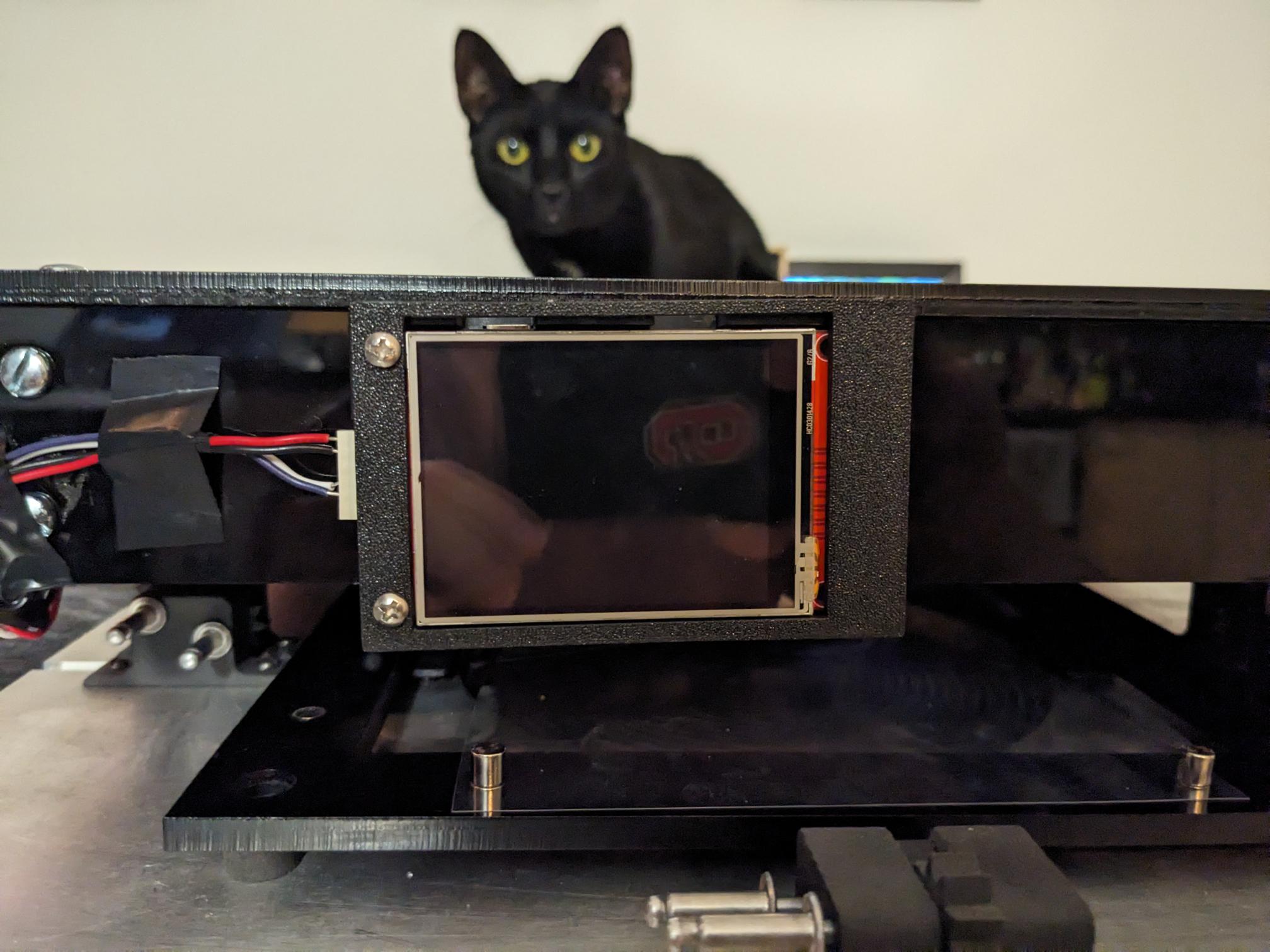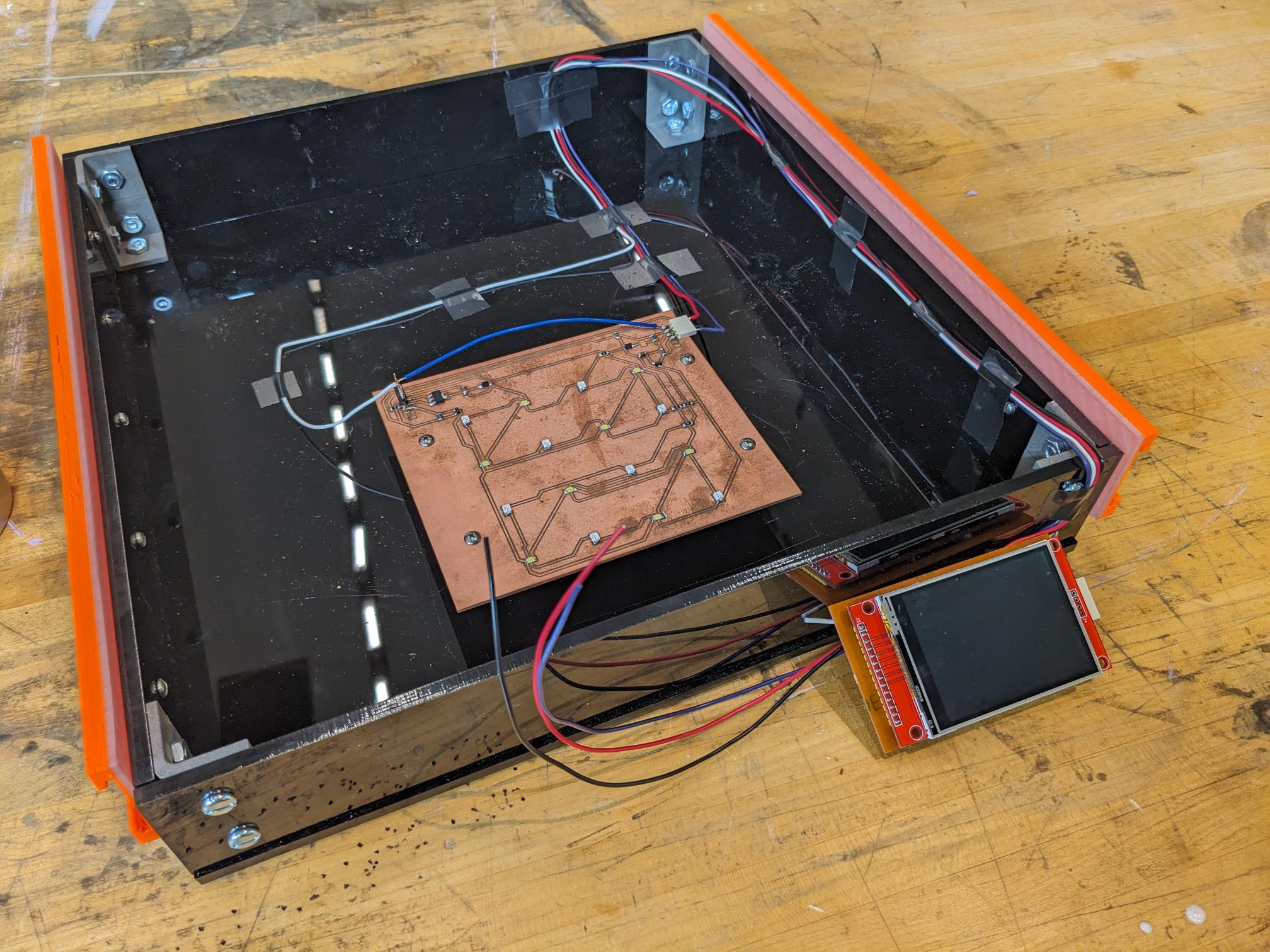 While testing the sliding mechanism I encountered the second issue that I did not anticipate. The problem was that my material stackup and dimension tolerances did not result in a completely rigid structure to support the sliding light box. As such, when fully pulled out over the substrate area it would sag downwards. Now this isn't really much of a problem because worst case I could just have the front rest on the mask frame and that would be good enough, but I figured I could come up with a cleaner solution. The method I devised was to add two more magnet holes to the new mask frame design (since I had not made it at this point) which would accommodate 3D printed standoffs that fit the thickness of my acrylic. These were really easy to design and print, and they fit their purpose very well. Not only are they the proper height for the light box to rest on, but it also helps give the user a consistent spot for the light box to be extended out to. These standoffs were printed at the same time as my TFT case, which meant I could finish my assembly. I did use more hot glue to secure my case pieces because a few spots were a bit flimsy, and I used more hot glue when mounting my case because I did not have the screw holes in the acrylic which would be great to include on a future iteration.