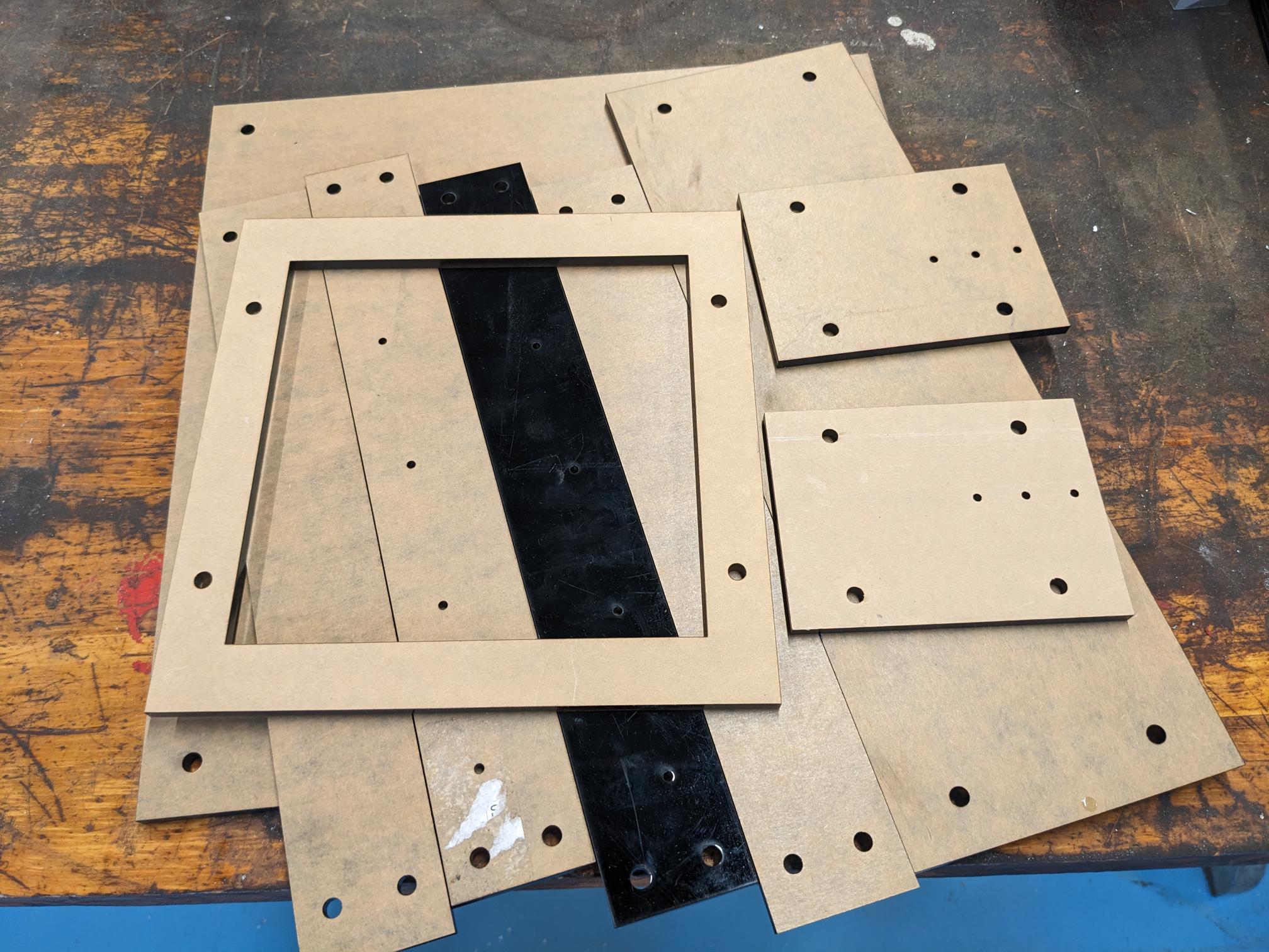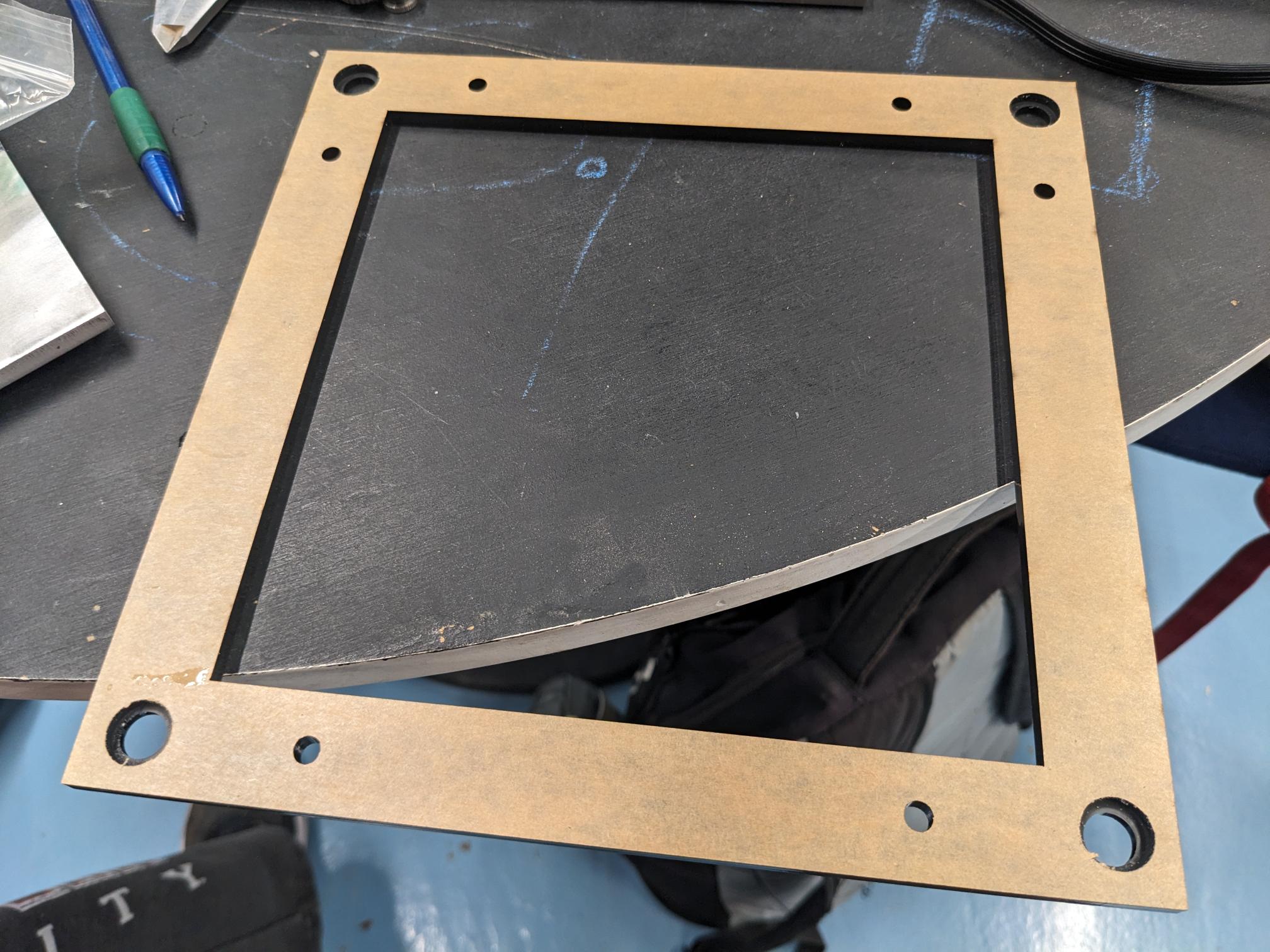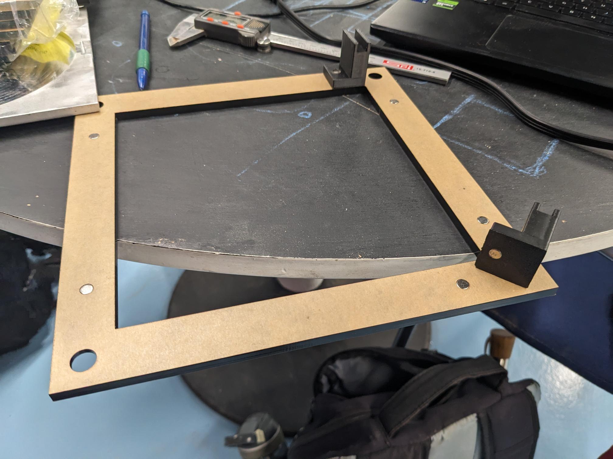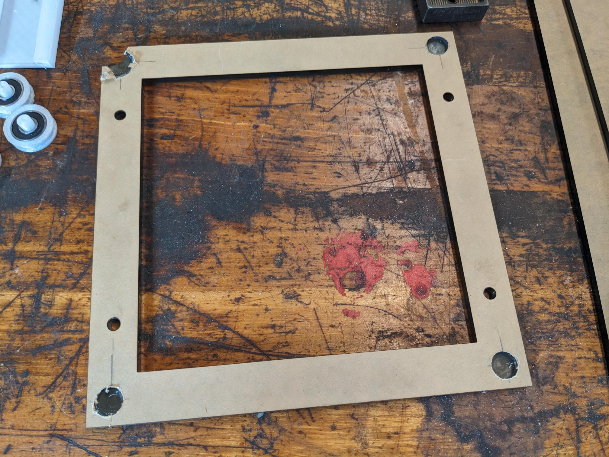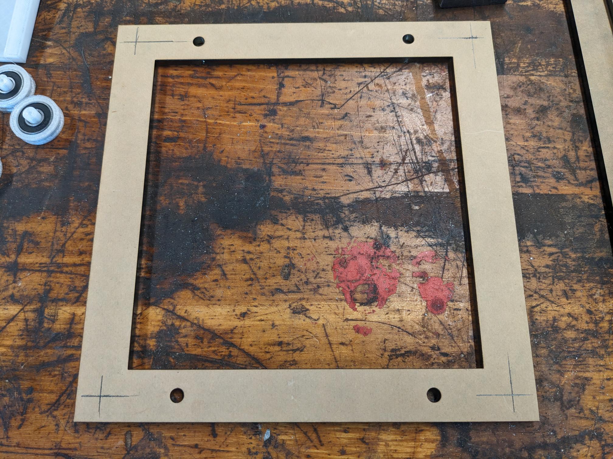Luckily, I had plenty of time and scrap stock left over to make another one. I also made some changes to the design based on some learnings I gained in the assembly process. I added the pilot holes to the corners so I would just have to drill with the 9/16in endmill, I shrank the diameter of the magnet holes to .225in to make sure there was a snug fit, and I added two more magnet holes to accommodate a 3D printed support for the light box. Details on this support and why it was needed are discussed in the assembly section of this page. I ended up cutting out two frames just in case I broke one of them again, but I didn't even need to use the second one because the addition of the pilot holes on the laser cutter worked very well!