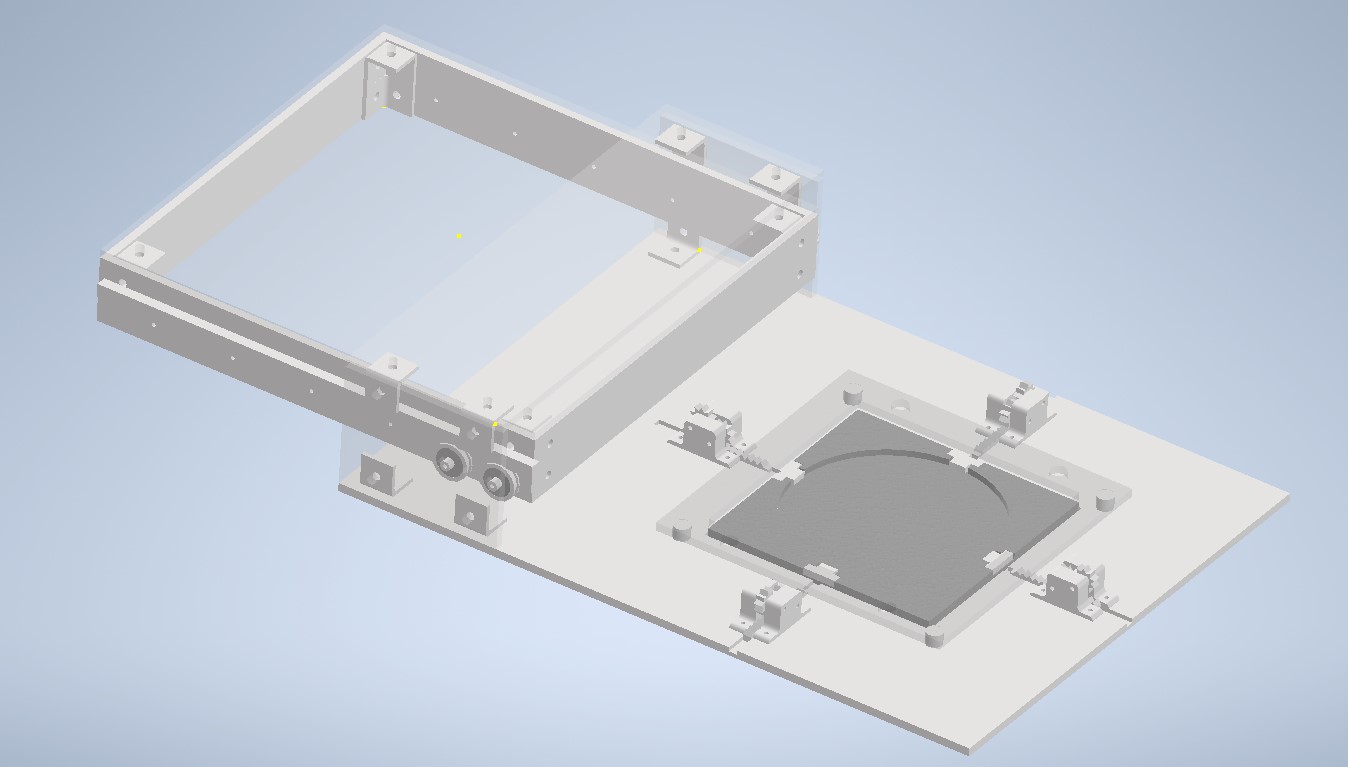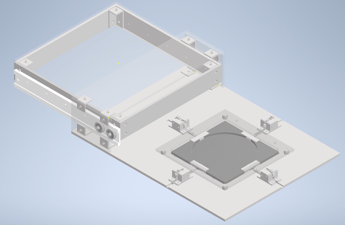 In the above images, the top left picture is of an alignment chuck for a 6in wafer. The central pocket is slightly larger to allow the alignment pads some room to come in from the cutouts on the sides to actually hold the substrate in place. The top right image is a crude drawing of the light box, initially I was thinking about putting bulbs in but now I am going to make my own board with surface mount white or UV LEDs pending some experimentation. The bottom left is the raised frame that will have magnets inserted into the holes to hold the printed mask in place above the substrate, this piece is transparent because I am planning on making it out of a plastic/acrylic material and was playing with material features. And finally, the bottom right is the main body/plate that everything will be attached to. Ultimately the light column will be made separately and attached mechanically, but for simplicity I modeled it all together. This component is also currently made from aluminum in the CAD, but I am thinking that I will likely make it out of acrylic if possible due to material costs. When combined, these components create the assembly seen below. I then imported the assembly into Fusion 360 to handle the rendering and animation.
