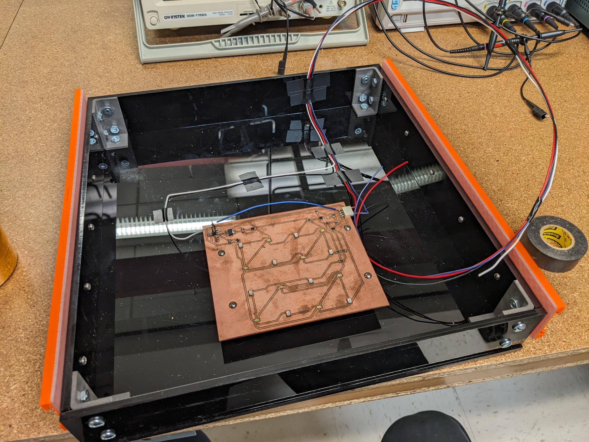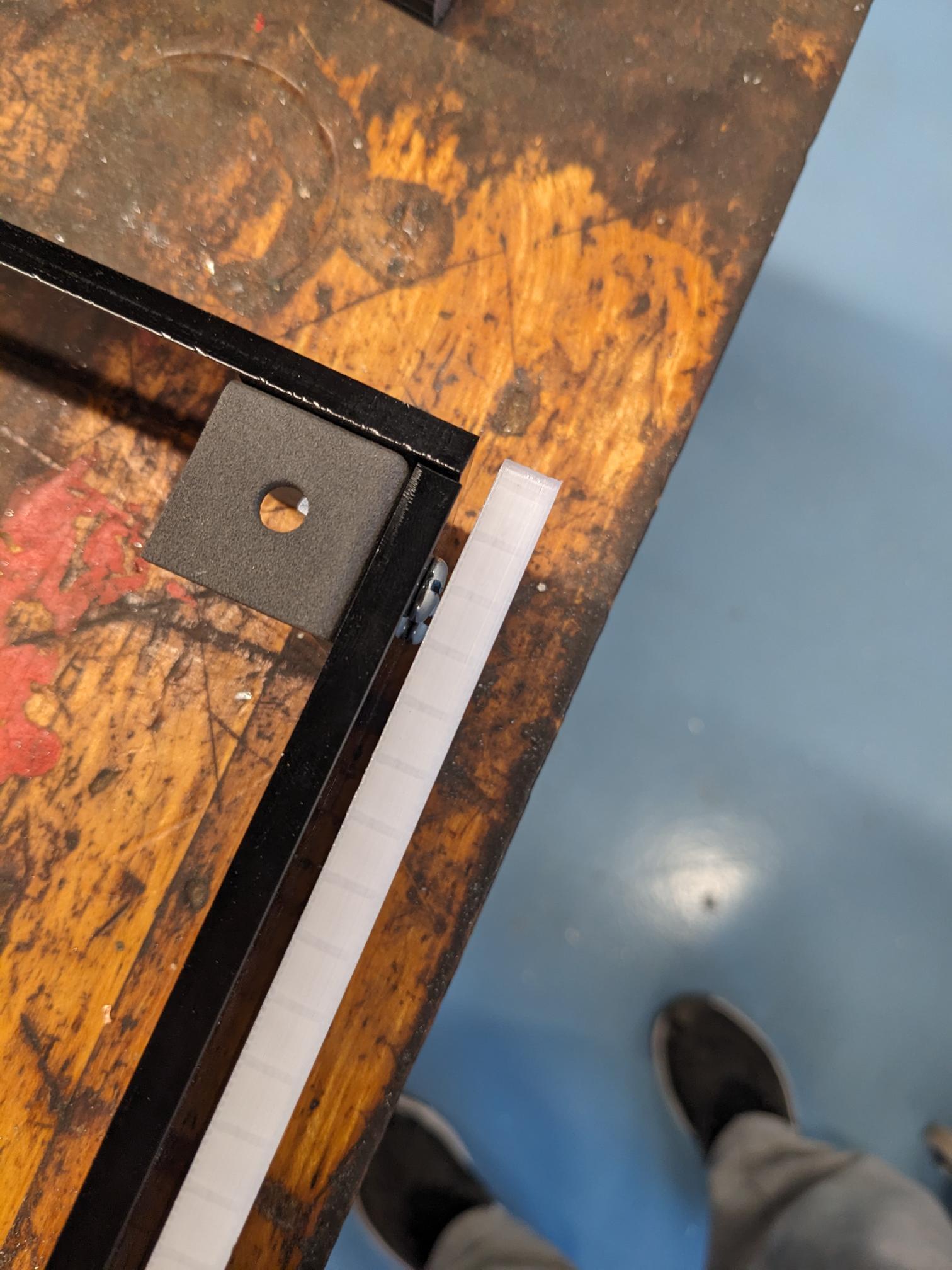 Next up was the light box itself, which mostly consisted of the acrylic parts. These were easy to assemble, but when I went to fit the rails on the sides I encountered my first problem. I did not account for the screw heads coming off of the light box, which caused my printed part to bend and fall out of tolerance for how my project was meant to fit together. I gave an attempt at drilling a hole in the part to accommodate the screw, but ultimately found it was best to re-design the part and to print it again. Sadly, I somehow did not get the diameter of the screw head right or maybe entered the radius as what was meant to be the diameter, because when I tried to install the new parts the dimensions were slightly too small. I also realized a bit too late after the fact that my rails are not designed to be symmetrical. So when I added the new features one of the rails fits as intended while the other rail still fits but is offset by about 1/4 to 1/2 an inch. Regardless of the positioning, I still had enough travel to fully expose my chuck area so I decided to move ahead for sake of getting the project done on time.
