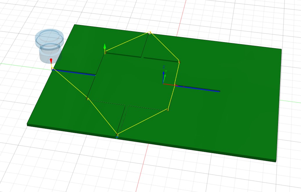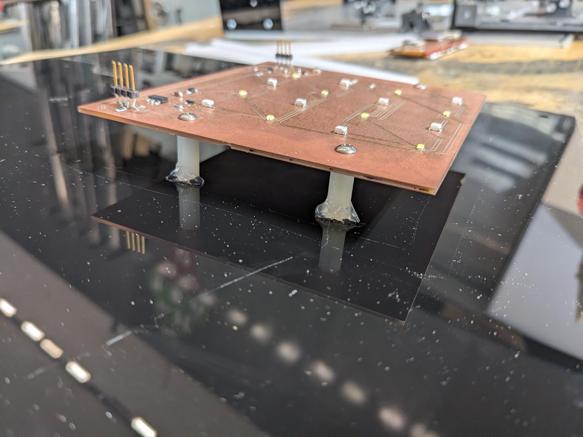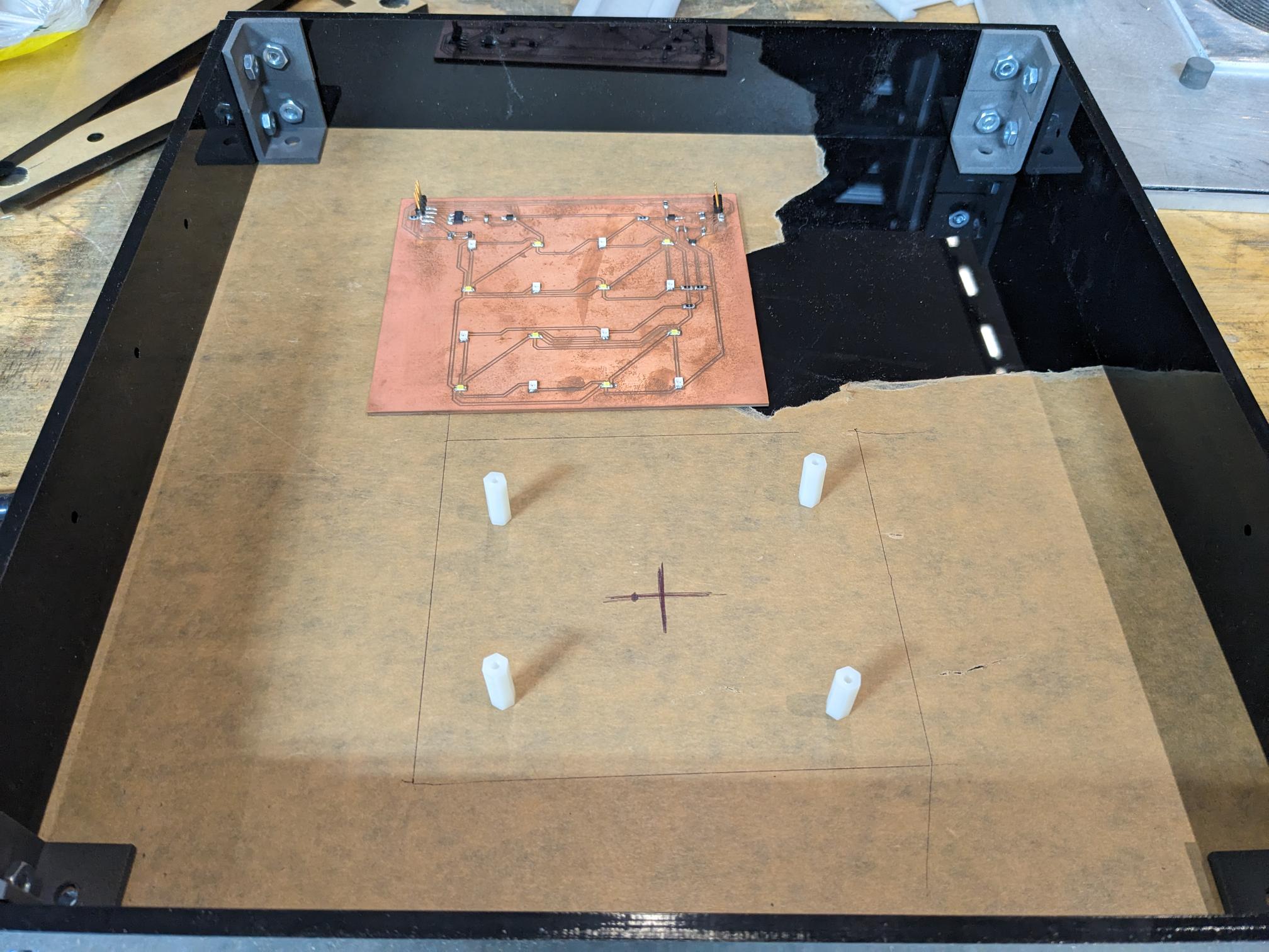 While the new rails were printing, I figured out the placement and mounting mechanism for my light board. I mapped out where the footprint should go and used nylon standoffs from the CBA community parts shelves to position it a little bit off the acrylic. The nylon standoffs accepted 4-40 screws, so I drilled holes in the PCB where no traces were and screwed in the standoffs. I then aligned my board to the footprint I had mapped out and glued down the standoffs with a hot glue gun.