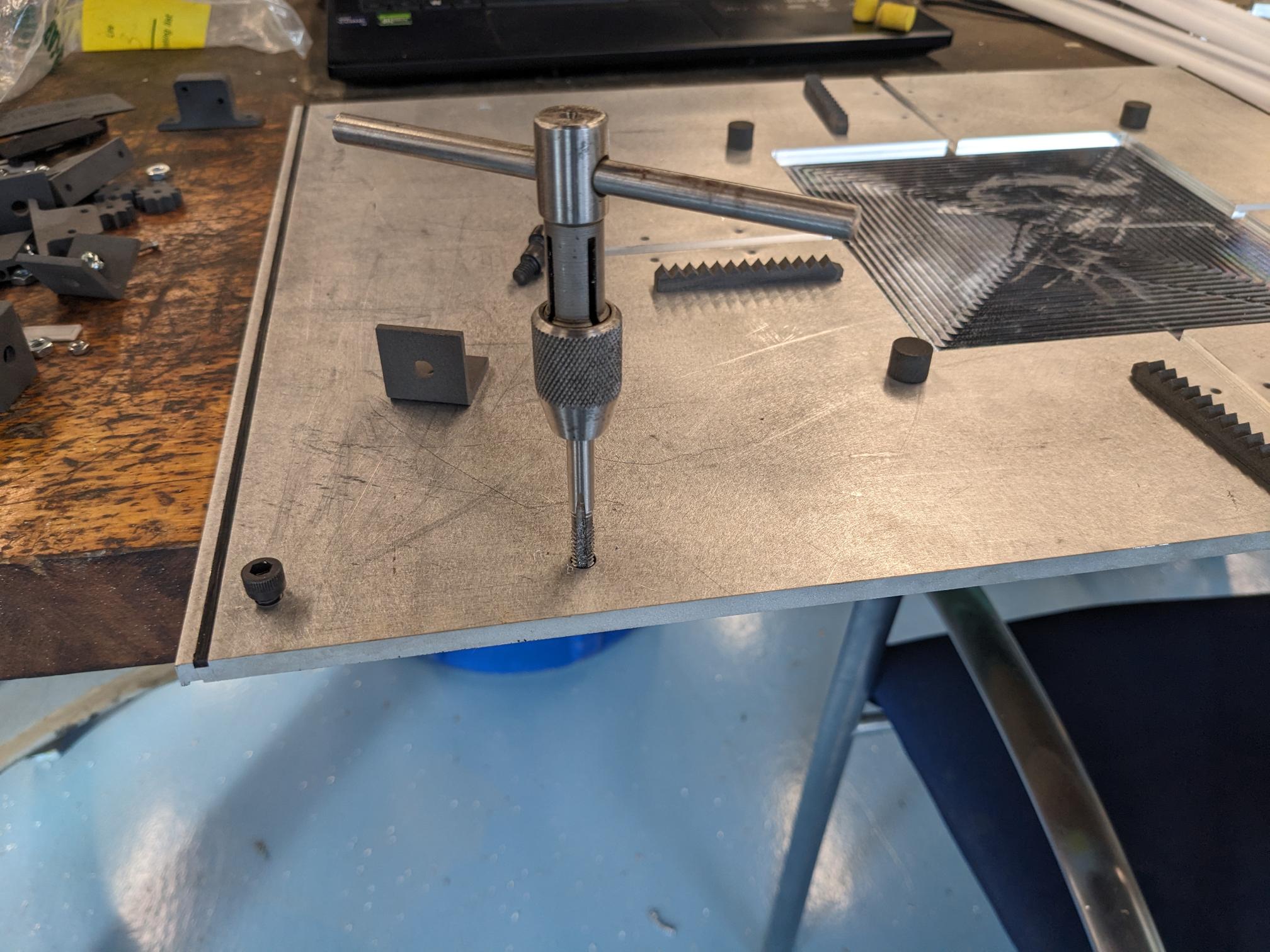 Unfortunately, in order to accommodate the alignment pad holder on the wafer frame, I needed to make 8 through holes and 8 tapped holes for screws. The through holes are not hard, I just marked out the location they needed to go, drilled an imprint with a centering bit, and then drilled the hole with a 1/4in bit. I do wish I had thought about this sooner because these could have been taken care of on the water jet which would have saved me some time. The screw holes would have been a lot more annoying though because I would have to mount the plate on its side in order to get at them. I would have liked to drill them, but I decided that I would skip this step in favor of making more progress on the overall project since this is a minor detail and actually doesn't have a large impact on the overall operation.