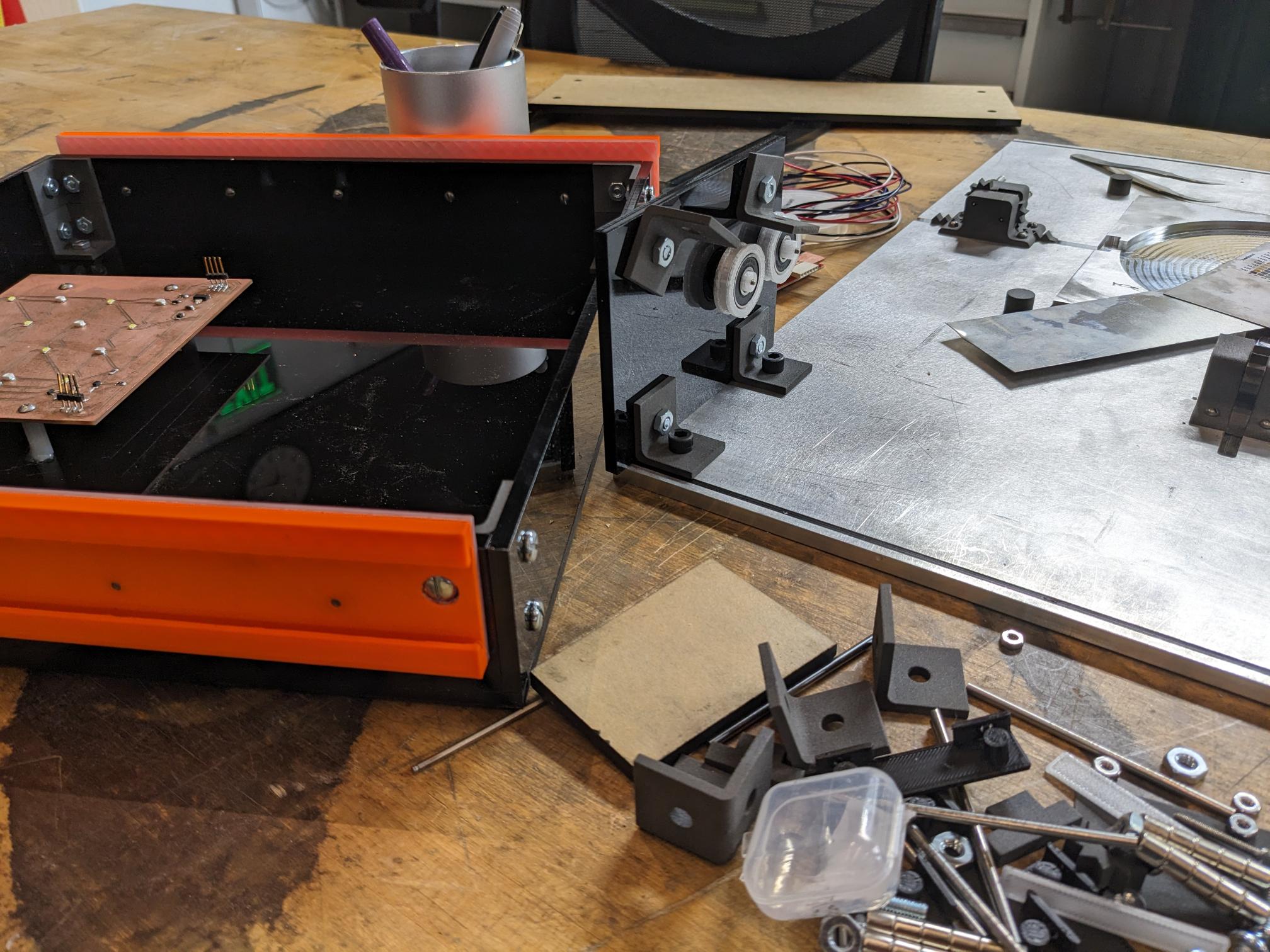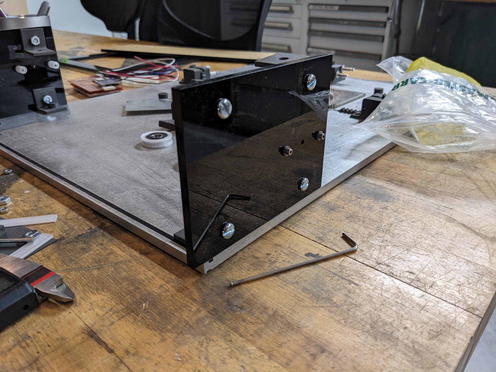 At this point I put the sidewalls (and top acrylic) on the main base plate and screwed in the ball bearing fixtures. I then slid the rails on which took a bit of finagling at first because I had not cleared away all of the 3D printed support material. I was able to see that my spacing was correct and everything was at the proper dimensions, but I went back to clear the additional material before re-positioning my rails. I then glued the end caps on to make sure that the light box wouldn't slide too far and come off the ball bearings.