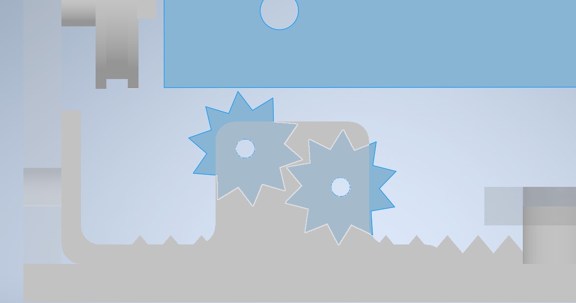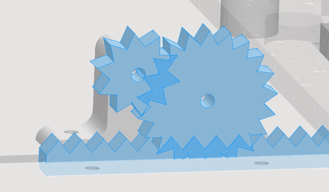 Another area that required a couple of design iterations was the gear system I had implemented to align the substrate. I had CAD-ed all the parts for the assembly in Week 1, and screenshots of these parts are in the Week 1 page. There is the linear toothed component, a large and small gear, and then a mount for the gears. I did not update these designs while I finished making the rest of the parts, but when I assembled them all together somewhere along the way my math was off. The large gear physically collided with the other parts which obviously is a problem, a visual inspection also revealed that the teeth of the gears/rail could potentially jump or catch because the spacing was off, and the light source would crash into gears because the clearance was too low. After a few design iterations, I ended up removing the large gear entirely in favor of two of the same small gear. This allowed me to also reduce the height of the mount, so that I only needed to raise the height of the light source by a tiny bit. This distance was pretty important to me because without expensive controls and optical components the light will spread out more from the point of origin as the light source gets further away from the mask. For the best results and clearest image transfer, it is important to make sure that the light source is as directional as possible, meaning the light has as little time to spread out as possible and therefore should be close to the mask. In the images below the old design is on the left and the new design is on the right.