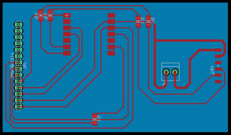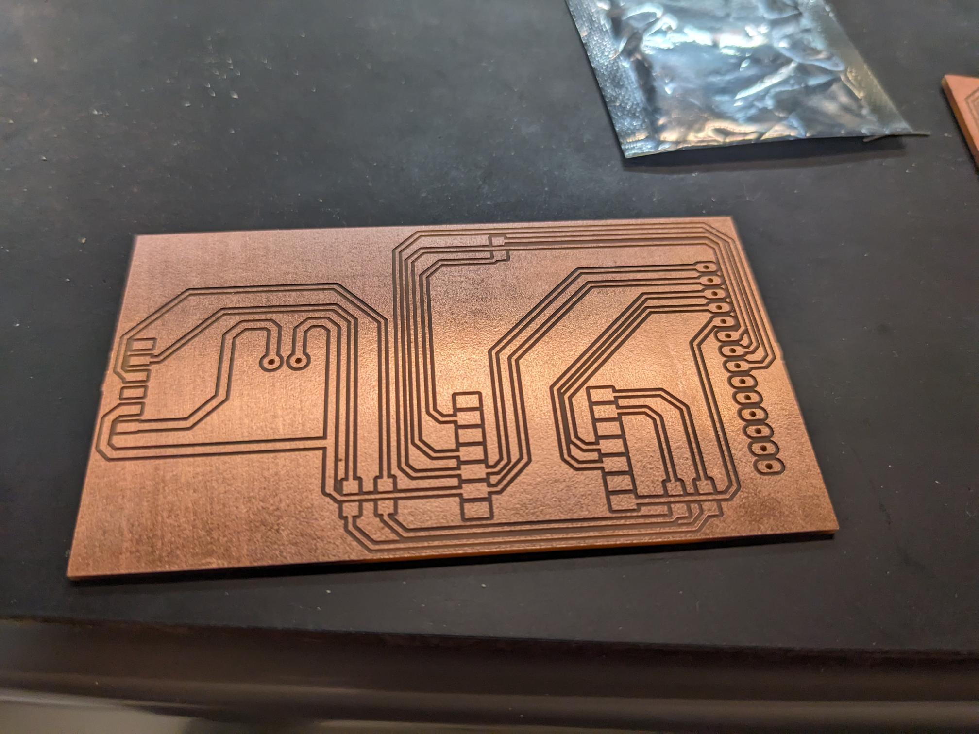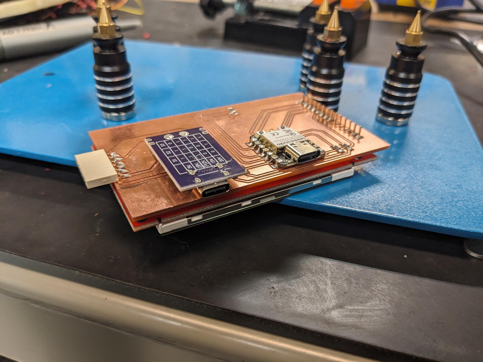 I had intentionally designed the board such that the XIAO and the USB-C breakout would be on one side of the board, and the TFT would be on the other side with through holes to allow the pins to be soldered to the traces. This worked out really nicely, although I did realize that I actually needed to flip my USB-C board because I did not label the + and - terminals of the block well. This did not end up being a problem though, and the board came out great! As usual this board was also produced with the same flow (gerb2img, mods, and Carvera milling) as all the other CNC-ed boards I have made for this class.
