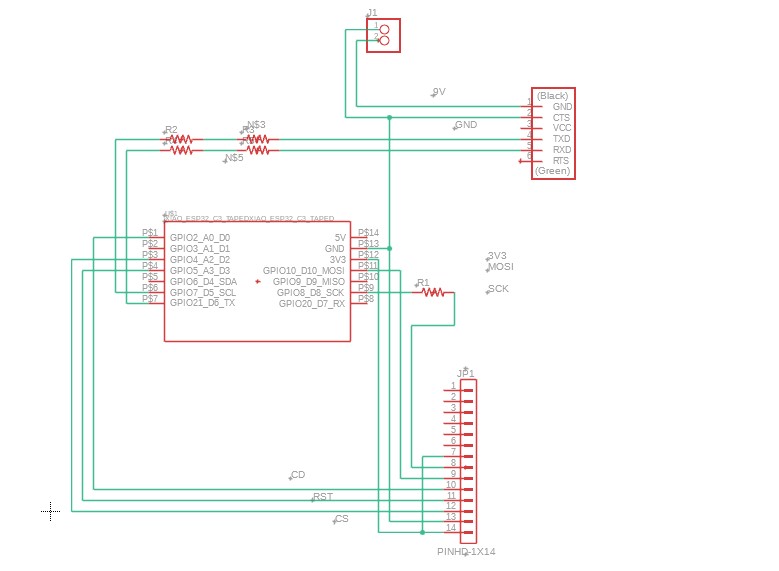 For this project there are two boards I needed to make, the first of which is my light source. This board contained two sets of LEDs, one set of which were bright white LEDs and the other is UV LEDs that I ordered off Amazon for this project specifically. I wanted the user to have the ability to operate either of the two types of LEDs depending on the available photoresist. I initially created and tested this board during Week 9 - Output Devices, so there are more details on the circuit layout, design process, and fabrication efforts there. That being said, since making the board in Week 9 there are a few adjustments that I made now that more design decisions have come into play. The first decision I made was how I am going to power the two sets of LEDs. I had found that with a 10kOhm resistor acting as a load off of the MOSFET, the white LEDs needed a supply of about 7V where the UV LEDs operated pretty well at 8-9V. There is a USB power regulator board that is kept in the class inventory where the output of the supply can be controlled by toggling three switches, and one of the settings is for 9V. This component is super useful because I designed the light source board to operate with the supply voltage going through regulators, or the voltage can be directly supplied to the LEDs and bypass the regulator. This would allow me to supply 9V to the UV LEDs while then running the 9V through my 5V regulator to supply voltage to the white LEDs. Or at least I thought. As it turns out, even swapping out the 10kOhm limiting resistor on the white LED side with lower values did not increase the brightness as I had hoped. Even with a 10Ohm resistor, I needed an input voltage of about 7V which would require a new regulator. The solution I came up with is to just use the bypass pathway I implemented to supply 9V to both the white and UV LEDs. I then increased the resistor on the white LED side to a 100kOhm to limit the current more now that the voltage was higher. Other than that the design of this board is the same as that in week 9.The second board that I needed to make was the control board that contains a screen, the USB-C power board, and the XIAO. I had done a lot of work in Weeks 12 and 13 on getting an ESP32C3 to talk with a SPI TFT screen module from the class inventory, and to implement a UI that sends/receives information. Unfortunately I was unable to get the touch working for reasons that still escape me, but the code and wiring worked really well on a breadboard level. I then started to design a PCB that would implement the same electrical connections between the TFT and the XIAO, It would also include two PWM control signals coming off the XIAO for setting the white and UV LED power levels, and it had the 9V power lines coming from the USB-C breakout board. I set the form factor to roughly match the size of the TFT with the intention on creating a case/housing that I would then 3D print in the following days.