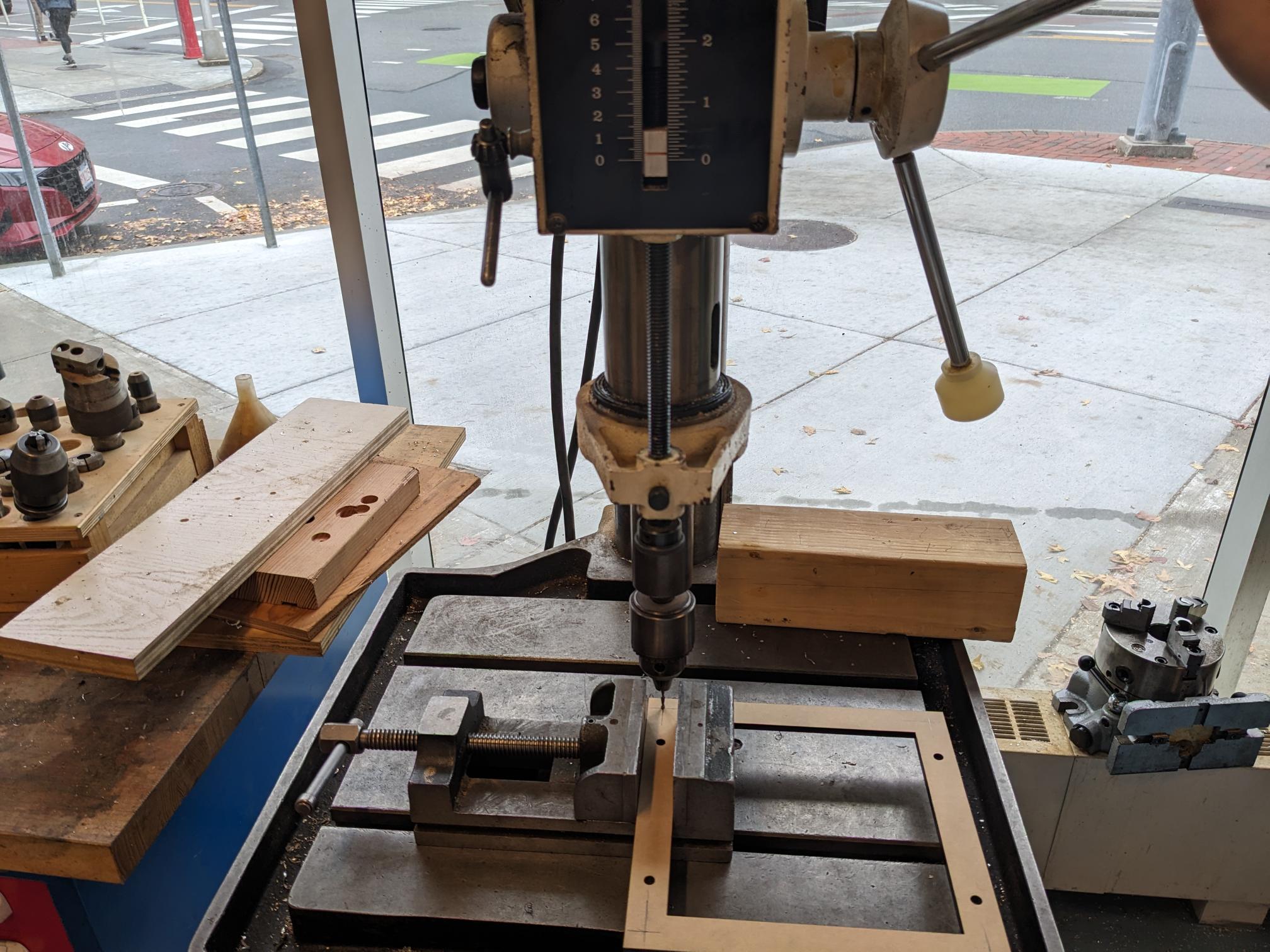 I did need to drill some holes 1/8in into the corners of the mask frame but not all the way through so it can sit on the standoffs I designed. I did this manually by marking out where I wanted them to go and using the depth markers on the drill press to make sure I was going to the right depth. Charlotte at the hobby shop suggested that I use pilot holes to prevent cracking my stock, so I started with 1/8in, then stepped up to 1/4in, and finally went with 1/2in. I also used flat endmills because I wanted a flat profile, and tested the drilling on a scrap piece before committing my part. Unfortunately, I made a bit of a assumption that did not work in my favor. I had just finished up the 1/2in in cut on the test piece, meaning the step-up drilling was working great, and I tested the fit on my standoffs. It was much tighter than I was looking for, so I figured I could just use a slightly larger endmill like 9/16in. The 9/16in worked great size wise, but I did not think that there would such a difference between 9/16in and 1/2in when actually milling my acrylic. Sadly, there was a moment during drilling where the endmill skipped while cutting and it shattered one of the corners of my frame.