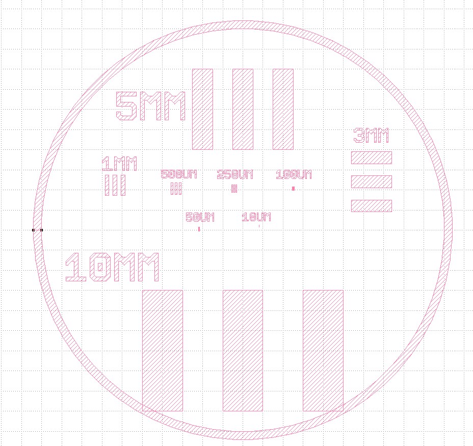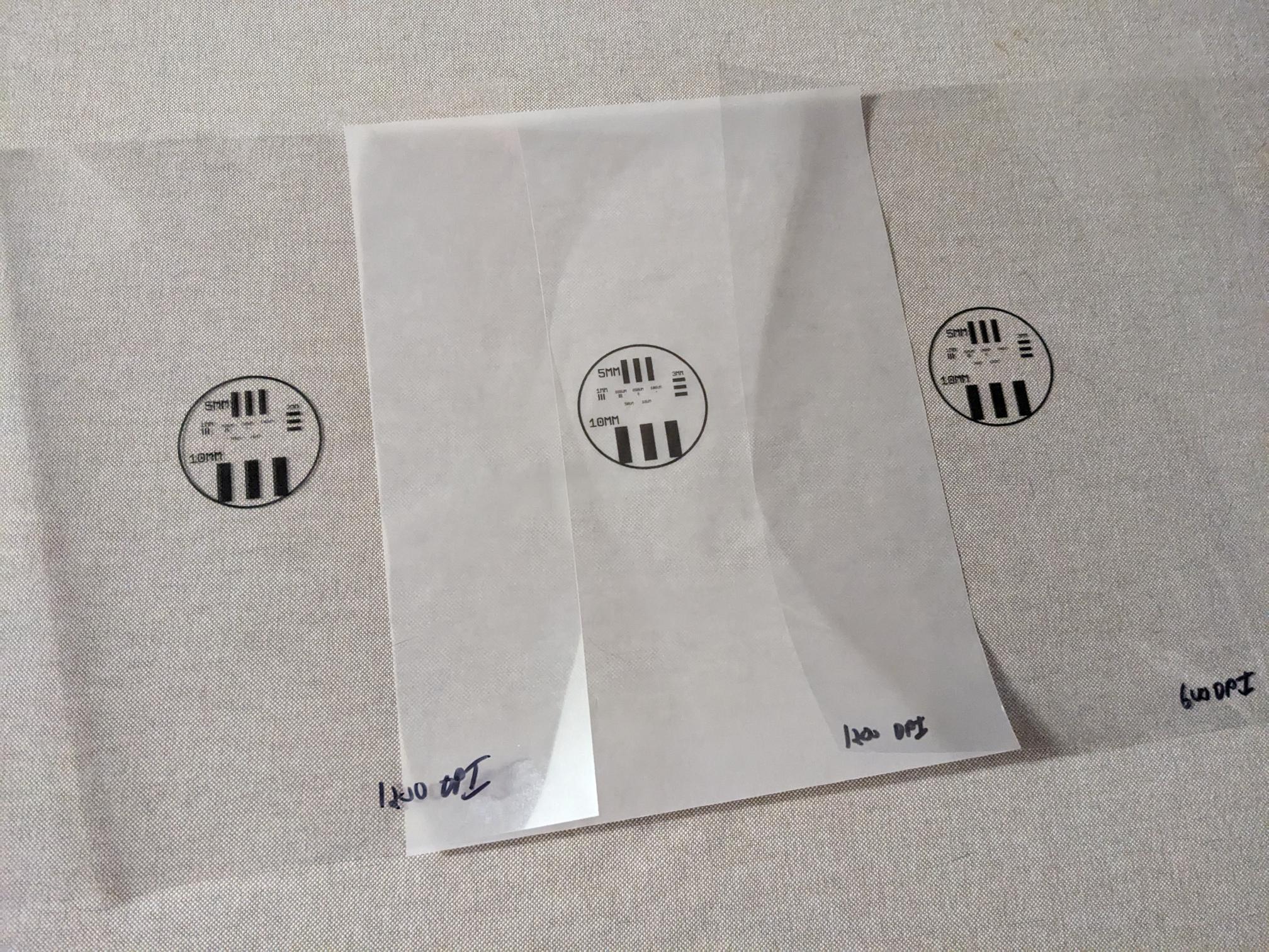 In order to test my device, I needed material that I could make shadow masks with. From my experience working in semiconductors, I knew of a material called Mylar which is often used for this type of crude mask work. Sadly, it is very expensive and is not offered in large enough sheets that I could run through a printer. Instead, I ended up just buying a cheap set of transparent 8.5x11 sheets off Amazon. I did see some forum notes online that people suggested using vellum paper, which I was skeptical of but I still ordered 8.5x11 vellum paper off Amazon as well because it was ~$10. When they arrived, I started by printing multiple test masks of a layout I made in a common mask making software called KLaout. My design contained a bunch of different sized lines in a 2in footprint so I could see what the resolution of my tool would be. I used two different print settings, 600 dpi (dots per inch) and 1200 dip, and I printed the design on both vellum paper and the transparent sheets.