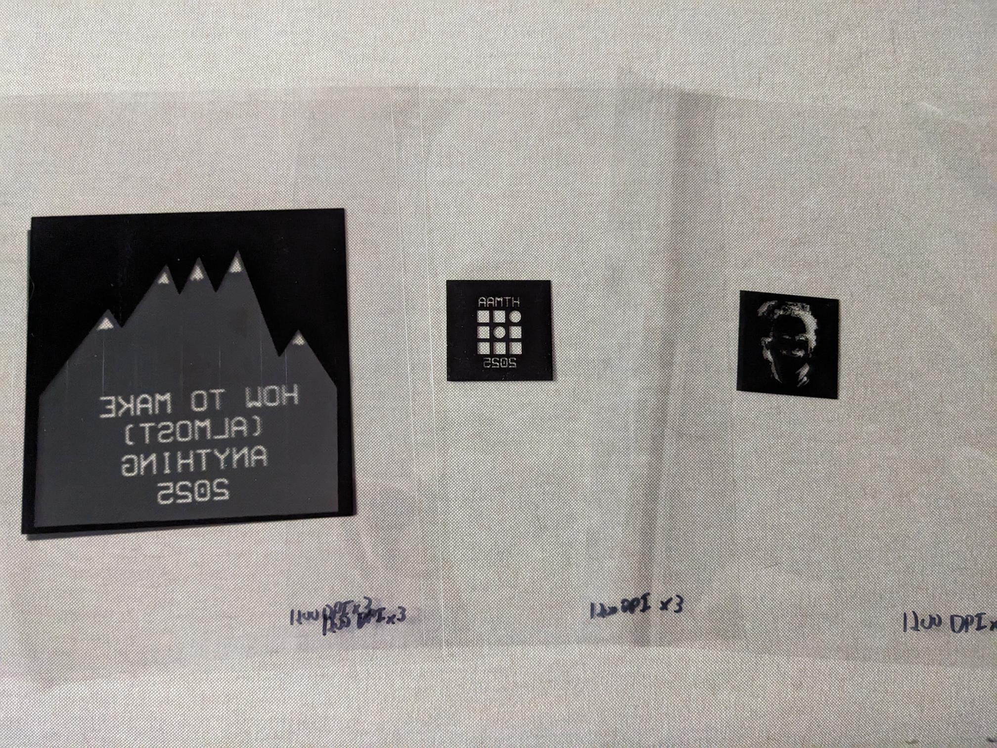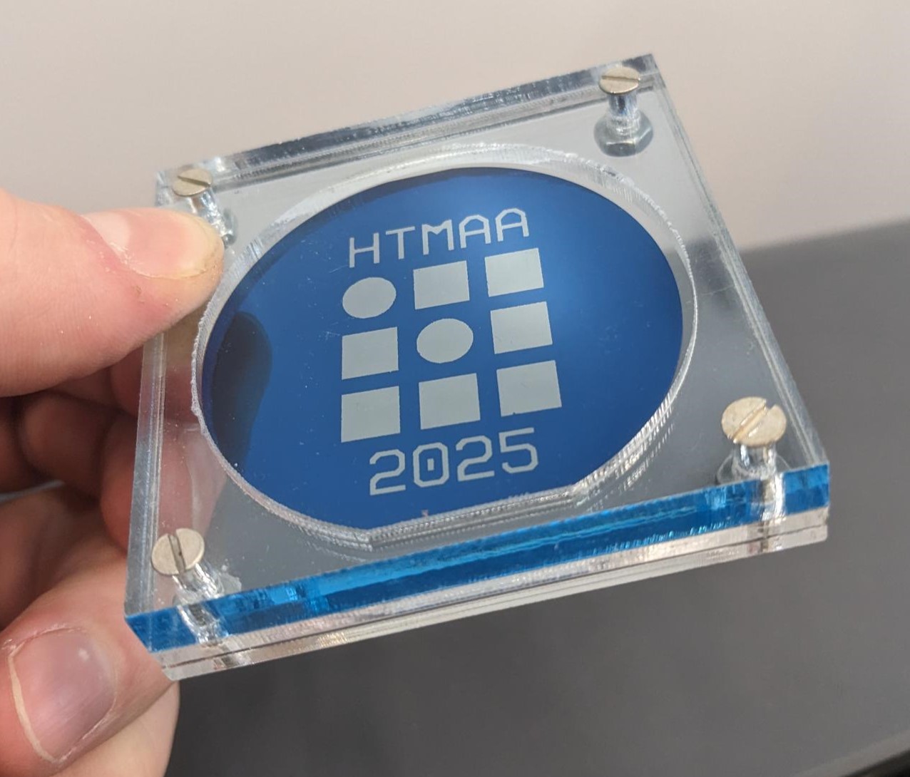 I could not find a better printer in the short time I had left to test, but I did run my new masks through my printer a number to times to try and minimize any gaps between the pixels. I did need to make sure that I was printing my masks reversed though in order to account for having the print side down however, but that was not hard to do. I printed a mask with the CBA logo and "HTMAA 2025", a two-tone image of Neil, and two patterns that could be aligned to one another to make mountains with a snow peak at the top. I did not actually make the mountain wafer because that would require a 6in wafer and additional processing I did not have access to, but the individual wafers came out great! Sadly I didn't take a direct picture of Neil's wafer which came out just okay, but it is in the overall picture of my table setup during our final presentations. I did put the wafers in acrylic cases cut on the XTool P2 to protect them from breaking and from dust.
