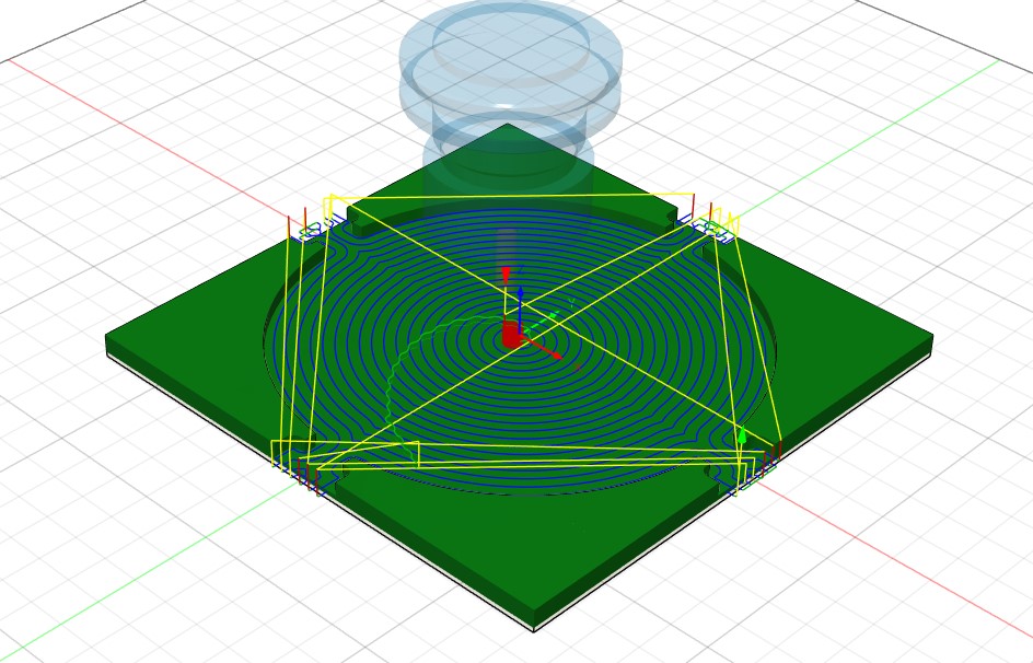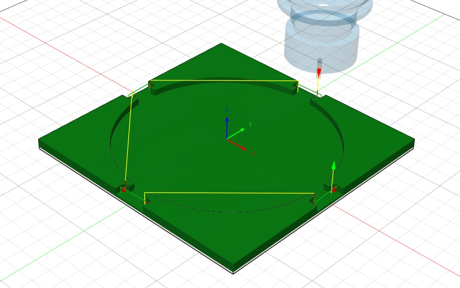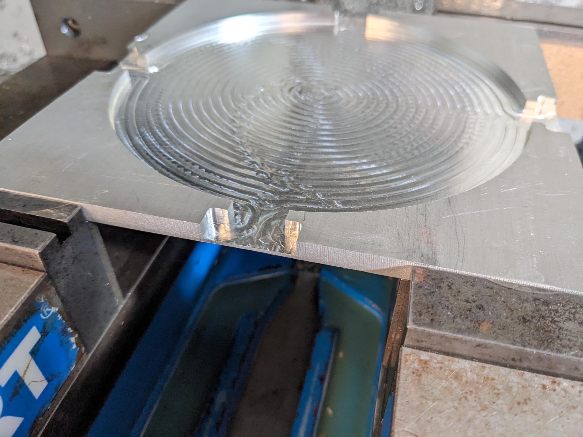 Running both cuts was super simple, the first job took about 20min to complete and the touch up with the 1/8in end mill took only a few minutes. The difference in the resulting corners is actually quite noticeable when trying to look for it (1/4in cut is on the left, 1/8in cut is on the right). There is a very slight texture that can be felt from the 1/4in cut, so I think that if I were actually trying to get one of these plates to be as precise as possible I would significantly lower the stepover distance to make sure I get a really flat cut for the wafer to seat perfectly on.