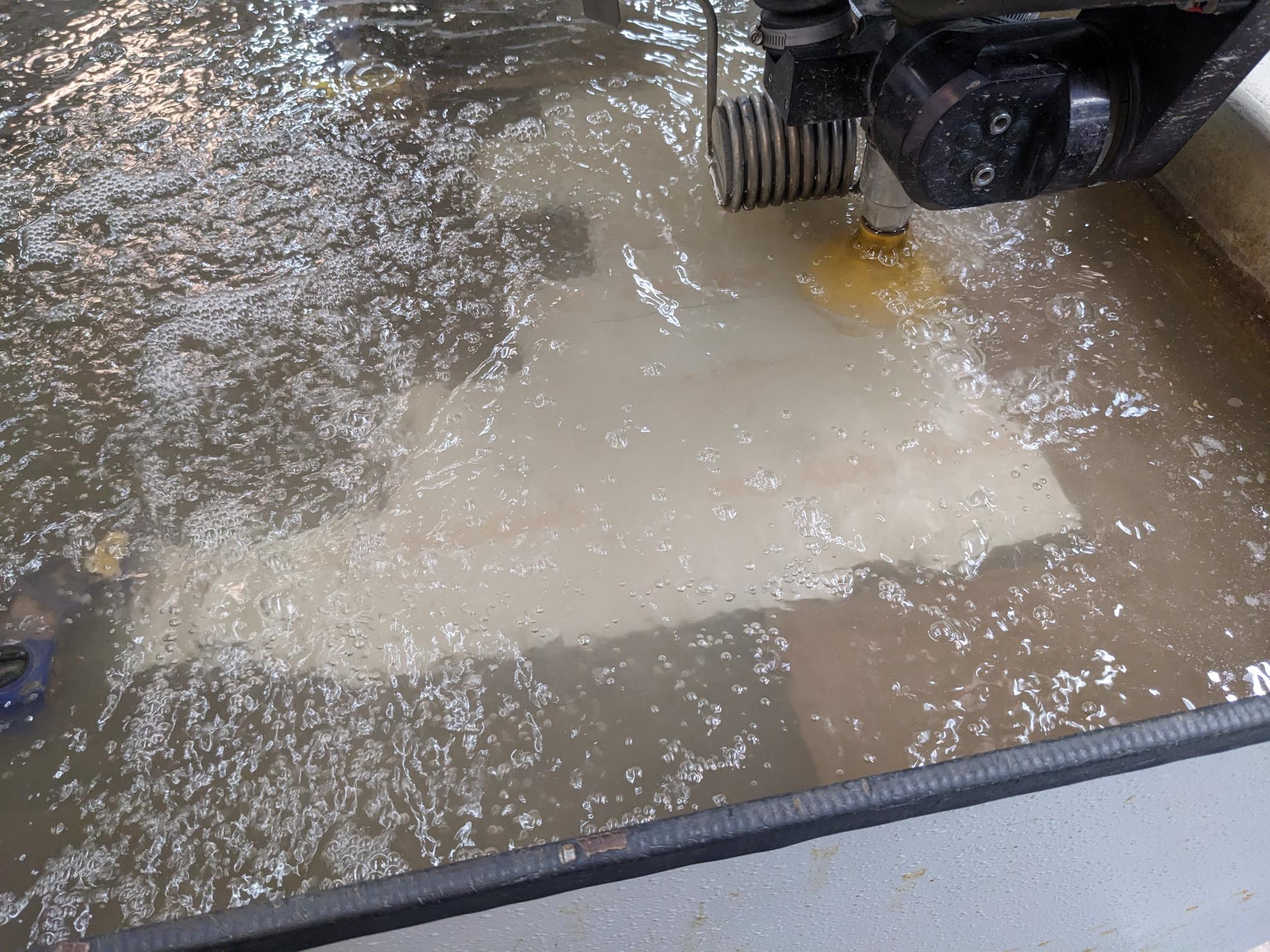 I chose to make my base plate out of aluminum so that it would be more sturdy than acrylic when it comes to supporting everything mounted to it. There are also a few pockets that would be cut into it that I want to be rigid and they would be exposed to UV light, so it made sense to go with a metal. Luckily, Dan showed me a 1/4in thick plate that was about to be scrapped that nearly fit my dimensions perfectly. We determined it would be best to make the initial cuts on the water jet first to get the footprint and any through holes needed, before going to milling. I exported a DXF of the back side of the plate so only the through holes and outside footprint would be captured, and then set up the job on the water jet. I had water jet a few parts before, but this was very simple to start. We clamped it down outside the expected path of the nozzle, set the file, selected a starting position, and zeroed the XYZ coordinates of the tool. Then it ran really smoothly and clean up at the end was simple enough!