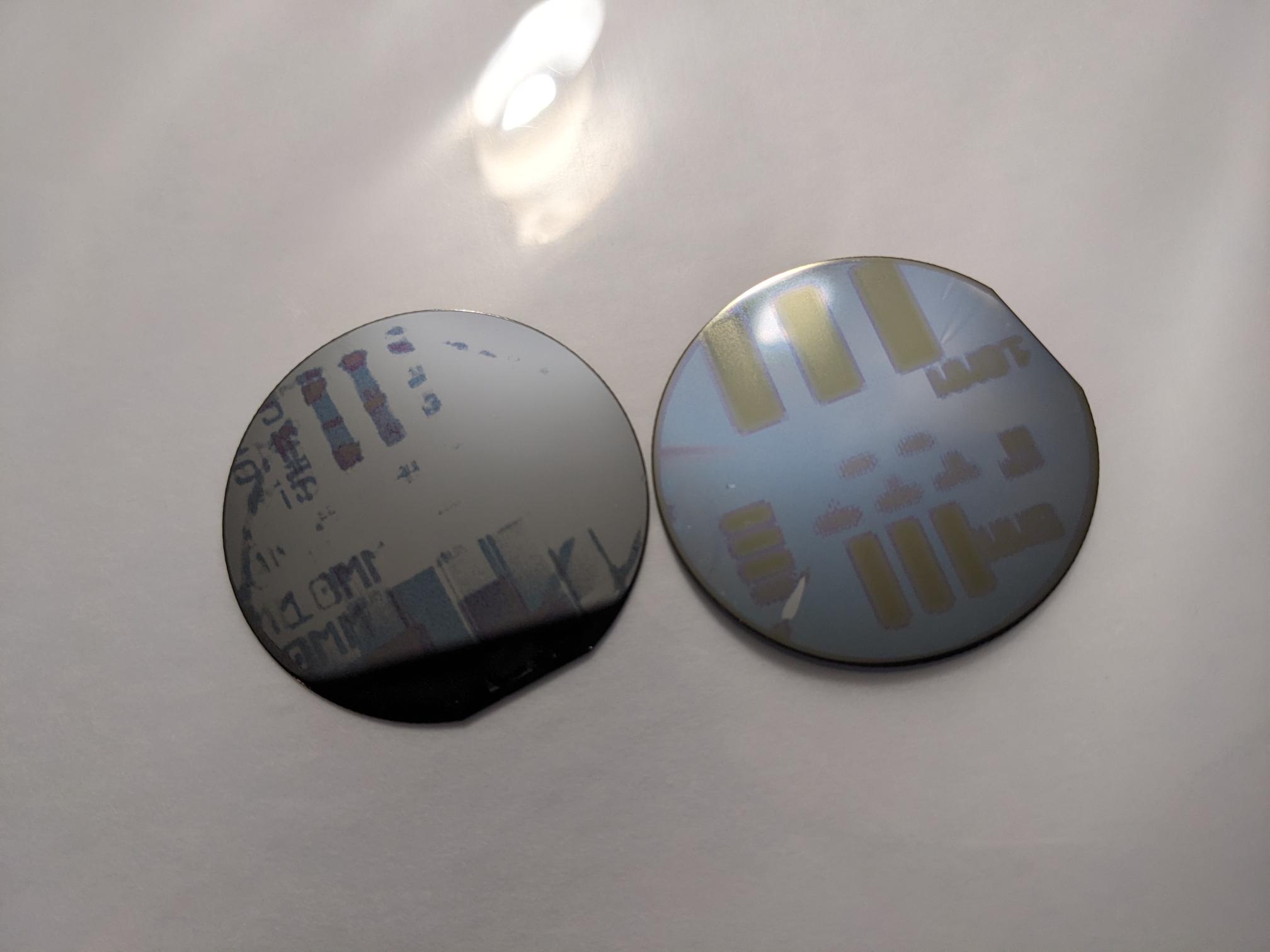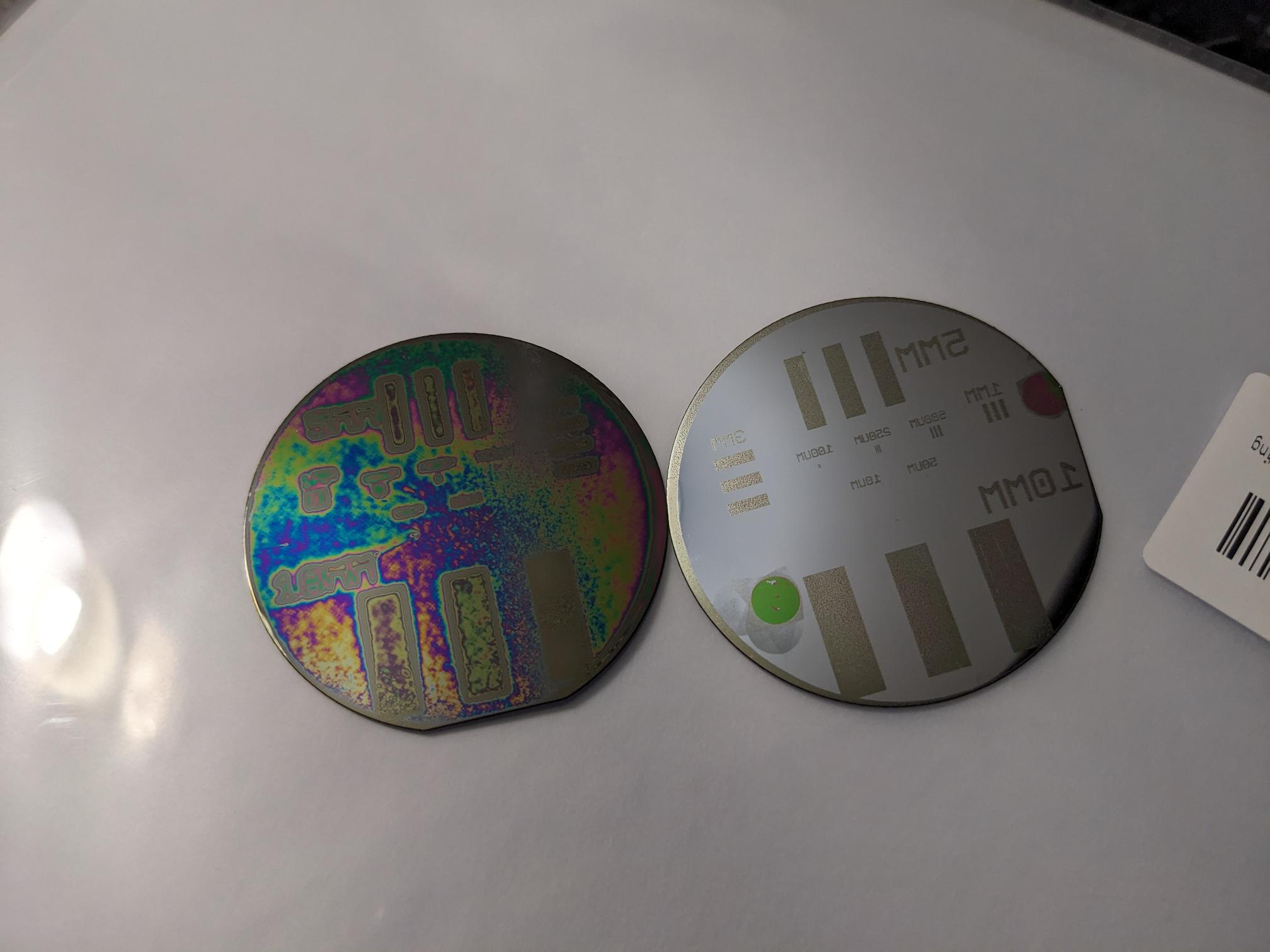 There are a lot of parameters that can be used for lithography, so I simplified my resist process by using the same resist and always spinning it up at 3000rpm. I used the same post apply bake of 110 Celcius for 60 seconds for each run, and experimentally found that a post exposure bake of 110C for 60s was also beneficial. The development process used a .26 normal TMAH developer, but I developed my patterns until they were mostly or completely resolved rather than developing for a set period of time. The variables I then had to play with was how I used the mask and what my exposure power was (I chose to expose for 60s on each run). The first wafer I tried surprisingly did create a pattern, just not a good one. I was honesty a little worried that I wouldn't be able to get anything to print whatsoever, so this was a really good proof of life for my tool! Looking at the pattern I found that each individual LED created a slightly different version of the pattern on the wafer, meaning I would not be able to do projection lithography with how my LEDs were set up. I then tried an exposure with my wafer in contact with the film which worked better, but even the thickness of the transparent sheet caused some blurring around the edges of the 10mm features. At this point I also tried exposing with the vellum paper, but I was unable to even clear the resist so I decided I was not going to both much with it going forward. The most successful test came from flipping my transparent mask around so the printed surface was face down on the wafer, with is the rightmost wafer in the images below. It looks like the pattern transferred very well, and upon inspecting both the mask and the wafer I found that I was actually being held back by the quality of my printer. I was using an old ink jet printer, which means that the ink gets sprayed onto the surface of my sheet but it does not absorb into the material the same way it would with normal paper. As such, looking at one of my masks closely showed there are very small gaps in the printed surface which is allowing some light through and is messing with the quality of my print.