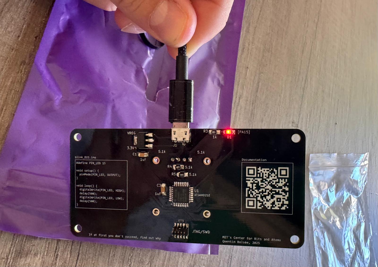 After a great intro, I decided to assemble the QPad21 (ATSAMD21) , a custom ATSAMD21E board designed by Quentin. The components required included: USB micro-B connector, 3.3V regulator + capacitors, 10-pin SWD header, Resistors, LED screen. For assembly I used a soldering iron, flux, and tweezers – ended up not using hot air and solder paste.