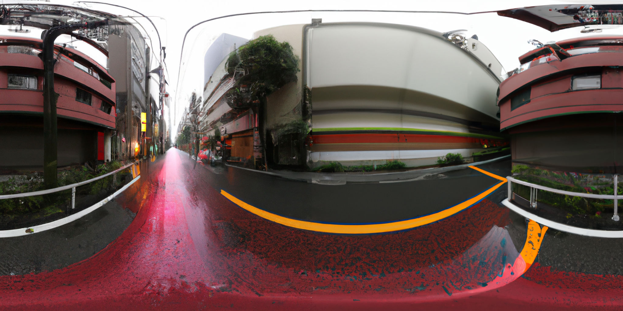 The image of choice is an AI generated street view panorama image of Tokyo. The model I use is DALL-E 2, which is quite antiquated at this point. I wrote the panorama stitching pipeline in a previosu project called diffused city (a geogussr for AI generated street view panoramas). Here's the image I used in my previous project.