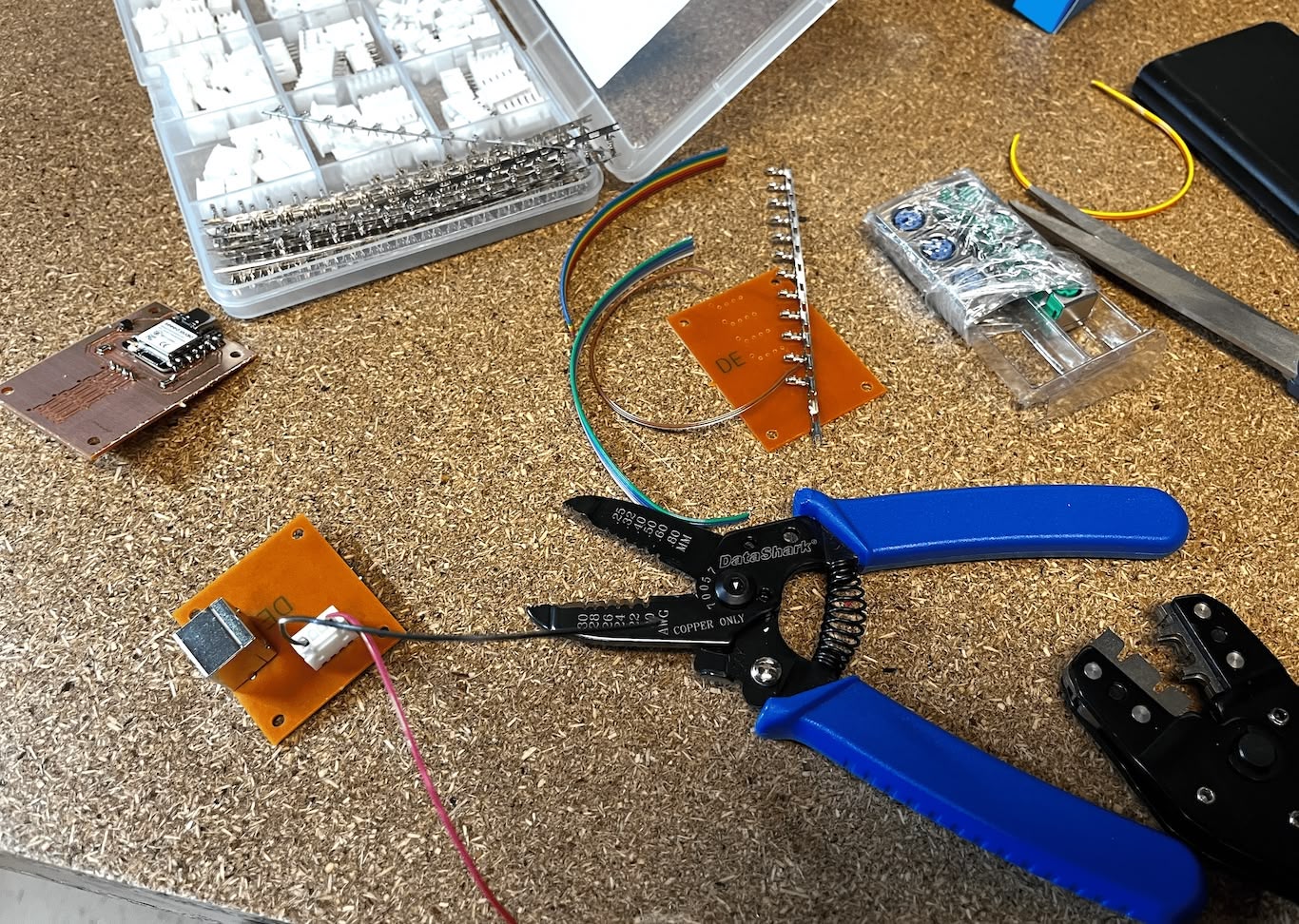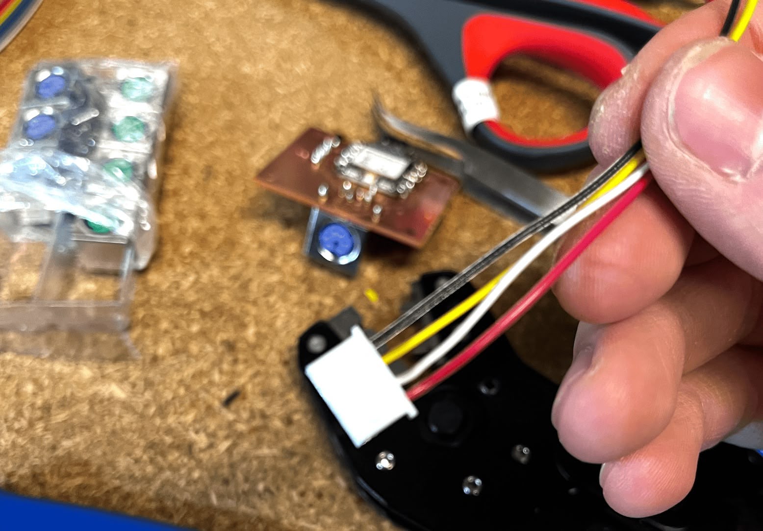 I used a wire stripper and crimper from a kit I bought on Amazon, along with ribbon cables from the fab inventory.