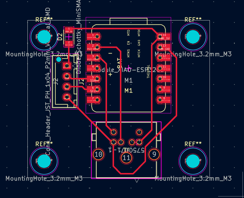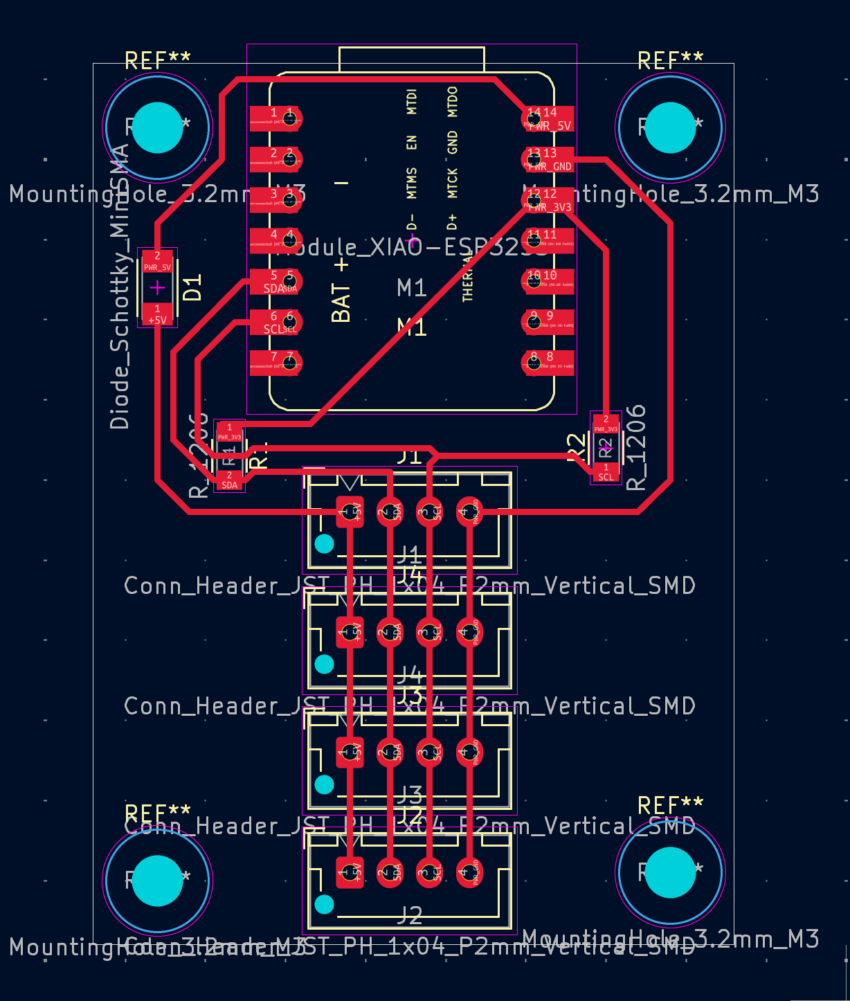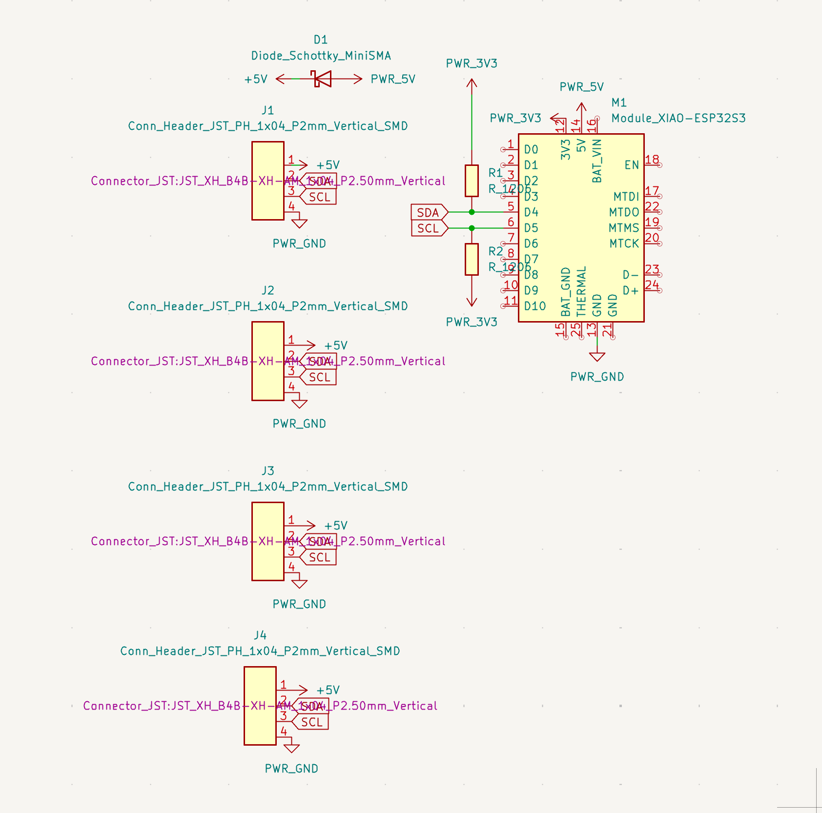 To ensure reliable I2C communication, I included 4.99kΩ pull-up resistors on the SDA and SCL lines, connecting them to the 3.3V rail. Each JST connector also has a designated slot for a diode, offering optional power protection.
