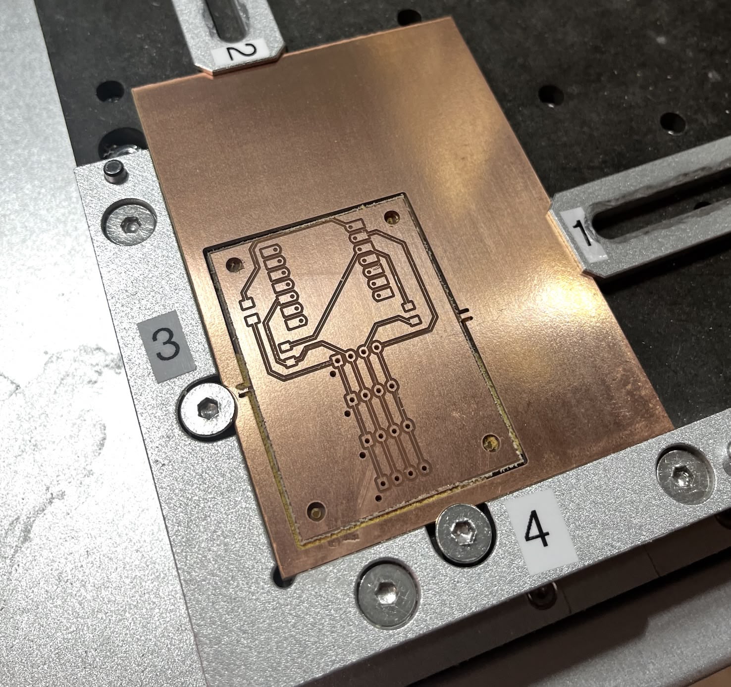 To mill the PCB, I utilized the black and white images generated from the Gerber files using Gerber2Img, a tool made by Quentin Bolsée and Jake Read at the MIT Center for Bits and Atoms (2023). I then generated the toolpaths for the Carvera machine using Mods, a browser-based CAM tool.