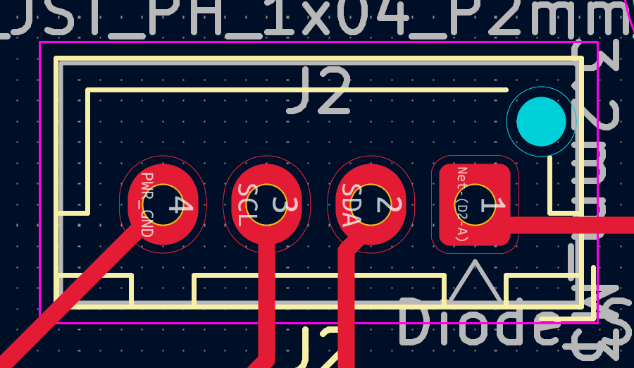 Although the HTMAA inventory includes symbols for JST connectors, the associated footprints did not match my XH series connector. I located the correct footprint in KiCad's connector library: Connector_JST:JST_XH_B4B-XH-AM_1x04_P2.50mm_Vertical.