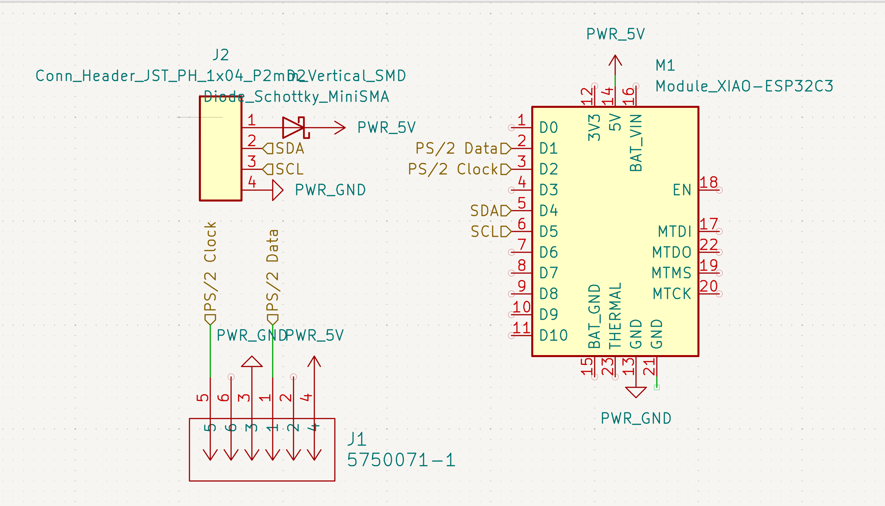 The schematic design is quite straightforward. I assigned GPIO 2 and GPIO 3 for SDA and SCL communication, respectively. I used GPIO 3 for PS/2 Data and GPIO 4 for PS/2 Clock. Additionally, I included a Schottky diode at the JST power input to indicate that this module serves as an input device and to prevent potential reverse power flow.