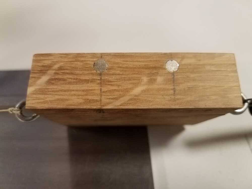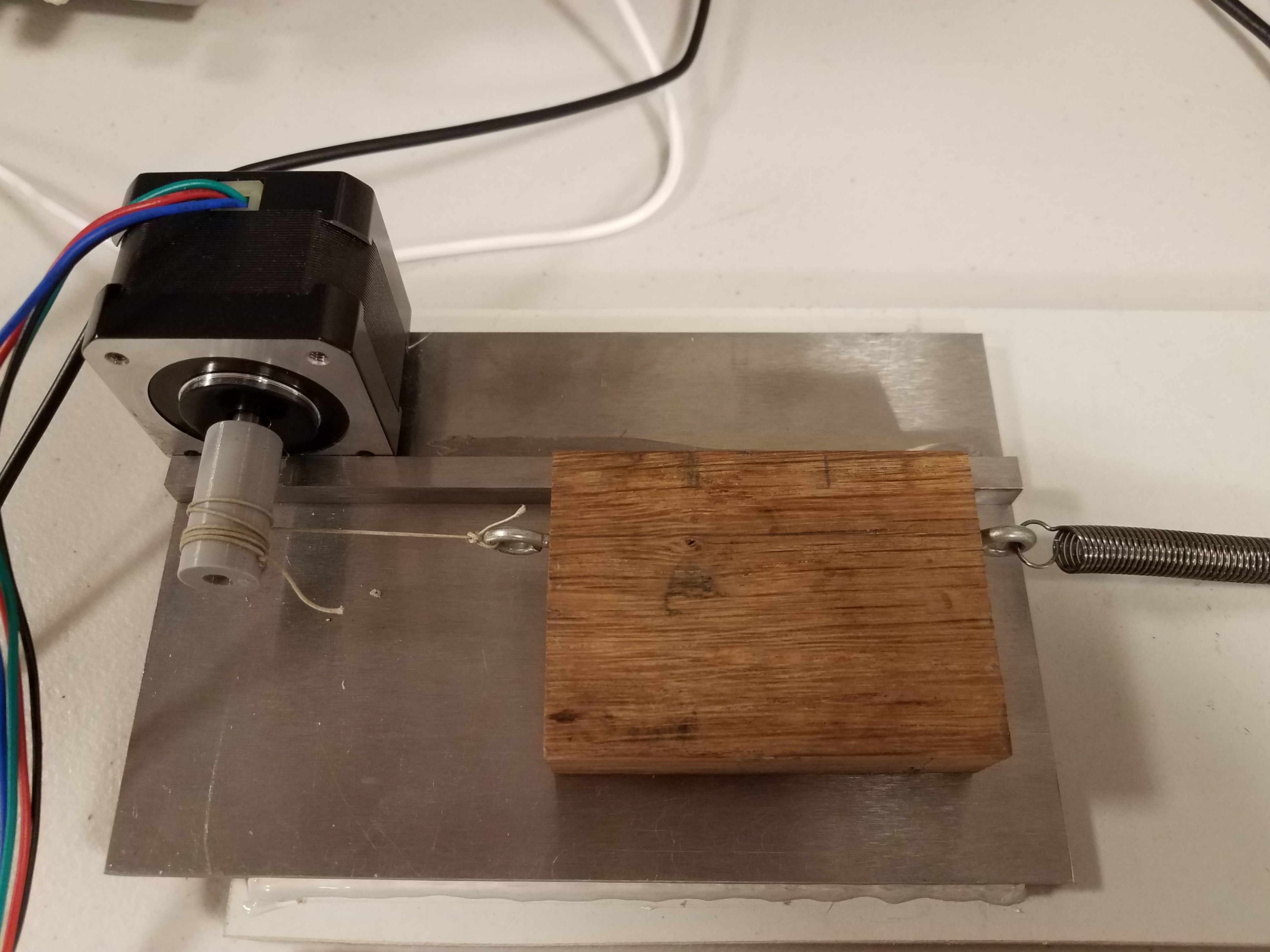 Wood block sliding on flat stock parts. Spring provides varying load to oppose motor string tension and prevent backlash. Cable is nylon - steel will be stiffer. Magnets provide y-preload. Downward component of string and spring force provide z-preload.