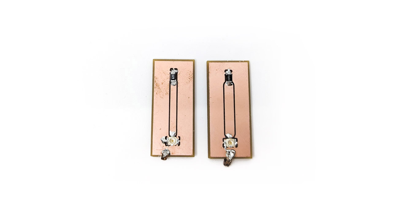 Either way, the reflection loss is low: -20 dB around the frequencies of interset. After finding a more accurate estimate of $\epsilon_{\rm eff}$, I decided to change the length to 22.65 mm. Rather than make another terminated line, I made a two-port device that transforms the signal to $75~\Omega$, and back to $50~\Omega$: