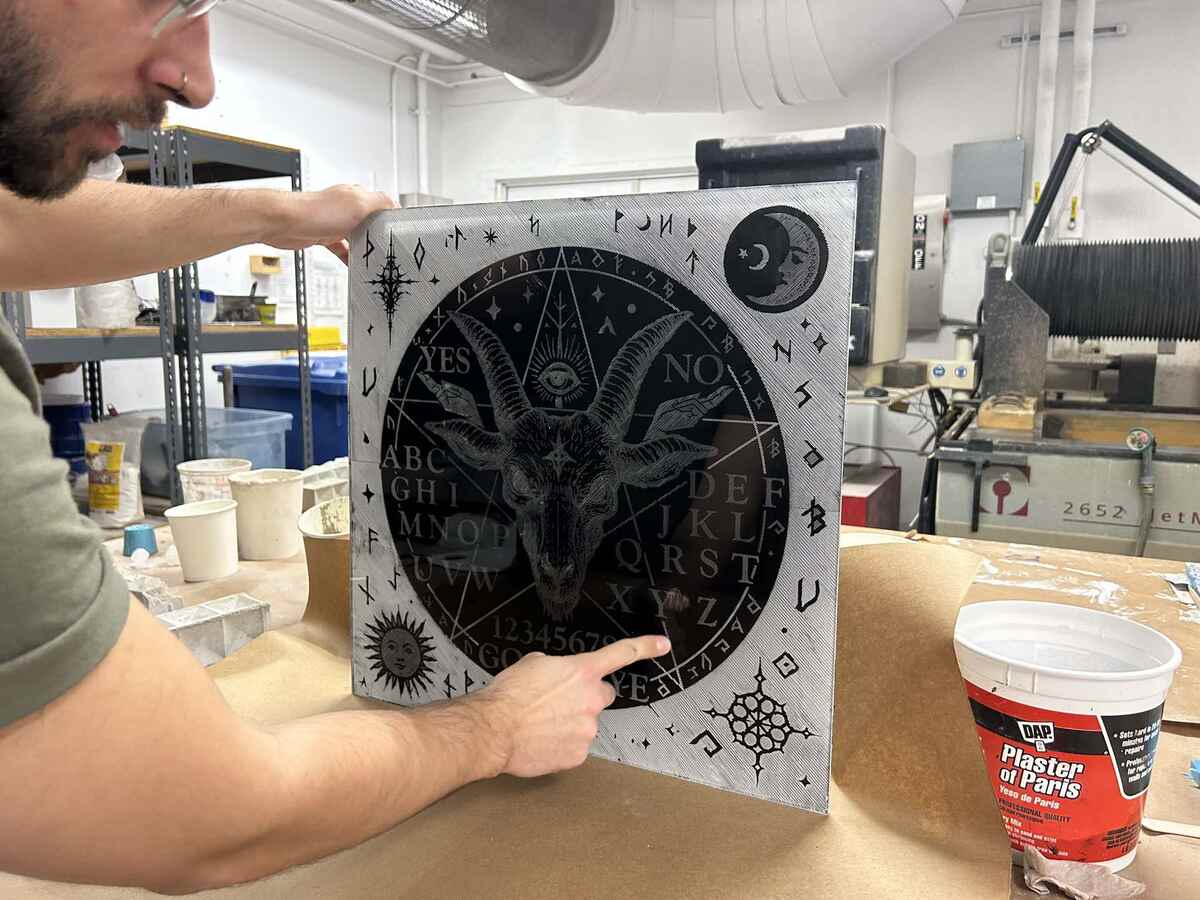The board team focused on the visual language of the Ouija surface: typography, symbols, layout, and how the planchette reads letters as it moves. The goal was to create an engraved board that feels both legible and unsettling, tying together the cursor, candles, and table as a single graphic composition.