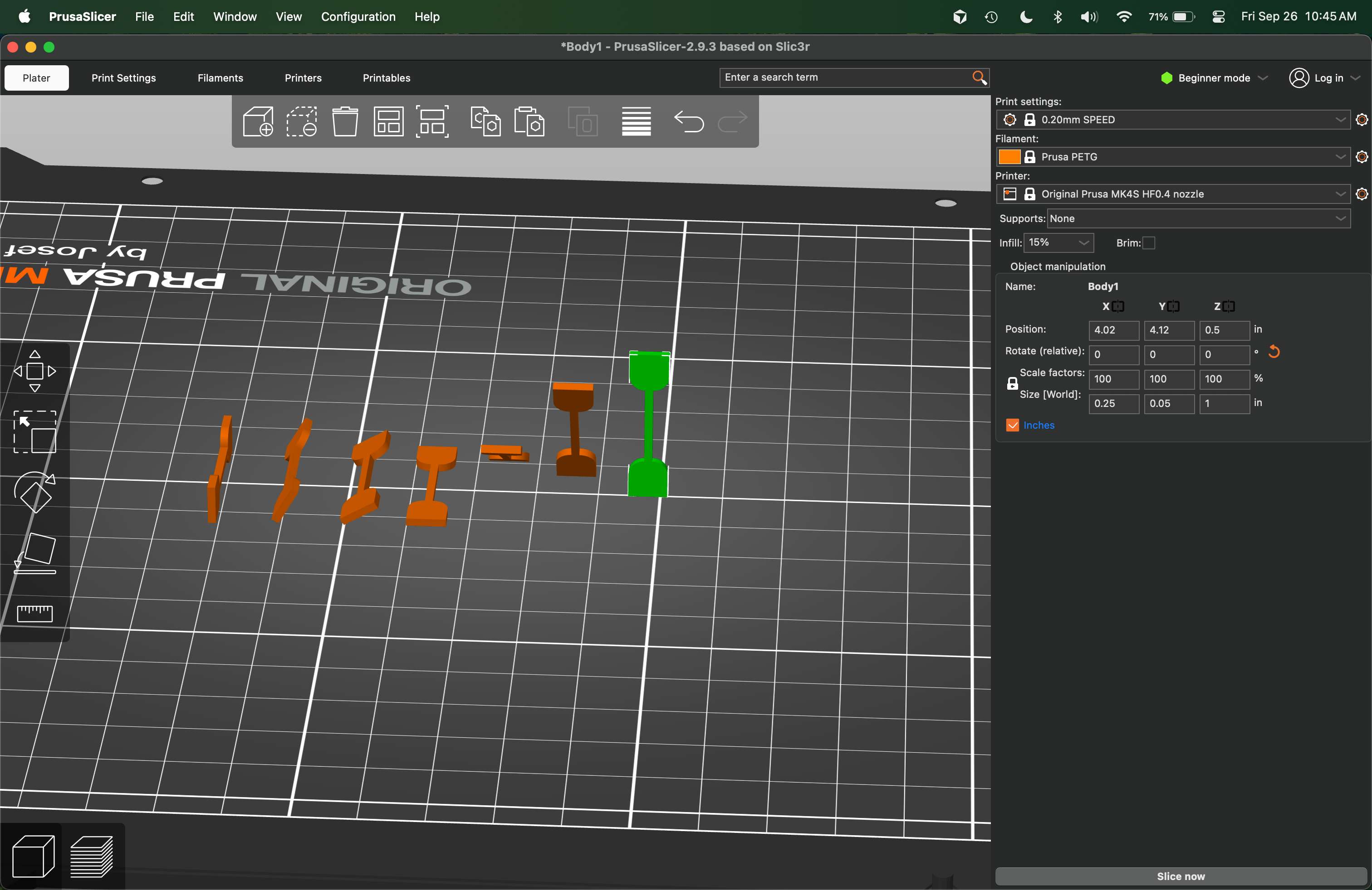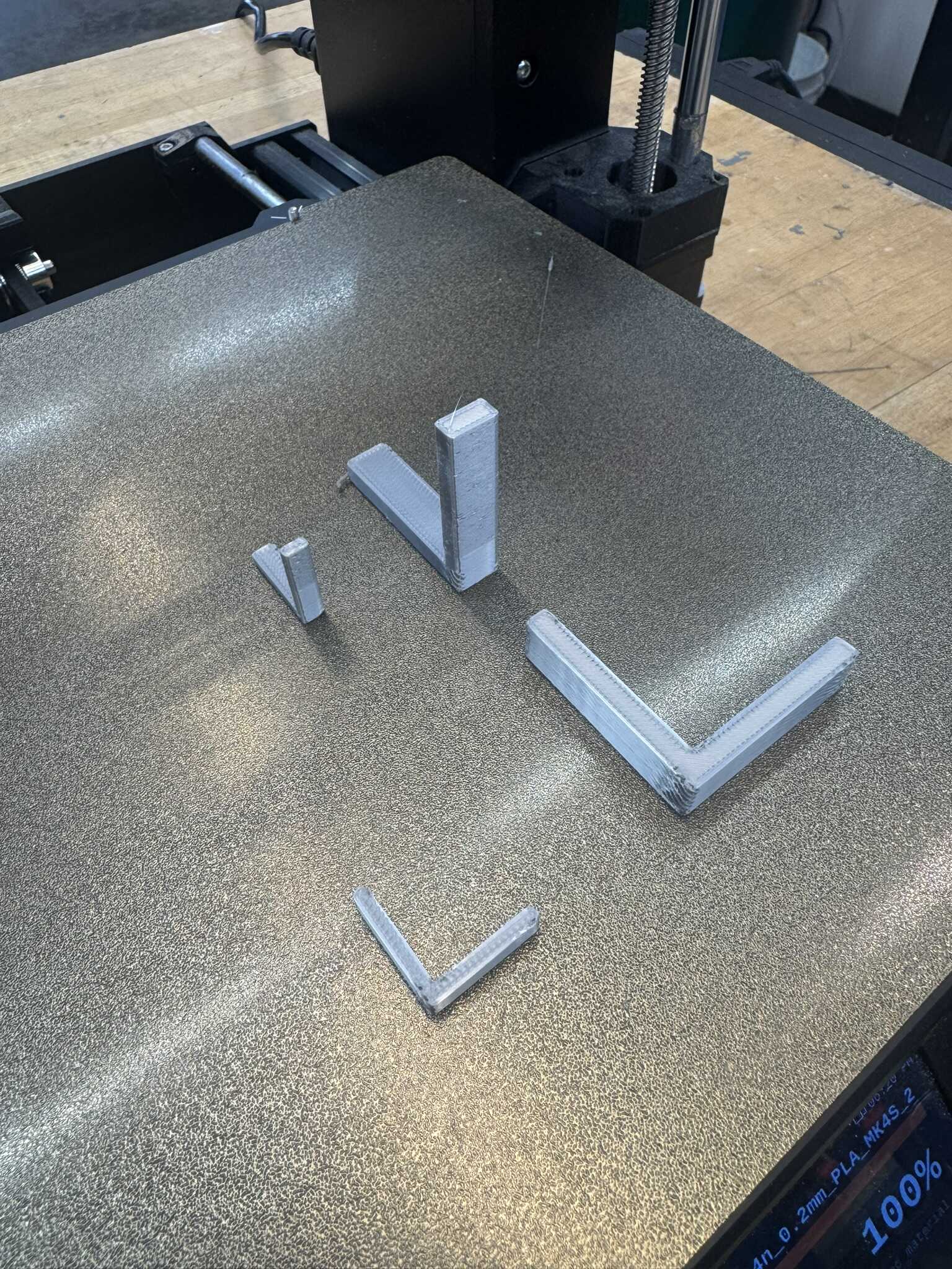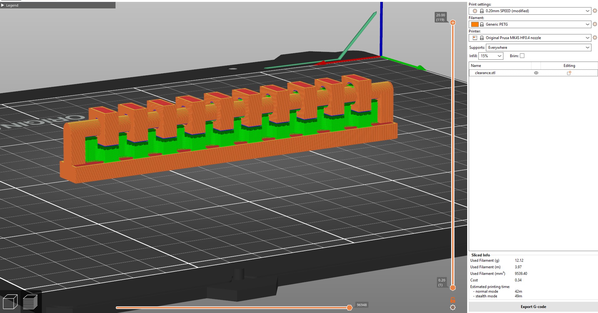 In order to test the capabilities of the printers, I started with the files provided on the class site. In this section I printed and tested the angle and clearance files on Prusa MK4S printers with 1.75mm PETG filament. I left the settings on default values for the PrusaSlicer software: 0.20mm SPEED, generic PETG, HF0.4 nozzle, and 15% infill.