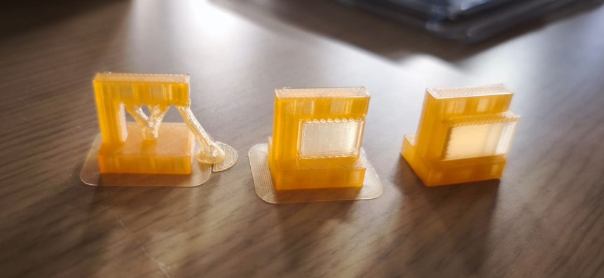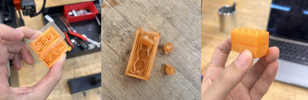 We also tested printing two LEGO blocks and stacking them. While it was somewhat difficult to remove the support material, the blocks snap-fitted successfully once assembled.